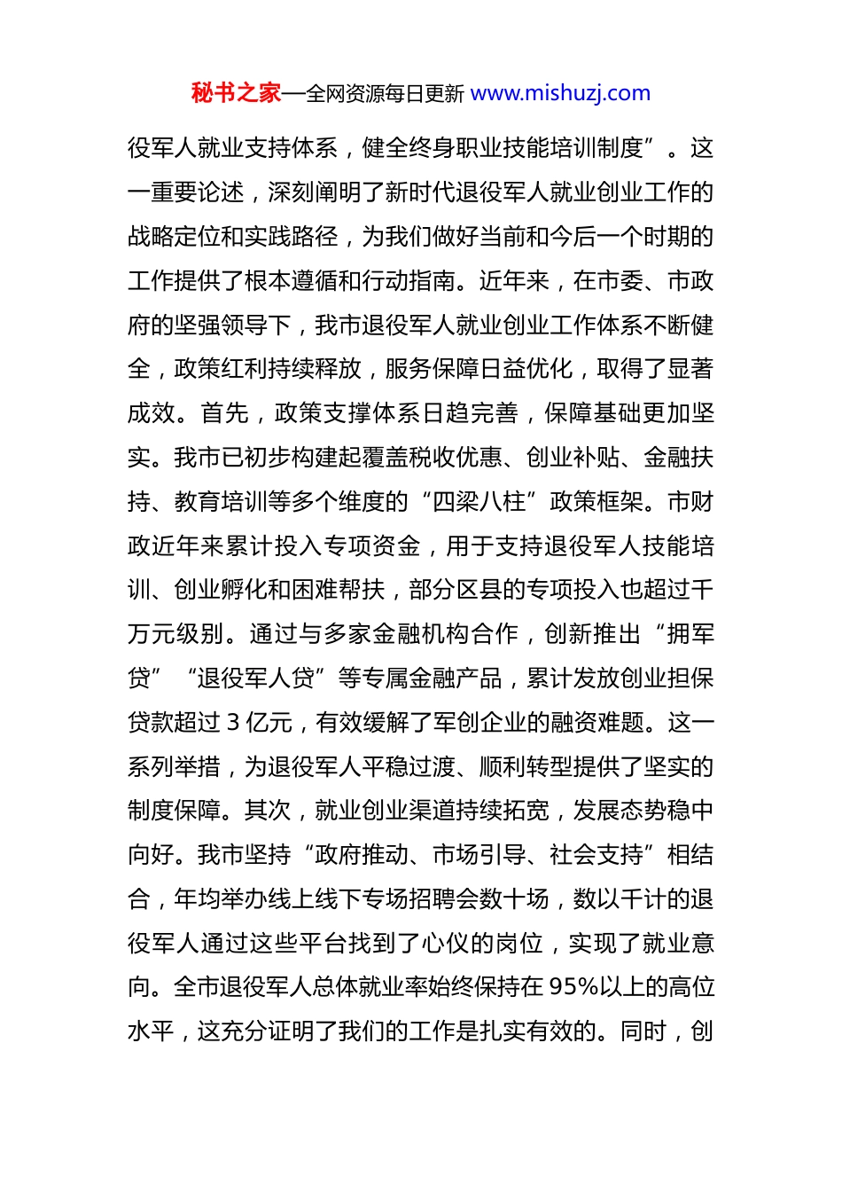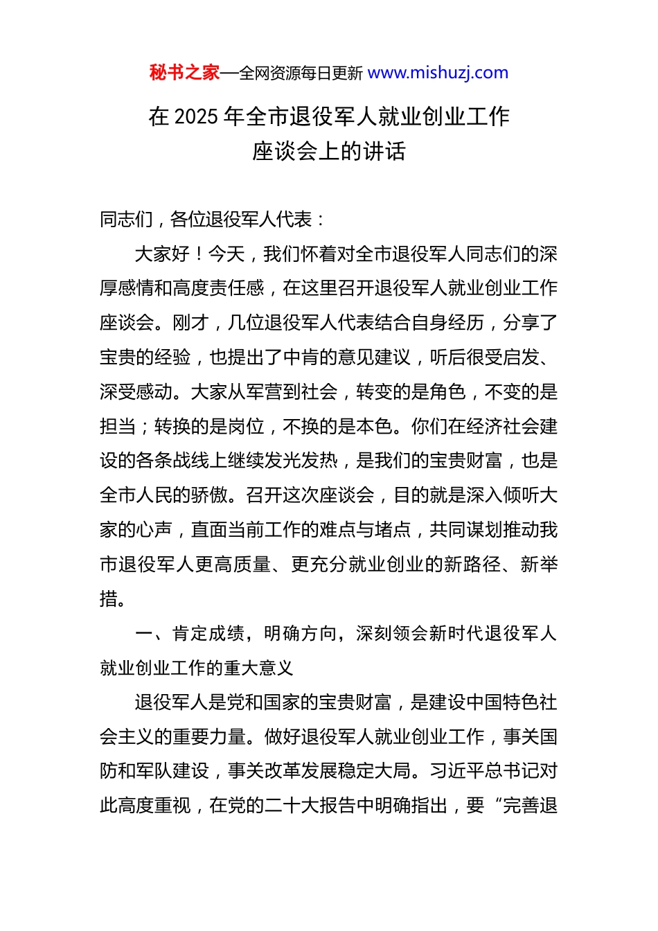 秘书之家—全网资源每日更新 www.mishuzj.com在 2025 年全市退役军人就业创业工作座谈会上的讲话 同志们,各位退役军人代表:大家好!今天,我们怀着对全市退役军人同志们的深厚感情和高度责任感,在这里召开退役军人就业创业工作座谈会。刚才,几位退役军人代表结合自身经历,分享了宝贵的经验,也提出了中肯的意见建议,听后很受启发、深受感动。大家从军营到社会,转变的是角色,不变的是担当;转换的是岗位,不换的是本色。你们在经济社会建设的各条战线上继续发光发热,是我们的宝贵财富,也是全市人民的骄傲。召开这次座谈会,目的就是深入倾听大家的心声,直面当前工作的难点与堵点,共同谋划推动我市退役军人更高质量、更充分就业创业的新路径、新举措。一、肯定成绩,明确方向,深刻领会新时代退役军人就业创业工作的重大意义退役军人是党和国家的宝贵财富,是建设中国特色社会主义的重要力量。做好退役军人就业创业工作,事关国防和军队建设,事关改革发展稳定大局。习近平总书记对此高度重视,在党的二十大报告中明确指出,要“完善退秘书之家—全网资源每日更新 www.mishuzj.com役军人就业支持体系,健全终身职业技能培训制度”。这一重要论述,深刻阐明了新时代退役军人就业创业工作的战略定位和实践路径,为我们做好当前和今后一个时期的工作提供了根本遵循和行动指南。近年来,在市委、市政府的坚强领导下,我市退役军人就业创业工作体系不断健全,政策红利持续释放,服务保障日益优化,取得了显著成效。首先,政策支撑体系日趋完善,保障基础更加坚实。我市已初步构建起覆盖税收优惠、创业补贴、金融扶持、教育培训等多个维度的“四梁八柱”政策框架。市财政近年来累计投入专项资金,用于支持退役军人技能培训、创业孵化和困难帮扶,部分区县的专项投入也超过千万元级别。通过与多家金融机构合作,创新推出“拥军贷”“退役军人贷”等专属金融产品,累计发放创业担保贷款超过 3 亿元,有效缓解了军创企业的融资难题。这一系列举措,为退役军人平稳过渡、顺利转型提供了坚实的制度保障。其次,就业创业渠道持续拓宽,发展态势稳中向好。我市坚持“政府推动、市场引导、社会支持”相结合,年均举办线上线下专场招聘会数十场,数以千计的退役军人通过这些平台找到了心仪的岗位,实现了就业意向。全市退役军人总体就业率始终保持在 95%以上的高位水平,这充分证明了我们的工作是扎实有效的。同时,创秘书之家—全网资源每日更新 www.mishuzj.com业活力竞相迸发。全市涌现出一大批科创企业和创业典型,他们在高新技术、现代农业、智能制造、生活服务等多个领域开疆拓土,成为推动区域经济发展的一支重要力量。据不完全统计,我市由退役军人创办的市场主体已超过 9000 家,吸纳带动了大量社会就业。再次,先进典型示范效应凸显,社会尊崇氛围日益浓厚。在座的各位就是杰出代表,在全市范围内,这样的例子还有很多。有退役军人投身前沿科技,带领团队研发的“MR 全息应用训练系统”在全国创业创新大赛中斩获一等奖,实现了从“操纵钢枪”到“驾驭算法”的华丽转身。有退役军人扎根广袤乡村,流转土地百余亩发展现代种植园,年产值超过 120万元,并积极采用“公司+农户”模式,带领乡亲们共同致富,其直播带货月营业额高达 300 多万元,成为乡村振兴的“兵支书”和“领头雁”。更有退役军人企业家群体,在*区创办的企业集群年产值高达 27 亿元,年纳税额超过4200 万元,展现了惊人的经济能量和社会贡献。这些鲜活的案例,生动诠释了“退役不褪色、建功新时代”的铮铮誓言,也为广大退役军人树立了可学可赶的标杆。这些成绩的取得,离不开市委、市政府的正确领导,离不开各部门的通力协作,也离不开像*军创会这样的社会组织的桥梁纽带作用,更离不开像*网络有限公司等一大批有拥军情怀秘书之家—全网资源每日更新 www.mishuzj.com的企业的鼎力支持。在此,向所有关心支持退役军人事业的社会各界人士,表示衷心的感谢!二、正视挑战剖析短板,精准把握当前工作面临的现实问题在肯定成绩的同时,也必须清醒地认识到,对照新形势新任务的要求,对标广大退役...