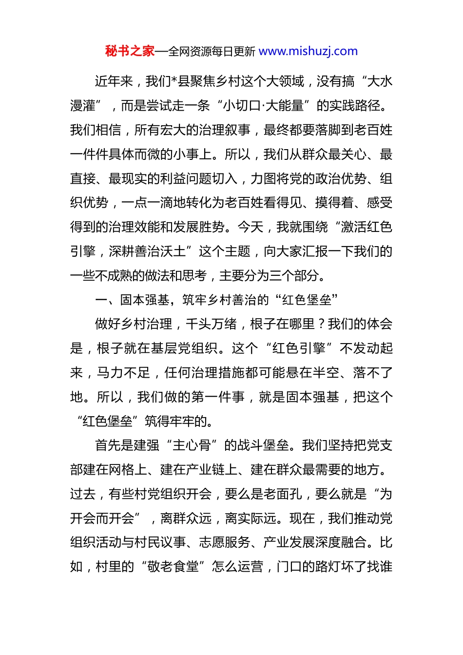 秘书之家—全网资源每日更新 www.mishuzj.com在 2025 年全县社会工作系统经验交流会上的发言 同志们,朋友们:大家下午好!非常荣幸能有这样一个机会,站在这里,和来自兄弟单位的各位同仁、各位专家,一起探讨交流乡村治理这个课题。说“授课”实在是愧不敢当,更多的是一次“汇报”和“分享”。*县在乡村治理方面做了一些探索,取得了一点微不足道的成绩,但更多的是在实践中不断摸索、不断修正的过程。今天,我就是来抛砖引玉的,希望能听到大家的真知灼见,给我们传经送宝。大家都知道,乡村是国家治理体系的“神经末梢”,这话说得非常形象。神经末梢虽小,但它感知冷暖、传递信号,直接关系到整个身体的健康与活力。我们*县有 54个行政村,农村人口占全区总人口的比例不小。这片广袤的田野,是我们最具活力、最富潜力,也最需要我们去精耕细作的“希望田野”。如何让这每一个“神经末梢”都充满活力、反应灵敏、健康强韧,是我们社会工作部门必须答好的一道时代考题。秘书之家—全网资源每日更新 www.mishuzj.com近年来,我们*县聚焦乡村这个大领域,没有搞“大水漫灌”,而是尝试走一条“小切口·大能量”的实践路径。我们相信,所有宏大的治理叙事,最终都要落脚到老百姓一件件具体而微的小事上。所以,我们从群众最关心、最直接、最现实的利益问题切入,力图将党的政治优势、组织优势,一点一滴地转化为老百姓看得见、摸得着、感受得到的治理效能和发展胜势。今天,我就围绕“激活红色引擎,深耕善治沃土”这个主题,向大家汇报一下我们的一些不成熟的做法和思考,主要分为三个部分。一、固本强基,筑牢乡村善治的“红色堡垒”做好乡村治理,千头万绪,根子在哪里?我们的体会是,根子就在基层党组织。这个“红色引擎”不发动起来,马力不足,任何治理措施都可能悬在半空、落不了地。所以,我们做的第一件事,就是固本强基,把这个“红色堡垒”筑得牢牢的。首先是建强“主心骨”的战斗堡垒。我们坚持把党支部建在网格上、建在产业链上、建在群众最需要的地方。过去,有些村党组织开会,要么是老面孔,要么就是“为开会而开会”,离群众远,离实际远。现在,我们推动党组织活动与村民议事、志愿服务、产业发展深度融合。比如,村里的“敬老食堂”怎么运营,门口的路灯坏了找谁秘书之家—全网资源每日更新 www.mishuzj.com修,这些过去可能需要层层上报的“小事”,现在就在党支部牵头的网格议事会上,由党员、村民代表、网格员坐在一起,七嘴八舌地就议了、定了、办了。党组织成了真正能解决问题的“主心骨”,威信自然就高了。其次是激活“领头雁”的先锋作用。一个优秀的村书记,就是一个强有力的引擎。我们特别注重选拔和培养那些有情怀、有能力、愿意为乡亲们办事的“能人”担任村干部。同时,我们给他们压担子,也给他们搭台子。县里每年都组织村书记到发达地区学习取经,开阔眼界。更重要的是,我们建立了一套清晰的激励和考核机制,干得好不好,不光是上级说了算,更要看老百姓的口碑和村子的实际变化。最后是锻造“红细胞”的响应能力。光有堡垒和头雁还不够,必须让每一个党员这个“红细胞”都动起来,把组织的活力输送到每一个“神经末梢”。我们全面推行党员联系户制度,每个党员负责联系几户群众,定期上门聊家常、听意见、解难题。谁家有困难,谁家有矛盾,党员要第一个知道,第一个站出来。这种“点对点”的联系,就像毛细血管一样,把党组织的关怀和温暖,精准地送到了群众心坎上。同时,这也是一个信息收集网络,村里的风吹草动、矛盾隐患,都能在第一时间被感知和上报,真秘书之家—全网资源每日更新 www.mishuzj.com正做到“小事不出村,大事不出乡”。总的来说,我们就是要把党建工作从“文件里”“会议上”,真正做到群众的“家门口”“心坎里”,让党旗在乡村治理的第一线高高飘扬。这个“红色堡垒”筑牢了,各项工作就有了坚强的政治保障和组织保障。二、精准滴灌,释放小切口撬动的“民生能量”有了坚强的组织基础,接下来就是怎么“干”的问题。我们的思路是,不求面面俱到,而是找准那些牵一发而动全身的“小切口”,用绣花功夫做深做透...