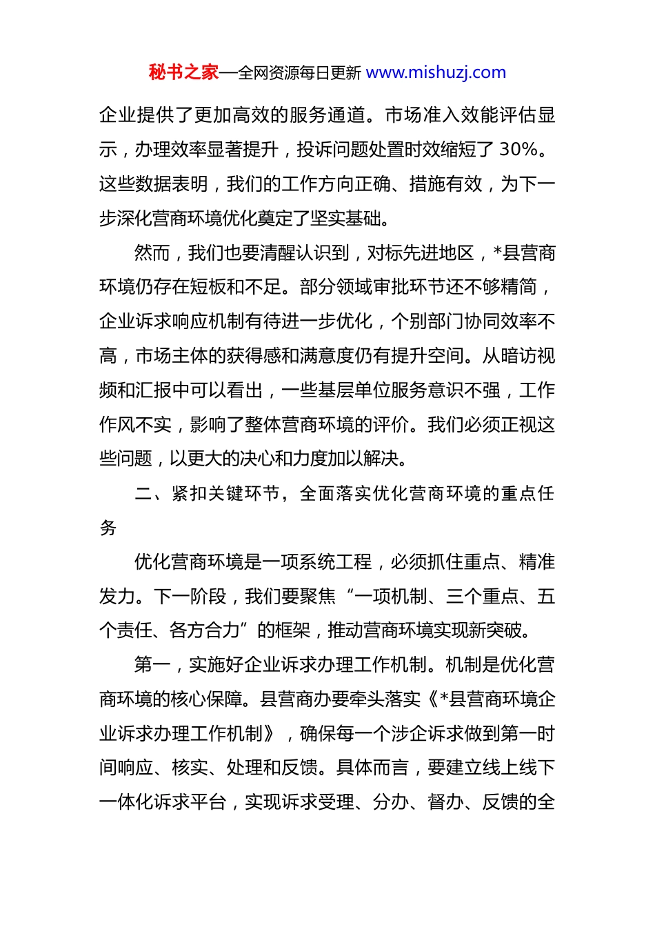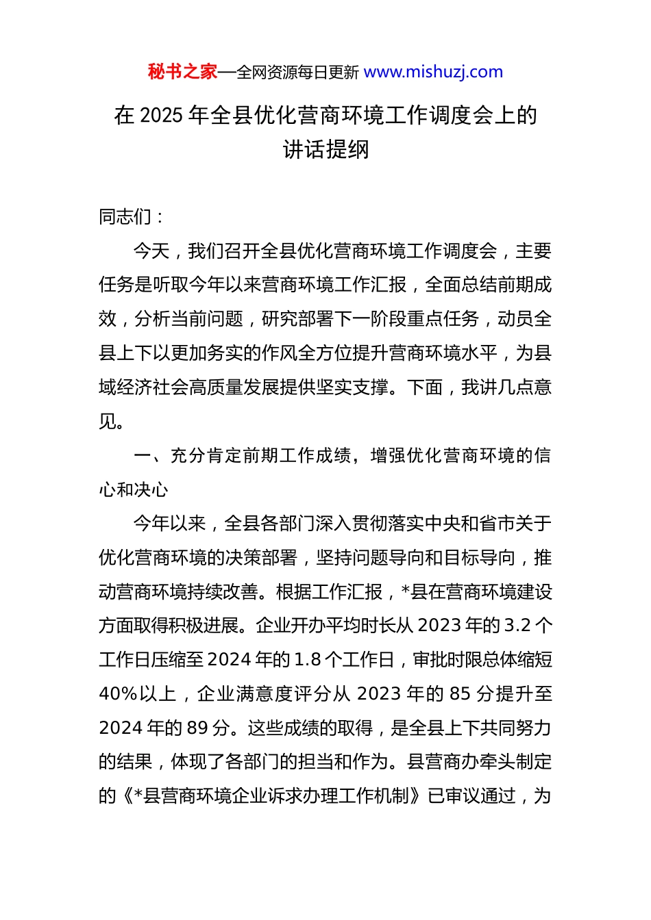 秘书之家—全网资源每日更新 www.mishuzj.com在 2025 年全县优化营商环境工作调度会上的讲话提纲 同志们:今天,我们召开全县优化营商环境工作调度会,主要任务是听取今年以来营商环境工作汇报,全面总结前期成效,分析当前问题,研究部署下一阶段重点任务,动员全县上下以更加务实的作风全方位提升营商环境水平,为县域经济社会高质量发展提供坚实支撑。下面,我讲几点意见。一、充分肯定前期工作成绩,增强优化营商环境的信心和决心今年以来,全县各部门深入贯彻落实中央和省市关于优化营商环境的决策部署,坚持问题导向和目标导向,推动营商环境持续改善。根据工作汇报,*县在营商环境建设方面取得积极进展。企业开办平均时长从 2023 年的 3.2 个工作日压缩至 2024 年的 1.8 个工作日,审批时限总体缩短40%以上,企业满意度评分从 2023 年的 85 分提升至2024 年的 89 分。这些成绩的取得,是全县上下共同努力的结果,体现了各部门的担当和作为。县营商办牵头制定的《*县营商环境企业诉求办理工作机制》已审议通过,为秘书之家—全网资源每日更新 www.mishuzj.com企业提供了更加高效的服务通道。市场准入效能评估显示,办理效率显著提升,投诉问题处置时效缩短了 30%。这些数据表明,我们的工作方向正确、措施有效,为下一步深化营商环境优化奠定了坚实基础。然而,我们也要清醒认识到,对标先进地区,*县营商环境仍存在短板和不足。部分领域审批环节还不够精简,企业诉求响应机制有待进一步优化,个别部门协同效率不高,市场主体的获得感和满意度仍有提升空间。从暗访视频和汇报中可以看出,一些基层单位服务意识不强,工作作风不实,影响了整体营商环境的评价。我们必须正视这些问题,以更大的决心和力度加以解决。二、紧扣关键环节,全面落实优化营商环境的重点任务优化营商环境是一项系统工程,必须抓住重点、精准发力。下一阶段,我们要聚焦“一项机制、三个重点、五个责任、各方合力”的框架,推动营商环境实现新突破。第一,实施好企业诉求办理工作机制。机制是优化营商环境的核心保障。县营商办要牵头落实《*县营商环境企业诉求办理工作机制》,确保每一个涉企诉求做到第一时间响应、核实、处理和反馈。具体而言,要建立线上线下一体化诉求平台,实现诉求受理、分办、督办、反馈的全秘书之家—全网资源每日更新 www.mishuzj.com流程闭环管理。各部门必须指定专人负责,确保 24 小时内响应初核,3 个工作日内办结简单诉求,复杂诉求不超过 7个工作日。机制的成功在于执行,我们要通过定期督查和通报,确保事事有回音、件件有着落,真正让企业感受到政府的效率和诚意。第二,紧盯好三个重点领域。围绕市场满意度、投诉问题处置和市场准入效能评估,持续发力,提升为企服务质效。在市场满意度方面,要开展常态化企业走访和问卷调查,针对反馈问题立行立改,力争 2024 年底满意度达到92%以上。投诉问题处置要突出高效和公正,完善投诉举报渠道,建立快速处置团队,确保投诉办结率达到 95%以上,重复投诉率下降 50%。市场准入效能评估要聚焦简化流程、压缩时限,推动“一业一证”改革,实现企业开办“零见面”审批,将平均时长压缩至 1.5 个工作日以内。这三个重点是衡量营商环境优劣的关键指标,我们必须久久为功,确保每一项都取得实质性进展。第三,落实好五方责任。责任明确是工作推进的保障。县营商办、县工商联、县发改委、县工信局、县政务服务局作为核心部门,要切实担起主体责任。县营商办负责统筹协调和督查考核;县工商联聚焦企业联系和诉求收集;县发改委牵头政策制定和项目审批优化;县工信局重秘书之家—全网资源每日更新 www.mishuzj.com点服务工业企业,解决融资和技术难题;县政务服务局推动“一网通办”和窗口服务提升。各部门要围绕三大重点,制定详细的工作计划和时间表,明确季度和年度目标,加强协同联动,避免推诿扯皮。例如,县发改委要牵头简化工程建设项目审批,力争审批时限再压缩 20%;县政务服务局要推广“帮代办”服务,覆盖所有乡镇。责任落实的关键在于考核,我们将把营商环境工作纳入部门年度绩效考核,...