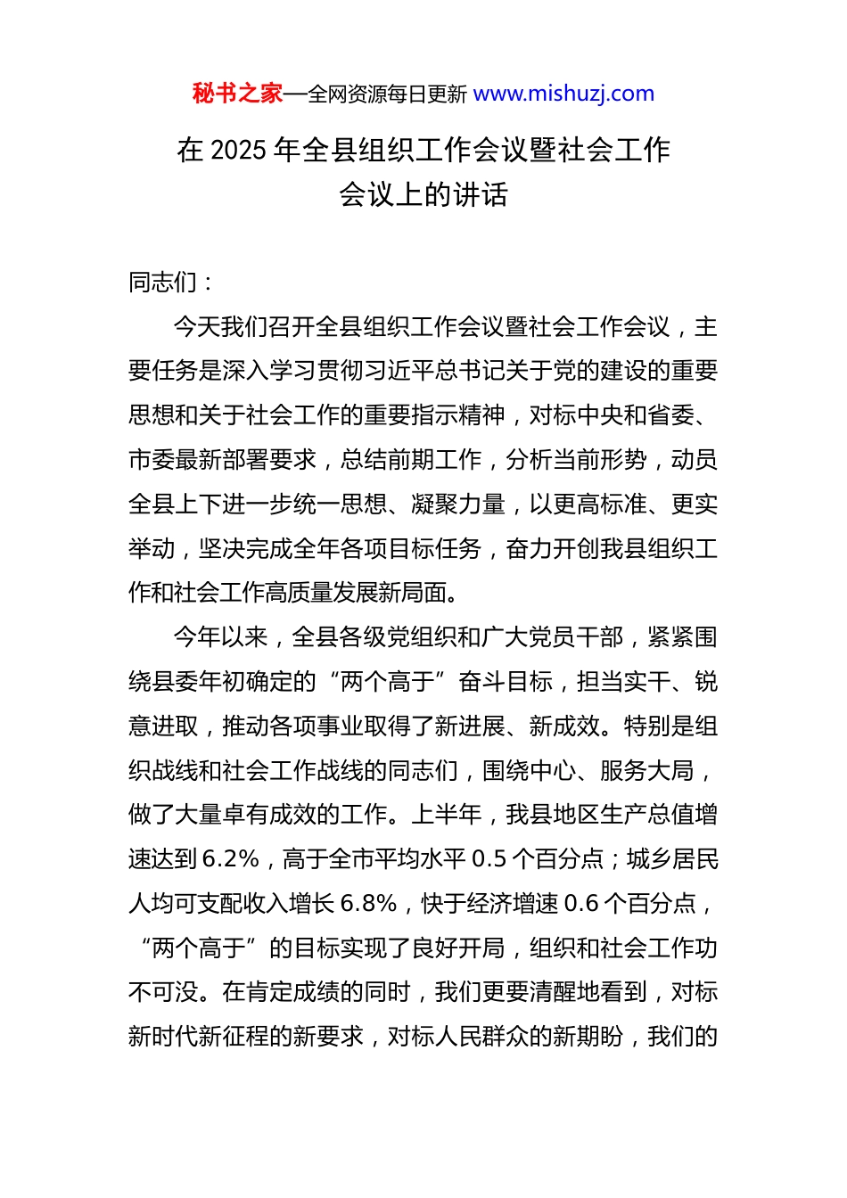 秘书之家—全网资源每日更新 www.mishuzj.com在 2025 年全县组织工作会议暨社会工作会议上的讲话 同志们:今天我们召开全县组织工作会议暨社会工作会议,主要任务是深入学习贯彻习近平总书记关于党的建设的重要思想和关于社会工作的重要指示精神,对标中央和省委、市委最新部署要求,总结前期工作,分析当前形势,动员全县上下进一步统一思想、凝聚力量,以更高标准、更实举动,坚决完成全年各项目标任务,奋力开创我县组织工作和社会工作高质量发展新局面。今年以来,全县各级党组织和广大党员干部,紧紧围绕县委年初确定的“两个高于”奋斗目标,担当实干、锐意进取,推动各项事业取得了新进展、新成效。特别是组织战线和社会工作战线的同志们,围绕中心、服务大局,做了大量卓有成效的工作。上半年,我县地区生产总值增速达到 6.2%,高于全市平均水平 0.5 个百分点;城乡居民人均可支配收入增长 6.8%,快于经济增速 0.6 个百分点,“两个高于”的目标实现了良好开局,组织和社会工作功不可没。在肯定成绩的同时,我们更要清醒地看到,对标新时代新征程的新要求,对标人民群众的新期盼,我们的秘书之家—全网资源每日更新 www.mishuzj.com工作还存在一些不容忽视的短板和弱项。比如,少数干部思想解放不够,担当作为的锐气和拼劲尚显不足;基层党组织战斗力还不均衡,部分组织政治功能和组织功能发挥不充分;人才引育留用的“磁场效应”还不够强;社会治理的精细化、智慧化水平还有待提升。这些问题,是我们前进道路上必须搬开的“绊脚石”、必须攻克的“娄山关”。下面,我讲几点意见。一、筑牢思想根基,在凝心铸魂上展现新高度,以理论清醒保证政治坚定思想是行动的先导。组织工作和社会工作的首要任务,就是要把广大党员干部和人民群众的思想和行动统一到党中央的决策部署上来。一要坚持不懈地抓好理论武装工作。要始终把学习贯彻习近平新时代中国特色社会主义思想作为首要的政治任务,不断巩固和拓展主题教育的成果,建立健全常态化、长效化的学习机制。不能满足于仅仅读了几本书、听了几堂课的表面功夫,关键在于要深入学习和透彻领悟,真正做到融会贯通。要深刻领会这一思想的核心要义、精神实质、丰富内涵以及实践要求,切实做到学思用贯通、知信行统一,不断提升自身的政治判断力、政治领悟力和政治执行力。秘书之家—全网资源每日更新 www.mishuzj.com二要紧密结合实际实践来深化理论学习。理论学习绝不能停留在空对空的层面,必须与我县如火如荼的发展实践紧密结合起来。要将学习成效具体体现在推动“五大攻坚战”的实际行动中,这包括我们的产业转型升级攻坚战、重大项目建设攻坚战、乡村全面振兴攻坚战、生态环境治理攻坚战以及民生福祉改善攻坚战。各级领导干部要率先垂范,深入到项目一线、田间地头、企业车间,通过实例学习、实地考察、实际操作,在解决复杂问题、应对风险挑战的过程中,深化对党的创新理论的理解和运用,真正把学习成果转化为谋划发展的正确思路、促进发展的有效政策举措以及领导发展的实际能力。三要创新方式方法以提升学习效果。要打破传统学习模式的局限,充分利用现代信息技术手段,开展线上线下相结合的学习活动。通过举办专题讲座、开设线上课程、组织研讨交流会等多种形式,激发党员干部的学习兴趣和积极性。同时,要注重学习方式的互动性和参与性,鼓励党员干部之间开展思想碰撞和经验分享,营造浓厚的学习氛围。四要建立健全学习考核机制。要将理论学习情况纳入党员干部的考核评价体系,明确学习目标和具体要求,制定详细的学习计划和考核标准。通过定期检查学习笔记、秘书之家—全网资源每日更新 www.mishuzj.com组织知识测试、开展学习成果展示等多种方式,全面了解和掌握党员干部的学习情况和实际成效。对于学习态度不认真、成效不明显的党员干部,要及时进行督促和指导,确保理论学习能够取得实实在在的效果。二、锻造过硬队伍,在选贤任能上实现新突破,以鲜明导向激发干事热情事业成败,关键在人。我们要坚持党管干部原则,树立和践行正确政绩观,着力锻造一支忠诚干净担当的高素质专业化干部队伍。一要树牢“以事...