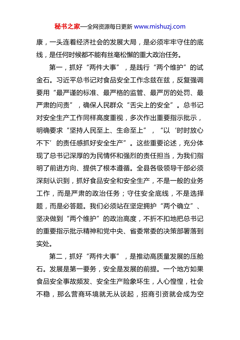 秘书之家—全网资源每日更新 www.mishuzj.com在 2025 年县领导干部素质提升专题辅导讲座暨县委理论学习中心组学习(扩大)会议上的讲话 同志们:今天,我们利用一天的时间,举办全县领导干部素质提升专题辅导讲座,并套开县委理论学习中心组学习(扩大)会议。刚才,来自*省市场监管局的*同志和*省应急管理厅的*同志,分别围绕食品安全和安全生产两个主题,为我们作了内容丰富、分析透彻、指导性强的专题辅导。两位专家的讲解,既有理论高度,又有实践深度,对我们进一步做好这两项工作具有重要的指导作用。在此,我代表县委,向两位专家的精彩授课表示衷心的感谢!利用今天这个机会,结合刚才两位专家的辅导内容和我县的实际情况,我再就抓好食品安全和安全生产这两项事关全局、事关民生的“头等大事”,讲几点意见,与同志们共勉。一、提高政治站位,以“国之大者”的清醒,深刻认识统筹发展和安全的极端重要性“民以食为天,食以安为先;国以安为基,安以稳为要。”食品安全和安全生产,一头连着千家万户的幸福安秘书之家—全网资源每日更新 www.mishuzj.com康,一头连着经济社会的发展大局,是必须牢牢守住的底线,是任何时候都不能有丝毫松懈的重大政治任务。第一,抓好“两件大事”,是践行“两个维护”的试金石。习近平总书记对食品安全工作念兹在兹,反复强调要用“最严谨的标准、最严格的监管、最严厉的处罚、最严肃的问责”,确保人民群众“舌尖上的安全”。总书记对安全生产工作同样高度重视,多次作出重要指示批示,明确要求“坚持人民至上、生命至上”,“以‘时时放心不下’的责任感抓好安全生产”。这些重要论述,充分体现了总书记深厚的为民情怀和强烈的责任担当,为我们指明了前进方向、提供了根本遵循。全县各级领导干部必须深刻认识到,抓好食品安全和安全生产,不是一般的业务工作,而是严肃的政治任务;守住安全底线,不是选择题,而是必答题。我们必须站在坚定拥护“两个确立”、坚决做到“两个维护”的政治高度,不折不扣地把总书记的重要指示批示精神和党中央、省委常委的决策部署落到实处。第二,抓好“两件大事”,是推动高质量发展的压舱石。发展是第一要务,安全是发展的前提。一个地方如果食品安全事故频发、安全生产险象环生,人心惶惶,社会不稳,那么营商环境就无从谈起,招商引资就会成为空秘书之家—全网资源每日更新 www.mishuzj.com谈,高质量发展更是一句空话。回顾我县近几年的发展历程,我们之所以能够顶住经济下行压力,保持稳中有进的良好态势,一个重要基础就是我们守住了安全发展的底线。当前,我县正处在转型升级、跨越赶超的关键时期,各类新产业、新业态不断涌现,产业链、供应链日益复杂,对我们的安全治理能力提出了更高要求。我们必须清醒认识到,安全就是效益,稳定就是竞争力。只有把安全的基础打得更牢,发展的脚步才能迈得更稳、更远。第三,抓好“两件大事”,是增进民生福祉的基准线。“悠悠万事,民生为大。”人民群众对美好生活的向往,最基本的就是吃得放心、住得安心、行得安全。如果连最基本的安全感都无法保障,那么教育、医疗、文化等其他方面的福祉都将失去意义。食品安全和安全生产工作,直接关系到每一个家庭的安危冷暖,是民生工程,更是民心工程。我们必须始终坚持以人民为中心的发展思想,把保障人民群众生命财产安全放在第一位,用心用情用力解决好群众最关心、最直接、最现实的安全问题,不断增强人民群众的获得感、幸福感、安全感。二、坚持问题导向,以“见叶知秋”的敏锐,精准把握当前面临的风险挑战近年来,在全县上下的共同努力下,我县食品安全和秘书之家—全网资源每日更新 www.mishuzj.com安全生产形势总体保持稳定向好态势,守住了不发生重特大事故的底线。但我们必须清醒地看到,成绩每天都在“归零”,风险隐患随时可能“抬头”。我们决不能有任何麻痹思想和侥 C 幸心理,必须坚持问题导向,用“放大镜”检视问题,用“显微镜”分析根源。在食品安全领域,形势依然严峻复杂。根据最新调度,今年 1—8 月,全县未发生区域性、系统性重大食品安全事故,食品安全评价性抽检合格率保持...