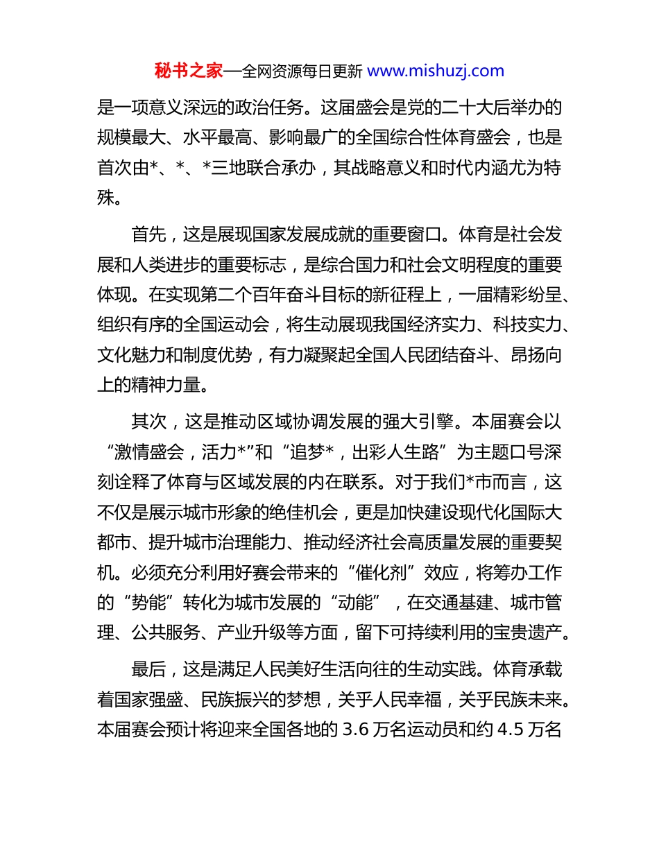秘书之家—全网资源每日更新 www.mishuzj.com在 2025 年市运动会筹备工作推进会上的讲话同志们:今天,我们在此召开这次专题推进会,主要任务是深入学习贯彻党中央、国务院关于体育强国建设的重要指示精神,认真落实省委、省政府的工作部署,全面检视我市承办第十五届全国运动会和第十二届全国残疾人运动会暨第九届特殊奥林匹克运动会的各项筹备工作进展,精准研判当前面临的形势与挑战,并对下一阶段的决战决胜工作进行再动员、再部署。今天是 2025 年 9 月 2 日,距离 11 月 9 日十五运会的盛大开幕,仅剩下 68 天。这标志着我们的筹备工作已经全面进入了倒计时冲刺的“读秒”阶段,到了发起总攻、决战决胜的最后关头。全市各级各部门、各相关单位必须以高度的政治责任感和历史使命感,将思想和行动统一到中央和省委的决策部署上来,以“简约、安全、精彩”的办赛要求为根本遵循,以“万无一失”的工作标准为底线,全力以赴,确保向全国人民交出一份圆满的*答卷。下面,我讲几点意见。一、高举旗帜,统一思想,深刻认识办好体育盛会的历史性意义成功举办十五运会和残特奥会,是党中央、国务院赋予*省和我们*市的光荣使命,这不仅是一项重大的体育任务,更秘书之家—全网资源每日更新 www.mishuzj.com是一项意义深远的政治任务。这届盛会是党的二十大后举办的规模最大、水平最高、影响最广的全国综合性体育盛会,也是首次由*、*、*三地联合承办,其战略意义和时代内涵尤为特殊。首先,这是展现国家发展成就的重要窗口。体育是社会发展和人类进步的重要标志,是综合国力和社会文明程度的重要体现。在实现第二个百年奋斗目标的新征程上,一届精彩纷呈、组织有序的全国运动会,将生动展现我国经济实力、科技实力、文化魅力和制度优势,有力凝聚起全国人民团结奋斗、昂扬向上的精神力量。其次,这是推动区域协调发展的强大引擎。本届赛会以“激情盛会,活力*”和“追梦*,出彩人生路”为主题口号深刻诠释了体育与区域发展的内在联系。对于我们*市而言,这不仅是展示城市形象的绝佳机会,更是加快建设现代化国际大都市、提升城市治理能力、推动经济社会高质量发展的重要契机。必须充分利用好赛会带来的“催化剂”效应,将筹办工作的“势能”转化为城市发展的“动能”,在交通基建、城市管理、公共服务、产业升级等方面,留下可持续利用的宝贵遗产。最后,这是满足人民美好生活向往的生动实践。体育承载着国家强盛、民族振兴的梦想,关乎人民幸福,关乎民族未来。本届赛会预计将迎来全国各地的 3.6 万名运动员和约 4.5 万名秘书之家—全网资源每日更新 www.mishuzj.com赛会志愿者辐射带动亿万群众关注体育、参与体育。我们要通过精心筹办,点燃全民健身的热情,普及健康生活的理念,让体育发展成果更多更公平惠及全体人民,不断增强人民群众的获得感和幸福感。二、聚焦重点,精益求精,全力实现核心筹备任务的高标准完成行百里者半九十。越到最后关头,越要保持清醒、专注细节。从当前情况看,各项筹备工作总体进展顺利,特别是我们市负责的 23 个场馆维修改造项目已于今年 4 月实现实体完工为赛事运行打下了坚实基础。但我们必须认识到,后续的软硬件磨合、运行测试、服务保障等任务更为艰巨复杂。各单位必须对照工作清单,逐项对账销号,确保各项任务高标准、高质量完成。(一)系统高效推进开闭幕式筹备,确保惊艳呈现开幕式是赛会的“第一印象”,是展示国家形象和*魅力的集中体现。我市作为十五运会开幕式的主办城市,责任重于泰山。残特奥会的开幕式也将在我市*体育中心举行同样需要精心策划。筹备团队要以最高的艺术标准和最严谨的执行力,全力打造一场载入史册的文化盛典。一要强化协同配合。主创团队、技术保障团队、演出单位要建立高效的联席工作机制,实现无缝对接。要围绕“科技、绿色、人文”的核心理念,深秘书之家—全网资源每日更新 www.mishuzj.com度融合*独特的地域文化、岭南风情与前沿的声光电技术、人工智能特效,精心打磨每一个节目、每一个环节,确保创意表达精准、艺术呈现完美。二要抓实综合演练。必须尽快启动全要素、全流程、全负...