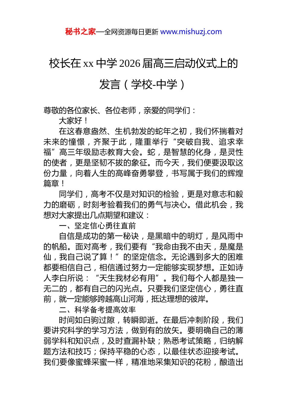 秘书之家—全网资源每日更新 www.mishuzj.com在 xx 中学 2026 届高三启动仪式上的发言材料汇编(3 篇)(学校-中学)目录1.校长在 xx 中学 2026 届高三启动仪式上的发言(学校-中学).............................................................................................22.在 xx 中学 2026 届高三启动仪式上的发言(学校-中学)..63.在 xx 中学 2026 届高三启动仪式上的发言(学校-中学)..9秘书之家—全网资源每日更新 www.mishuzj.com校长在 xx 中学 2026 届高三启动仪式上的发言(学校-中学)尊敬的各位家长、各位老师,亲爱的同学们:大家好!在这春意盎然、生机勃发的蛇年之初,我们怀揣着对未来的憧憬,齐聚于此,隆重举行“突破自我、追求幸福”高三年级励志教育大会。蛇,是智慧的化身,是灵性的使者,更是坚韧不拔的象征。而今天,我们便要汲取这份力量,向着人生的高峰奋勇攀登,书写属于我们的辉煌篇章!同学们,高考不仅是对知识的检验,更是对意志和毅力的磨砺,时刻考验着我们的勇气与决心。借此机会,我想对大家提出几点期望和建议:一、坚定信心勇往直前自信是成功的第一秘诀,是黑暗中的明灯,是风雨中的帆船。面对高考,我们要有“我命由我不由天,是魔是仙,我自己说了算!”的坚定信念。无论遇到多大的困难都要相信自己,相信通过努力一定能够实现梦想。正如诗人李白所说:“天生我材必有用”。我们每个人都是独一无二的,都有自己的闪光点。只要我们坚定信心,勇往直前,就一定能够跨越高山河海,抵达理想的彼岸。二、科学备考提高效率时间如白驹过隙,转瞬即逝。在最后冲刺阶段,我们要讲究科学的学习方法,做到有的放矢。要明确自己的薄弱学科和知识点,及时查漏补缺;熟悉考试策略,归纳解题方法和技巧;保持平稳的心态,以最佳状态迎接考试。我们要像蜜蜂采蜜一样,精准地采集知识的花粉,酿造出秘书之家—全网资源每日更新 www.mishuzj.com甜美的蜜糖。同时,我们还要合理规划时间,做到学习、休息两不误,让大脑始终保持清醒和高效的状态。三、劳逸结合保持健康适当的休息和锻炼是保持良好精神状态的关键。同学们在紧张的学习之余,要学会调整自己,保持身心健康,以更好的状态投入到学习中去。我们可以利用课间做做眼保健操,放松一下眼睛;课后开展一些体育锻炼,如跑步跳绳、打球等,让身体得到放松和舒展。只有身心健康,才能在考试过程中发挥最佳水平。四、勤奋努力坚持不懈勤奋是成功的阶梯,是通往成功的必经之路。我们要牢记“勤奋”二字,脚踏实地,坚持不懈。只有付出比别人更多的努力,才能收获比别人更大的成功。正如古人所说:“书山有路勤为径,学海无涯苦作舟。”我们要以勤奋为舟,以刻苦为桨,在知识的海洋中破浪前行。同时,我们还要有坚韧不拔的毅力,遇到困难不退缩,遇到挫折不气馁,坚持到底就是胜利。五、团结协作共同进步团结就是力量,是战胜困难的法宝。在备考过程中,我们要相互支持、相互鼓励,共同面对困难和挑战。要珍惜身边的每一个同学,珍惜每一次交流的机会,共同探讨问题,分享学习心得。只有这样,我们才能在团队的力量中不断成长,共同进步。只要我们心往一处想,劲往一处使,就一定能够创造属于我们的辉煌。老师们,实现学校和学生新的发展,是我们的责任和使命。希望全体老师忠于职守,精诚团结,言传身教,脚踏实地,甘于奉献,追求卓越。希望班主任们做更加深入细致的工作,更多地了解学生,关爱学生,帮助学生。我们要用爱心去呵护学生,用耐心去指导学生,用责任心去培育学生。我们要与学生同甘共苦,共同奋斗,为学生保驾护航。秘书之家—全网资源每日更新 www.mishuzj.com家长们,你们是孩子们最坚实的后盾。希望你们能够给予孩子们更多的关爱和支持,帮助他们缓解压力,鼓励他们勇往直前。同时,也请你们相信学校、相信老师,我们会共同努力,为孩子们创造一个良好的备考环境。让我们携手共进,为孩子们的高考加油助力!同学们,这 xxx 天,将是汗水与智慧交织的日子,是你我共同书写的青春华章。我相信,你们每一天的努力,都不会被辜负;每一次的坚持,都会...