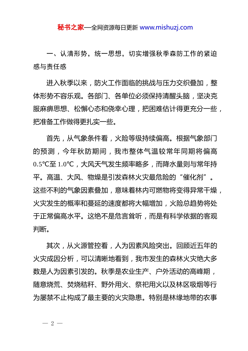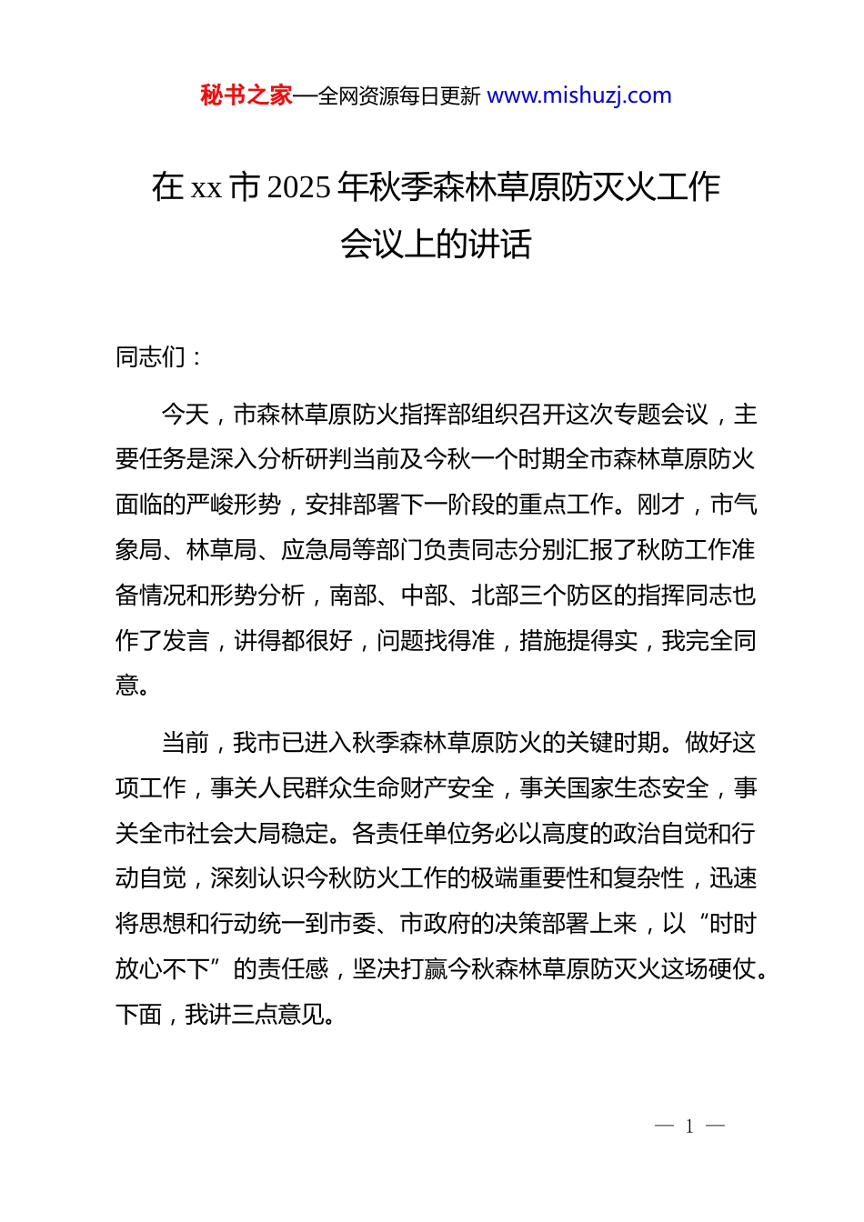 秘书之家—全网资源每日更新 www.mishuzj.com在 xx 市 2025 年秋季森林草原防灭火工作会议上的讲话同志们:今天,市森林草原防火指挥部组织召开这次专题会议,主要任务是深入分析研判当前及今秋一个时期全市森林草原防火面临的严峻形势,安排部署下一阶段的重点工作。刚才,市气象局、林草局、应急局等部门负责同志分别汇报了秋防工作准备情况和形势分析,南部、中部、北部三个防区的指挥同志也作了发言,讲得都很好,问题找得准,措施提得实,我完全同意。当前,我市已进入秋季森林草原防火的关键时期。做好这项工作,事关人民群众生命财产安全,事关国家生态安全,事关全市社会大局稳定。各责任单位务必以高度的政治自觉和行动自觉,深刻认识今秋防火工作的极端重要性和复杂性,迅速将思想和行动统一到市委、市政府的决策部署上来,以“时时放心不下”的责任感,坚决打赢今秋森林草原防灭火这场硬仗。下面,我讲三点意见。— 1 —秘书之家—全网资源每日更新 www.mishuzj.com一、认清形势,统一思想,切实增强秋季森防工作的紧迫感与责任感进入秋季以来,防火工作面临的挑战与压力交织叠加,整体形势不容乐观。各部门、各单位必须保持清醒头脑,坚决克服麻痹思想、松懈心态和侥幸心理,把困难估计得更充分一些,把准备工作做得更扎实一些。首先,从气象条件看,火险等级持续偏高。根据气象部门的预测,今年秋防期间,我市整体气温较常年同期将偏高0.5℃至 1.0℃,大风天气发生频率略多,而降水量则与常年持平。高温、大风、物燥是引发森林火灾最危险的“催化剂”。这些不利的气象因素叠加,意味着林内可燃物将变得异常干燥,火灾发生的概率和蔓延的速度都将大幅增加,火险总趋势将处于正常偏高水平。这绝不是危言耸听,而是有科学依据的客观判断。其次,从火源管控看,人为因素风险突出。回顾近五年的火灾成因分析,可以清晰地看到,我市发生的森林火灾绝大多数是人为因素引发的。秋季是农业生产、户外活动的高峰期,随意烧荒、焚烧秸秆、野外用火、祭祀用火以及林区吸烟等行为屡禁不止构成了最主要的火灾隐患。特别是林缘地带的农事— 2 —秘书之家—全网资源每日更新 www.mishuzj.com用火,管控难度极大,一旦失控,极易“火烧连营”,酿成大灾。历史数据显示,春季和秋季是我市火灾发生频率最高的季节,这一规律性特征要求大家必须将火源管控作为防范工作的重中之重。再次,从基础能力看,短板弱项依然存在。近年来,市委、市政府高度重视森林防灭火工作,持续加大投入,我市的救援装备水平有了显著提升。但是,也必须清醒地看到,我市部分区域的防火基础设施仍然比较薄弱,部分早期修建的瞭望塔、检查站、蓄水池等设施存在老化失修问题,难以满足当前高强度防火工作的需要。此外,火险预测预警的科技化水平还有待提高,基层专业防扑火队伍的实战能力也需要通过不断演练来巩固。这些都是在部署工作时必须充分考虑并着力解决的现实问题。面对严峻复杂的防火形势,任何的掉以轻心都可能导致前功尽弃,任何的疏忽大意都可能造成无法挽回的损失。全市上下必须立刻绷紧防火安全这根弦,迅速进入临战状态,以最高标准、最严要求、最实举措,全力以赴做好秋防各项准备工作。二、聚焦关键,精准施策,全面提升森林火灾综合防控能力— 3 —秘书之家—全网资源每日更新 www.mishuzj.com打赢秋季森林草原防灭火攻坚战,必须坚持问题导向,抓住关键环节,下足“绣花”功夫,确保各项防控措施落地见效。要围绕“防得住、早发现、快处置”的目标,构建全方位、立体化的防控体系。第一,强化源头管控,筑牢第一道防线。防火工作的核心在于“防”。必须把功夫下在火灾发生之前,严管严控野外火源。一是要严格落实野外火源管理规定。在防火期内,要依法划定并公告森林防火区和防火期,严禁一切野外用火。林草、公安、应急等部门要组织联合执法力量,加大巡查频次和密度,对林区、牧区、旅游景区及林缘地带等重点区域实施不间断巡护,做到“见烟就查、见火就罚、违规就究”。二是要加强对重点人群的教育和管理。针对林区作业人员、牧民、游客等群体,要通过签订责任状、发放宣传...