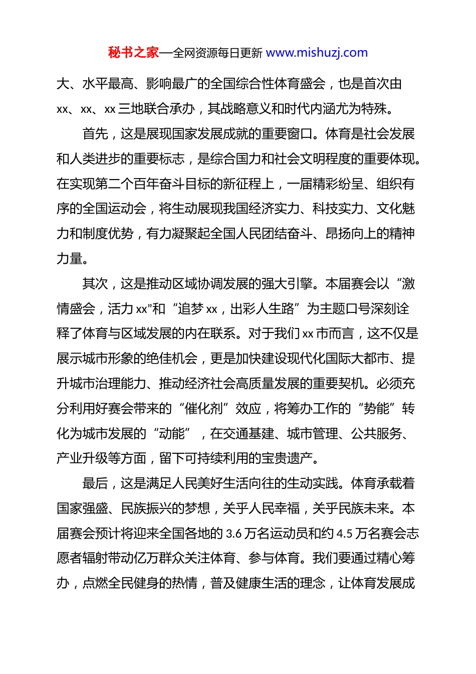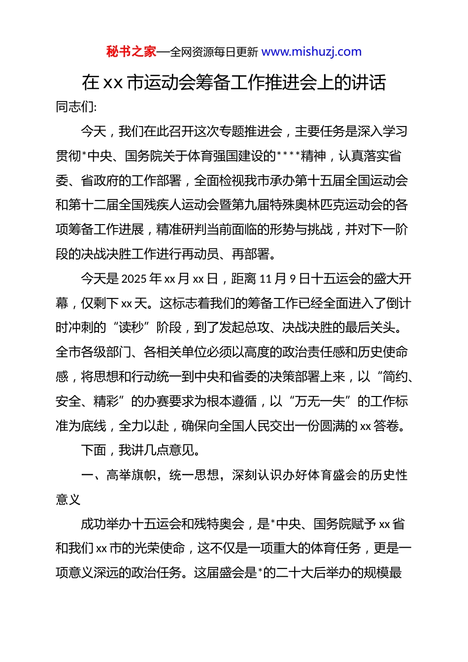 秘书之家—全网资源每日更新 www.mishuzj.com在 xx 市运动会筹备工作推进会上的讲话同志们:今天,我们在此召开这次专题推进会,主要任务是深入学习贯彻*中央、国务院关于体育强国建设的****精神,认真落实省委、省政府的工作部署,全面检视我市承办第十五届全国运动会和第十二届全国残疾人运动会暨第九届特殊奥林匹克运动会的各项筹备工作进展,精准研判当前面临的形势与挑战,并对下一阶段的决战决胜工作进行再动员、再部署。今天是 2025 年 xx 月 xx 日,距离 11 月 9 日十五运会的盛大开幕,仅剩下 xx 天。这标志着我们的筹备工作已经全面进入了倒计时冲刺的“读秒”阶段,到了发起总攻、决战决胜的最后关头。全市各级部门、各相关单位必须以高度的政治责任感和历史使命感,将思想和行动统一到中央和省委的决策部署上来,以“简约、安全、精彩”的办赛要求为根本遵循,以“万无一失”的工作标准为底线,全力以赴,确保向全国人民交出一份圆满的 xx 答卷。下面,我讲几点意见。一、高举旗帜,统一思想,深刻认识办好体育盛会的历史性意义成功举办十五运会和残特奥会,是*中央、国务院赋予 xx 省和我们 xx 市的光荣使命,这不仅是一项重大的体育任务,更是一项意义深远的政治任务。这届盛会是*的二十大后举办的规模最秘书之家—全网资源每日更新 www.mishuzj.com大、水平最高、影响最广的全国综合性体育盛会,也是首次由xx、xx、xx 三地联合承办,其战略意义和时代内涵尤为特殊。首先,这是展现国家发展成就的重要窗口。体育是社会发展和人类进步的重要标志,是综合国力和社会文明程度的重要体现。在实现第二个百年奋斗目标的新征程上,一届精彩纷呈、组织有序的全国运动会,将生动展现我国经济实力、科技实力、文化魅力和制度优势,有力凝聚起全国人民团结奋斗、昂扬向上的精神力量。其次,这是推动区域协调发展的强大引擎。本届赛会以“激情盛会,活力 xx”和“追梦 xx,出彩人生路”为主题口号深刻诠释了体育与区域发展的内在联系。对于我们 xx 市而言,这不仅是展示城市形象的绝佳机会,更是加快建设现代化国际大都市、提升城市治理能力、推动经济社会高质量发展的重要契机。必须充分利用好赛会带来的“催化剂”效应,将筹办工作的“势能”转化为城市发展的“动能”,在交通基建、城市管理、公共服务、产业升级等方面,留下可持续利用的宝贵遗产。最后,这是满足人民美好生活向往的生动实践。体育承载着国家强盛、民族振兴的梦想,关乎人民幸福,关乎民族未来。本届赛会预计将迎来全国各地的 3.6 万名运动员和约 4.5 万名赛会志愿者辐射带动亿万群众关注体育、参与体育。我们要通过精心筹办,点燃全民健身的热情,普及健康生活的理念,让体育发展成秘书之家—全网资源每日更新 www.mishuzj.com果更多更公平惠及全体人民,不断增强人民群众的获得感和幸福感。二、聚焦重点,精益求精,全力实现核心筹备任务的高标准完成行百里者半九十。越到最后关头,越要保持清醒、专注细节。从当前情况看,各项筹备工作总体进展顺利,特别是我们市负责的 23 个场馆维修改造项目已于今年 4 月实现实体完工为赛事运行打下了坚实基础。但我们必须认识到,后续的软硬件磨合、运行测试、服务保障等任务更为艰巨复杂。各单位必须对照工作清单,逐项对账销号,确保各项任务高标准、高质量完成。(一)系统高效推进开闭幕式筹备,确保惊艳呈现开幕式是赛会的“第一印象”,是展示国家形象和 xx 魅力的集中体现。我市作为十五运会开幕式的主办城市,责任重于泰山。残特奥会的开幕式也将在我市 xx 体育中心举行同样需要精心策划。筹备团队要以最高的艺术标准和最严谨的执行力,全力打造一场载入史册的文化盛典。一要强化协同配合。主创团队、技术保障团队、演出单位要建立高效的联席工作机制,实现无缝对接。要围绕“科技、绿色、人文”的核心理念,深度融合 xx 独特的地域文化、岭南风情与前沿的声光电技术、人工智能特效,精心打磨每一个节目、每一个环节,确保创意表达精准、艺术呈现完美。秘书之家—全网资源每日更新 www.mishuzj.com二要抓实综合演练。...