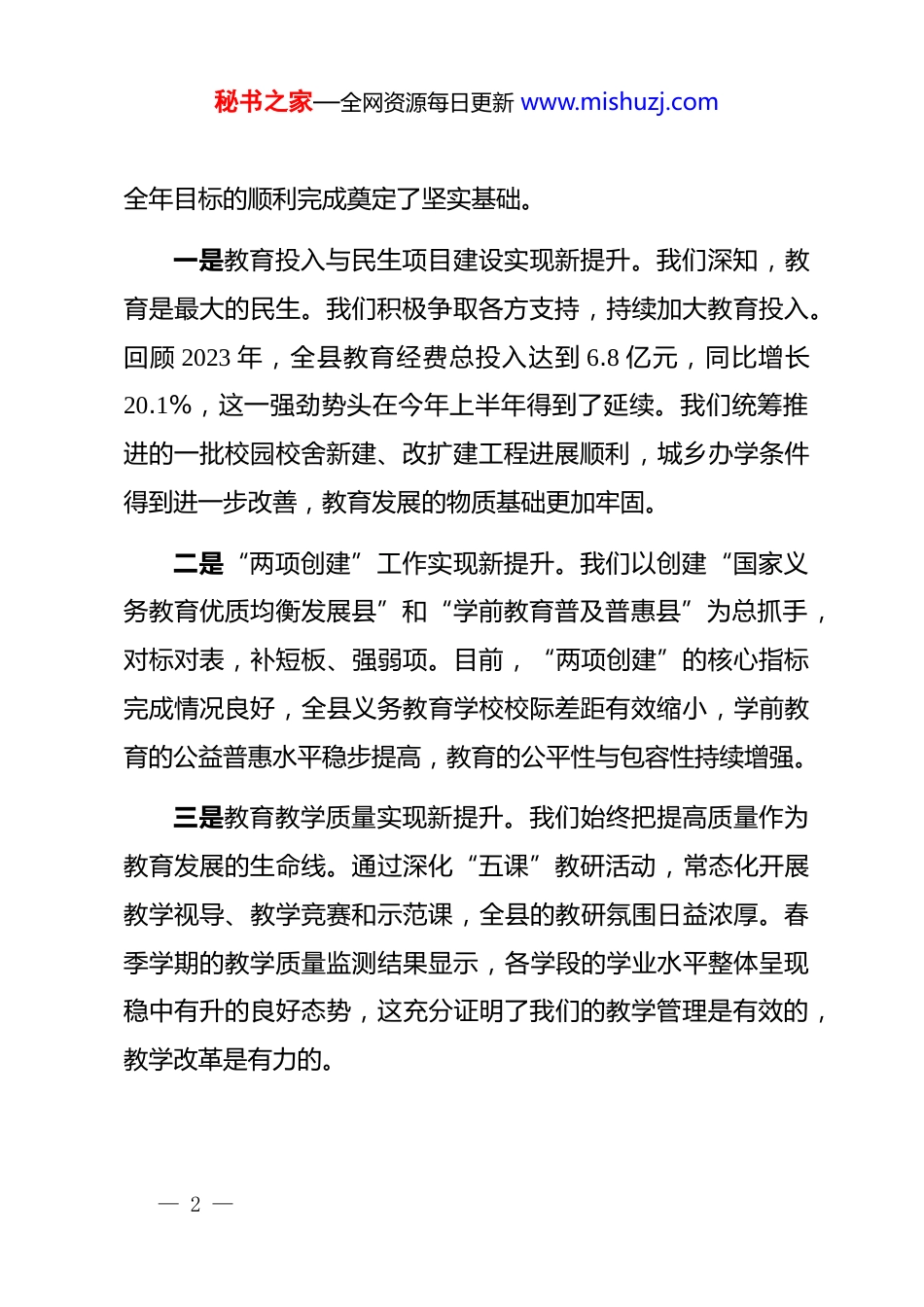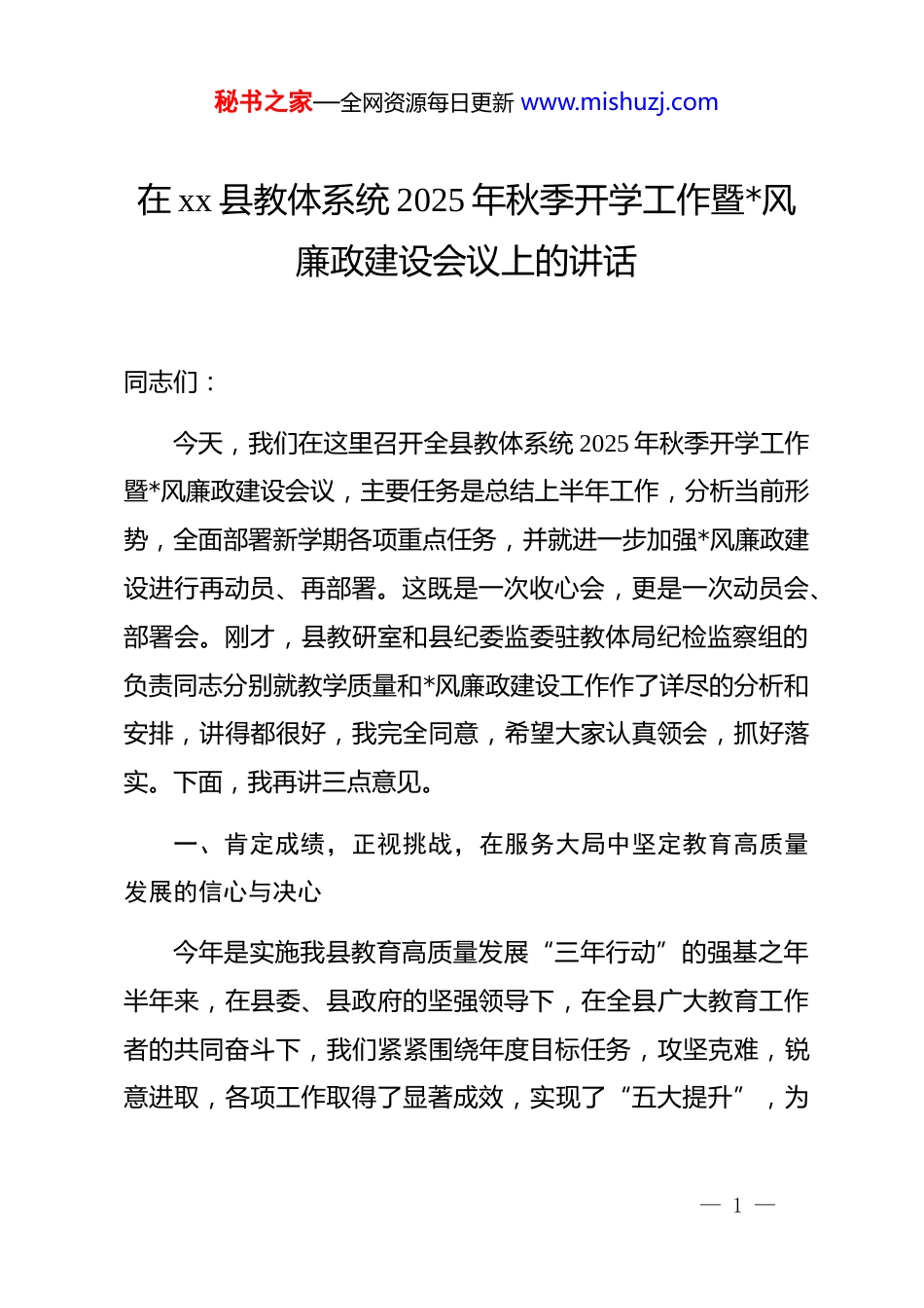 秘书之家—全网资源每日更新 www.mishuzj.com在 xx 县教体系统 2025 年秋季开学工作暨*风廉政建设会议上的讲话同志们:今天,我们在这里召开全县教体系统 2025 年秋季开学工作暨*风廉政建设会议,主要任务是总结上半年工作,分析当前形势,全面部署新学期各项重点任务,并就进一步加强*风廉政建设进行再动员、再部署。这既是一次收心会,更是一次动员会、部署会。刚才,县教研室和县纪委监委驻教体局纪检监察组的负责同志分别就教学质量和*风廉政建设工作作了详尽的分析和安排,讲得都很好,我完全同意,希望大家认真领会,抓好落实。下面,我再讲三点意见。一、肯定成绩,正视挑战,在服务大局中坚定教育高质量发展的信心与决心今年是实施我县教育高质量发展“三年行动”的强基之年半年来,在县委、县政府的坚强领导下,在全县广大教育工作者的共同奋斗下,我们紧紧围绕年度目标任务,攻坚克难,锐意进取,各项工作取得了显著成效,实现了“五大提升”,为— 1 —秘书之家—全网资源每日更新 www.mishuzj.com全年目标的顺利完成奠定了坚实基础。一是教育投入与民生项目建设实现新提升。我们深知,教育是最大的民生。我们积极争取各方支持,持续加大教育投入。回顾 2023 年,全县教育经费总投入达到 6.8 亿元,同比增长20.1%,这一强劲势头在今年上半年得到了延续。我们统筹推进的一批校园校舍新建、改扩建工程进展顺利,城乡办学条件得到进一步改善,教育发展的物质基础更加牢固。二是“两项创建”工作实现新提升。我们以创建“国家义务教育优质均衡发展县”和“学前教育普及普惠县”为总抓手,对标对表,补短板、强弱项。目前,“两项创建”的核心指标完成情况良好,全县义务教育学校校际差距有效缩小,学前教育的公益普惠水平稳步提高,教育的公平性与包容性持续增强。三是教育教学质量实现新提升。我们始终把提高质量作为教育发展的生命线。通过深化“五课”教研活动,常态化开展教学视导、教学竞赛和示范课,全县的教研氛围日益浓厚。春季学期的教学质量监测结果显示,各学段的学业水平整体呈现稳中有升的良好态势,这充分证明了我们的教学管理是有效的,教学改革是有力的。— 2 —秘书之家—全网资源每日更新 www.mishuzj.com四是师资队伍建设实现新提升。我们不断完善“三级三类”骨干教师梯队培养体系,充分发挥名师乡村工作室和教研员的示范引领与专业指导作用,为广大教师的专业成长搭建了宽广平台。上半年,又有一批青年教师在各级各类教学竞赛中脱颖而出,为我们的教师队伍注入了新的活力。目前,我们拥有一支近 1800 人的专任教师队伍,他们是我县教育事业发展的宝贵财富和中坚力量。五是服务社会能力实现新提升。教育的发展离不开社会的支持,也必须服务于经济社会发展的大局。我们坚持办人民满意的教育,积极回应社会关切,平稳有序地完成了春季招生、中高考组织等重大任务,赢得了社会的广泛认可。在肯定成绩的同时,我们也要清醒地看到,与 xx 南部教育强县的目标相比,与人民群众对优质教育的期盼相比,我们还存在一些不容忽视的短板和挑战。比如,城乡之间、校际之间的发展不平衡问题依然存在;个别学校的管理精细化水平有待提高;教师队伍的结构性矛盾还需要进一步破解;校园安全管理的压力持续增大等等。对此,我们必须高度重视,以刮骨疗毒的勇气和持之以恒的毅力,切实加以解决。二、聚焦重点,精准发力,以务实举措开创秋季学期工作— 3 —秘书之家—全网资源每日更新 www.mishuzj.com新局面新学期、新起点、新征程。全县各学校、各单位要迅速从假期状态切换到工作状态,提前谋划、精心组织,确保秋季开学各项工作平稳、安全、有序。第一,要全力以赴抓好教育教学这个中心工作。质量是学校的立身之本。各学校要始终把提高教育教学质量摆在一切工作的首位。一要深化教学改革。要持续加大对“三级三类”骨干教师的培养和使用力度,让他们成为教学改革的“领头雁”和“排头兵”。要继续深化“五课”教研活动,推动教研活动向深层次、常态化发展,让每一位教师都能在研究状态下工作。二要巩固“双减”成果。要进一步提升作业管理水平...