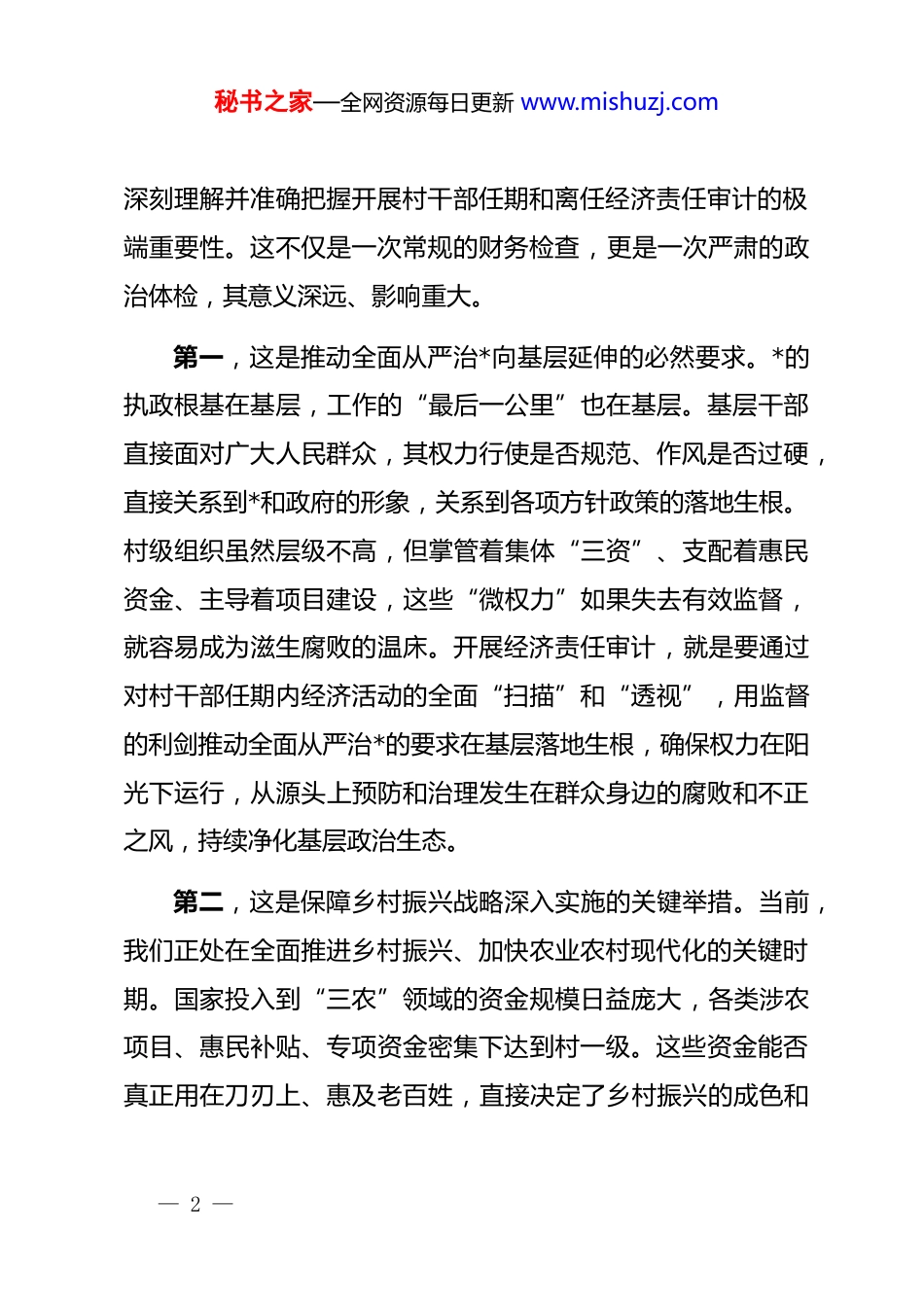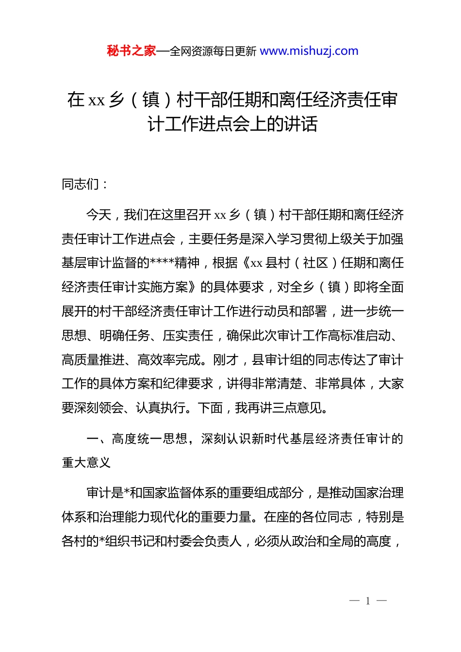 秘书之家—全网资源每日更新 www.mishuzj.com在 xx 乡(镇)村干部任期和离任经济责任审计工作进点会上的讲话同志们:今天,我们在这里召开 xx 乡(镇)村干部任期和离任经济责任审计工作进点会,主要任务是深入学习贯彻上级关于加强基层审计监督的****精神,根据《xx 县村(社区)任期和离任经济责任审计实施方案》的具体要求,对全乡(镇)即将全面展开的村干部经济责任审计工作进行动员和部署,进一步统一思想、明确任务、压实责任,确保此次审计工作高标准启动、高质量推进、高效率完成。刚才,县审计组的同志传达了审计工作的具体方案和纪律要求,讲得非常清楚、非常具体,大家要深刻领会、认真执行。下面,我再讲三点意见。一、高度统一思想,深刻认识新时代基层经济责任审计的重大意义审计是*和国家监督体系的重要组成部分,是推动国家治理体系和治理能力现代化的重要力量。在座的各位同志,特别是各村的*组织书记和村委会负责人,必须从政治和全局的高度,— 1 —秘书之家—全网资源每日更新 www.mishuzj.com深刻理解并准确把握开展村干部任期和离任经济责任审计的极端重要性。这不仅是一次常规的财务检查,更是一次严肃的政治体检,其意义深远、影响重大。第一,这是推动全面从严治*向基层延伸的必然要求。*的执政根基在基层,工作的“最后一公里”也在基层。基层干部直接面对广大人民群众,其权力行使是否规范、作风是否过硬,直接关系到*和政府的形象,关系到各项方针政策的落地生根。村级组织虽然层级不高,但掌管着集体“三资”、支配着惠民资金、主导着项目建设,这些“微权力”如果失去有效监督,就容易成为滋生腐败的温床。开展经济责任审计,就是要通过对村干部任期内经济活动的全面“扫描”和“透视”,用监督的利剑推动全面从严治*的要求在基层落地生根,确保权力在阳光下运行,从源头上预防和治理发生在群众身边的腐败和不正之风,持续净化基层政治生态。第二,这是保障乡村振兴战略深入实施的关键举措。当前,我们正处在全面推进乡村振兴、加快农业农村现代化的关键时期。国家投入到“三农”领域的资金规模日益庞大,各类涉农项目、惠民补贴、专项资金密集下达到村一级。这些资金能否真正用在刀刃上、惠及老百姓,直接决定了乡村振兴的成色和— 2 —秘书之家—全网资源每日更新 www.mishuzj.com质量。经济责任审计,就是要对这些“高压线”资金的管理使用情况进行重点监督,审查是否存在截留、挪用、贪占、虚报冒领等问题确保每一分钱都花得明明白白、清清楚楚。通过审计,可以有效堵塞管理漏洞,规范项目流程,提高资金使用效益为乡村产业发展、人居环境整治、基础设施建设等重点任务的顺利推进提供坚实的纪律和财务保障。第三,这是关心爱护与严格管理基层干部的具体体现。“严管就是厚爱,监督就是保护”。开展任期和离任经济责任审计,一方面,是对干部履职情况的一次全面检验,能够客观、公正地评价其工作实绩和廉洁自律情况,为组织的考核、评价、任用提供重要依据。对于那些勤勉尽责、廉洁奉公的干部,审计结果就是最好的“成绩单”和“清白证”。另一方面,审计也是一剂“预防针”和“清醒剂”。通过审计及时发现苗头性、倾向性问题,抓早抓小、防微杜渐,帮助干部及时纠正偏差、改进工作,避免小问题演变成大错误,这本身就是对干部最大的关心和爱护。大家要正确看待审计,把审计监督当作一次难得的“健康体检”,主动接受监督,坦诚面对问题。二、聚焦核心任务,精准把握本次经济责任审计的关键环节— 3 —秘书之家—全网资源每日更新 www.mishuzj.com本次审计工作时间紧、任务重、要求高、涉及面广。审计组要严格按照《xx 县村(社区)任期和离任经济责任审计实施方案》的要求,各村要全力配合,确保审计工作不跑偏、不走样,真正审深、审透、审出实效。根据方案精神和工作实际,此次审计要重点把握好以下三个方面。第一,紧盯“责任”二字,审查履职尽责的实际成效。经济责任审计,核心是“责任”。不能简单地将审计等同于查账,而是要透过账本看责任、看担当、看作为。要重点关注各村在任期内经济社会发展目标的完成情况。比如...