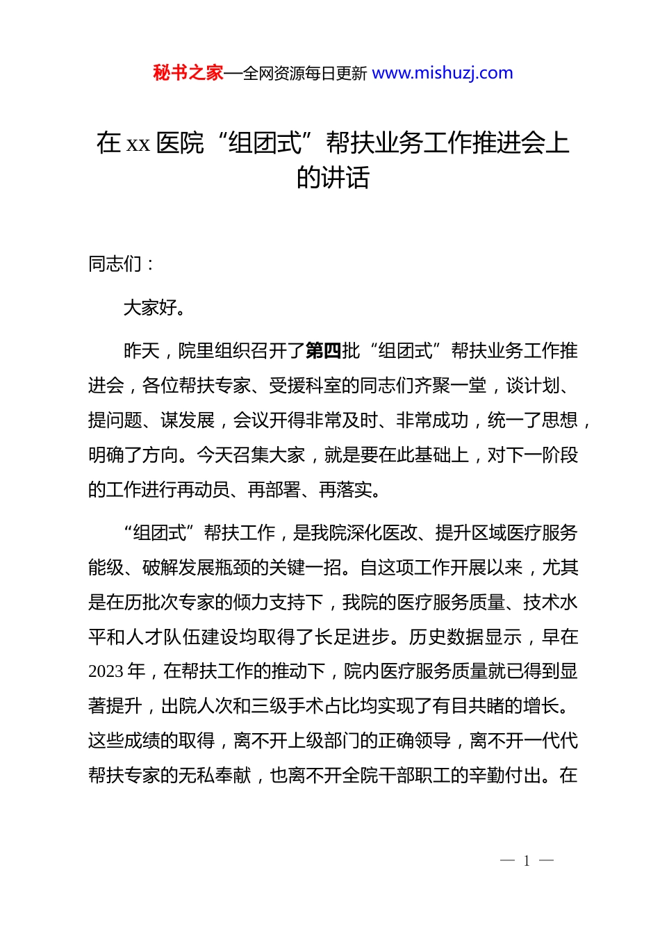 秘书之家—全网资源每日更新 www.mishuzj.com在 xx 医院“组团式”帮扶业务工作推进会上的讲话同志们:大家好。昨天,院里组织召开了第四批“组团式”帮扶业务工作推进会,各位帮扶专家、受援科室的同志们齐聚一堂,谈计划、提问题、谋发展,会议开得非常及时、非常成功,统一了思想,明确了方向。今天召集大家,就是要在此基础上,对下一阶段的工作进行再动员、再部署、再落实。“组团式”帮扶工作,是我院深化医改、提升区域医疗服务能级、破解发展瓶颈的关键一招。自这项工作开展以来,尤其是在历批次专家的倾力支持下,我院的医疗服务质量、技术水平和人才队伍建设均取得了长足进步。历史数据显示,早在2023 年,在帮扶工作的推动下,院内医疗服务质量就已得到显著提升,出院人次和三级手术占比均实现了有目共睹的增长。这些成绩的取得,离不开上级部门的正确领导,离不开一代代帮扶专家的无私奉献,也离不开全院干部职工的辛勤付出。在— 1 —秘书之家—全网资源每日更新 www.mishuzj.com此,我代表院领导班子,向远道而来、辛勤工作的第四批帮扶专家们,表示最诚挚的感谢!向所有为医院发展贡献力量的同志们,致以最崇高的敬意!当前,新一批为期一年的驻点帮扶工作已全面展开,这既是机遇,更是沉甸甸的责任。昨天的会议上,专家们提出了聚焦微创手术、危重症救治、规范流程、强化带教等一系列富有前瞻性和可操作性的工作计划。同时,受援科室也反映了设备配置不足、人员储备薄弱、院感质控待加强等现实挑战。这些都是必须正视并着力解决的问题。面对新形势、新任务,全院上下必须凝聚共识,将“组团式”帮扶从简单的“输血”模式,坚定不移地转向可持续的“造血”模式,真正把外部助力内化为医院自身发展的强大动能。下面,我讲三点意见。一、锚定战略目标,深刻把握“组团式”帮扶的核心要义“组团式”帮扶绝非权宜之计,而是推动医院实现跨越式发展的长远战略。其核心要义,在于通过“引进来”和“走出去”相结合,系统性地提升医院的内涵实力,最终实现“大病不出县”的战略目标,为建设“健康 xx”贡献核心力量。首先,要深刻理解从“输血”到“造血”的根本转变。过— 2 —秘书之家—全网资源每日更新 www.mishuzj.com去的帮扶,可能更多体现在“送技术、送专家”上,这种模式在短期内效果明显,但难以形成长效机制。新时期的帮扶工作,必须将重心放在“造”字上。所谓“造”,就是要制造一支带不走的人才队伍,营造一个持续创新的学科生态,锻造一套科学高效的管理体系。专家们带来的不仅是高超的技术,更是先进的理念、科学的方法和严谨的作风。各科室要主动对接,不仅要学技术,更要学思维、学管理、学文化,真正做到学以致用、脱胎换骨。其次,要精准定位帮扶工作的战略支点。这个支点,就是学科建设。一个医院的强大,根本在于学科的强大。本次帮扶计划中,专家们重点提及的微创手术、危重症救治等领域,正是我院发展的短板,也是区域内群众最迫切的医疗需求。必须将这些领域作为主攻方向,集中优势资源,力求在关键技术上实现重点突破。每一个受援科室都要有清晰的学科发展规划,明确未来一到三年内要达到什么水平、填补哪些技术空白、形成哪些特色优势。要通过帮扶,培育出一批在区域内叫得响、立得住的重点专科,以点带面,辐射带动医院整体服务能力的跃升。二、聚焦关键环节,以标准化建设驱动帮扶工作提质增效— 3 —秘书之家—全网资源每日更新 www.mishuzj.com目标已经明确,关键在于落实。昨天的会议提出了四个方面的工作要求,这四个方面互为支撑、缺一不可,必须以系统思维和标准化方法论一体推进,确保各项工作有章可循、有据可依。第一,以技术标准化为引领,构筑学科发展新高地。专家们提出要开展微创手术等新技术,这非常好。但新技术的引进,绝不能停留在“一人会、众人看”的层面,必须同步建立起标准化的操作流程。医疗领域的 sop 对于确保患者护理质量和安全至关重要,有助于减少医疗实践的变异性,提高效率和改善患者治疗效果。医务科、质控科要牵头,在帮扶专家的指导下,针对每一项重点引进的新技术,特别是像腹腔镜、介入等...