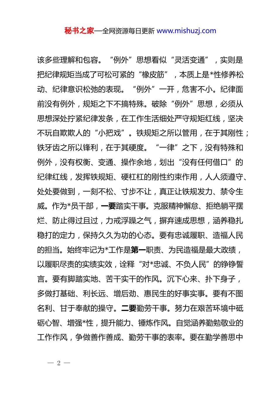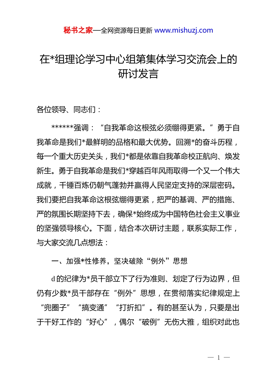 秘书之家—全网资源每日更新 www.mishuzj.com在*组理论学习中心组第集体学习交流会上的研讨发言各位领导、同志们:******强调:“自我革命这根弦必须绷得更紧。”勇于自我革命是我们*最鲜明的品格和最大优势。回溯*的奋斗历程,每一个重大历史关头,我们*都是依靠自我革命校正航向、焕发新生。勇于自我革命是我们*穿越百年风雨取得一个又一个伟大成就,千锤百炼仍朝气蓬勃并赢得人民坚定支持的深层密码。我们要把自我革命这根弦绷得更紧,把严的基调、严的措施、严的氛围长期坚持下去,确保*始终成为中国特色社会主义事业的坚强领导核心。下面,结合本次研讨主题,联系实际工作,与大家交流几点想法:一、加强*性修养,坚决破除“例外”思想d 的纪律为*员干部立下了行为准则、划定了行为边界,但仍有少数*员干部存在“例外”思想,在贯彻落实纪律规定上“兜圈子”“搞变通”“打折扣”。有的甚至认为,只要是出于干好工作的“好心”,偶尔“破例”无伤大雅,组织对此也— 1 —秘书之家—全网资源每日更新 www.mishuzj.com该多些理解和包容。“例外”思想看似“灵活变通”,实则是把纪律规矩当成了可松可紧的“橡皮筋”,本质上是*性修养松动、纪律意识松弛的表现。“例外”一开,危害不小。纪律面前没有例外,规矩之下不搞特殊。破除“例外”思想,必须从思想深处拧紧纪律发条,在工作生活细处严守规矩红线,坚决不玩自欺欺人的“小把戏”。铁规矩之所以管用,在于其刚性;铁牙齿之所以锋利,在于其硬度。“一律”之下,没有特殊和例外,没有权衡、变通、操作余地,划出“没有任何借口”的纪律红线,发挥铁规矩、硬杠杠的刚性约束作用,人人须遵守、处处要做到,一刻不松、寸步不让,真正让铁规发力、禁令生威。作为*员干部,一要踏实干事。克服精神懈怠、拒绝躺平摆烂、防止得过且过,力戒浮躁之气,摒弃速成思想,涵养稳扎稳打的定力,保持久久为功的心态。要有忠诚履职、造福人民的担当。始终牢记为*工作是第一职责、为民造福是最大政绩,以履职尽责的实绩实效,诠释“对*忠诚、不负人民”的铮铮誓言。要有脚踏实地、苦干实干的作风。沉下心来、扑下身子,多做打基础、利长远、增后劲、惠民生的好事实事。要有不图名利、甘于奉献的操守。二要勤劳干事。努力在艰苦环境中砥砺心智、增强*性,提升能力、锤炼作风。自觉涵养勤勉敬业的工作作风,争做善作善成、勤劳干事的表率。要在勤学善思中— 2 —秘书之家—全网资源每日更新 www.mishuzj.com增强本领。注重从*的科学理论中悟规律、明方向、学方法、增智慧,不断提高推动高质量发展本领、服务群众本领、防范化解风险本领。要在勤勉作为中推动发展。扛牢推动高质量发展之责,坚持干字当头,攻坚克难、奋发有为,确保经济平稳健康运行。三要廉洁干事。严守“纪与法”的底线,划清“公与私”的界限,把握“权与责”的边线,知责于心、担责于身、履责于行,做好遵规守纪的带头人,做到严于律己、严负其责、严管所辖,认真履行“一岗双责”,全面理解和执行纪律规定精神,督促分管领域*员干部在思想根源上把好关口,确保学习教育取得实实在在的成效。二、校准思想坐标,时刻谨防“惯性”陷阱现实中,一些*员干部在开展工作时存在“惯性”,习惯根据过往的经验办事。把不合时宜的观念、形式当成先例,照做照搬,难免会落入形式主义、官僚主义的窠臼。是按老办法做,还是打破“惯性”,关键就看这些做法是否符合 d 的纪律和规矩。按纪律规矩办事,才不会掉入“惯性”陷阱。学得深、悟得透,开展工作才不会跑偏,干事创业也才会更有底气。多看看纪律是怎么规定的,多想想所行所为符不符合纪律要求,多悟悟能干什么、不能干什么,就能在遵规守纪前提下,担当作— 3 —秘书之家—全网资源每日更新 www.mishuzj.com为、放手干事。一要保持正确方向“不偏移”。时刻保持政治上的清醒与坚定,深刻领悟“两个确立”的决定性意义,坚决做到“两个维护”,同*中央保持高度一致,不打折扣、不做选择、不搞变通,确保改革始终沿着正确政治方向前进。要深入学习领会*中央关于进一步全面深化改革的各项决策部署,通过补“钙”、充“电”...