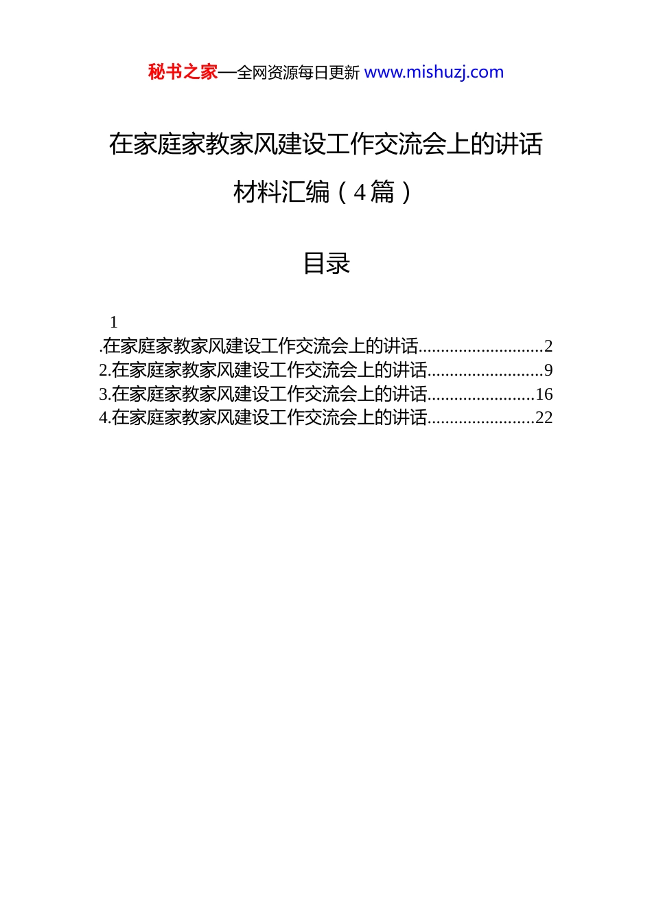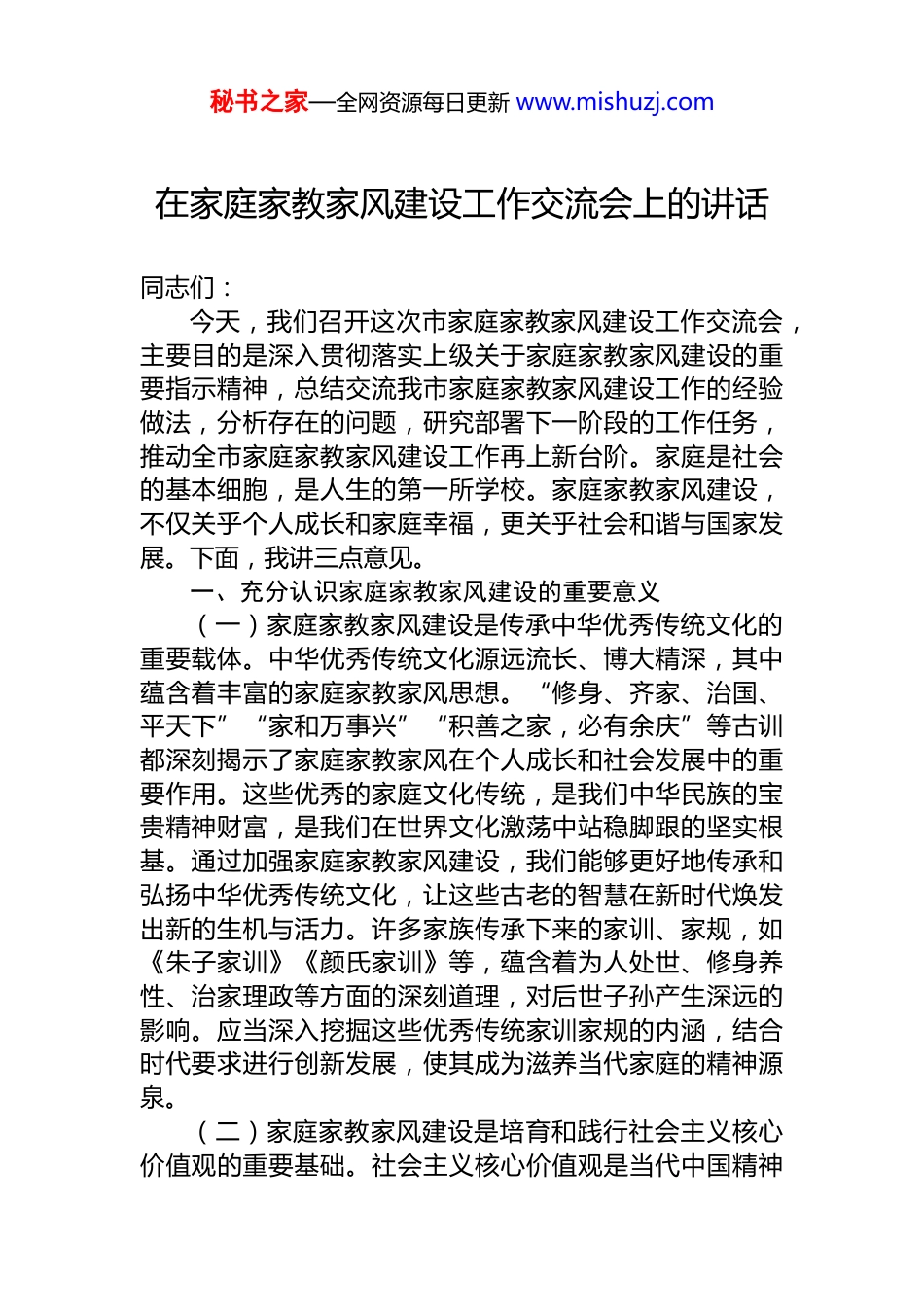 秘书之家—全网资源每日更新 www.mishuzj.com在家庭家教家风建设工作交流会上的讲话材料汇编(4 篇)目录1.在家庭家教家风建设工作交流会上的讲话............................22.在家庭家教家风建设工作交流会上的讲话..........................93.在家庭家教家风建设工作交流会上的讲话........................164.在家庭家教家风建设工作交流会上的讲话........................22秘书之家—全网资源每日更新 www.mishuzj.com在家庭家教家风建设工作交流会上的讲话同志们:今天,我们召开这次市家庭家教家风建设工作交流会,主要目的是深入贯彻落实上级关于家庭家教家风建设的重要指示精神,总结交流我市家庭家教家风建设工作的经验做法,分析存在的问题,研究部署下一阶段的工作任务,推动全市家庭家教家风建设工作再上新台阶。家庭是社会的基本细胞,是人生的第一所学校。家庭家教家风建设,不仅关乎个人成长和家庭幸福,更关乎社会和谐与国家发展。下面,我讲三点意见。一、充分认识家庭家教家风建设的重要意义(一)家庭家教家风建设是传承中华优秀传统文化的重要载体。中华优秀传统文化源远流长、博大精深,其中蕴含着丰富的家庭家教家风思想。“修身、齐家、治国、平天下”“家和万事兴”“积善之家,必有余庆”等古训都深刻揭示了家庭家教家风在个人成长和社会发展中的重要作用。这些优秀的家庭文化传统,是我们中华民族的宝贵精神财富,是我们在世界文化激荡中站稳脚跟的坚实根基。通过加强家庭家教家风建设,我们能够更好地传承和弘扬中华优秀传统文化,让这些古老的智慧在新时代焕发出新的生机与活力。许多家族传承下来的家训、家规,如《朱子家训》《颜氏家训》等,蕴含着为人处世、修身养性、治家理政等方面的深刻道理,对后世子孙产生深远的影响。应当深入挖掘这些优秀传统家训家规的内涵,结合时代要求进行创新发展,使其成为滋养当代家庭的精神源泉。(二)家庭家教家风建设是培育和践行社会主义核心价值观的重要基础。社会主义核心价值观是当代中国精神秘书之家—全网资源每日更新 www.mishuzj.com的集中体现,凝结着全体人民共同的价值追求。家庭是培育和践行社会主义核心价值观的起点和重要阵地。家庭成员之间的相互影响、相互教育,能够在潜移默化中塑造个人的价值观和道德品质。一个家庭如果倡导尊老爱幼、男女平等、夫妻和睦、勤俭持家、邻里团结等良好风尚,家庭成员就更容易形成爱国、敬业、诚信、友善等价值准则相反,如果家庭中存在不良风气,如自私自利、冷漠无情铺张浪费等,就会对家庭成员尤其是青少年的价值观形成产生负面影响。因此,加强家庭家教家风建设,能够为培育和践行社会主义核心价值观提供肥沃的土壤,使社会主义核心价值观在家庭中得到生动具体的实践和传承。(三)家庭家教家风建设是促进社会和谐稳定的重要保障。家庭是社会的细胞,家庭和谐是社会和谐的基础。一个家庭如果充满温馨、关爱和正能量,家庭成员之间相互理解、相互支持、相互包容,就能够为社会稳定奠定坚实的基础。相反,家庭矛盾频发、家庭关系紧张,不仅会影响家庭成员的身心健康和生活质量,还可能引发一系列社会问题。加强家庭家教家风建设,能够引导家庭成员树立正确的家庭观、婚姻观和亲子观,增强家庭凝聚力和向心力,有效预防和化解家庭矛盾,促进家庭和谐。良好的家庭家教家风还能够通过家庭成员的示范引领作用,影响和带动周围的人,形成良好的社会风尚,促进整个社会的和谐稳定。二、客观分析我市家庭家教家风建设工作的现状(一)取得的成绩。近年来,我市高度重视家庭家教家风建设工作,将其作为精神文明建设的重要内容,采取了一系列有效措施,取得了显著成效。一是工作机制不断完善。成立了由多个部门组成的家庭家教家风建设工作领导小组,明确了各部门职责,形成了党委领导、政府主导部门协作、社会参与的工作格局。同时,建立健全了工作考核评价机制,将家庭家教家风建设工作纳入精神文明建秘书之家—全网资源每日更新 www.mishuzj.com设考核体系,确保各项工作任务落到实处。二是宣传教育广泛深入。通过开展“最美家庭”“文明家庭”评选表彰...