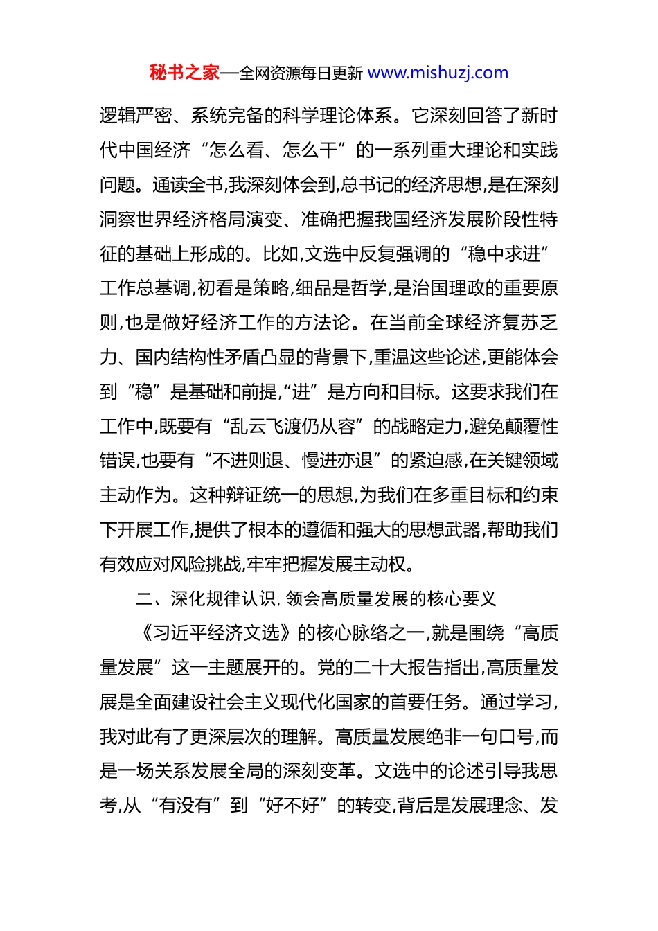 秘书之家—全网资源每日更新 www.mishuzj.com在局党委理论学习中心组《习近平经济文选》专题学习会上的研讨发言 尊敬的各位领导,同志们:大家好。根据本次中心组学习的安排,我就学习《习近平经济文选》第一卷,结合个人的一些思考,谈几点粗浅的感悟和体会,希望能与大家交流互鉴,共同提高。今年 3 月,《习近平经济文选》第一卷正式出版发行,这在全党全国的政治经济生活中都是一件大事。这部文选系统收录了总书记从 2012 年 11 月到 2024 年 12 月间关于经济工作最重要、最核心的著作,可以说是一部思想深邃、内涵丰富的马克思主义政治经济学中国化时代化的光辉文献。初读这部著作,给我的整体感受是震撼,再读则感到解渴,细读之后更觉责任重大。它不仅是我们理解中国经济发展脉络的“全景图”,更是我们应对当前复杂局面、推动未来发展的“指南针”。下面,我围绕学习过程中的几点核心触动,与大家作一分享。一、感悟思想伟力,把握经济工作的根本遵循学习《习近平经济文选》,首先感受到的是其蕴含的磅礴思想伟力。这部文选不是零散论述的简单汇编,而是一个秘书之家—全网资源每日更新 www.mishuzj.com逻辑严密、系统完备的科学理论体系。它深刻回答了新时代中国经济“怎么看、怎么干”的一系列重大理论和实践问题。通读全书,我深刻体会到,总书记的经济思想,是在深刻洞察世界经济格局演变、准确把握我国经济发展阶段性特征的基础上形成的。比如,文选中反复强调的“稳中求进”工作总基调,初看是策略,细品是哲学,是治国理政的重要原则,也是做好经济工作的方法论。在当前全球经济复苏乏力、国内结构性矛盾凸显的背景下,重温这些论述,更能体会到“稳”是基础和前提,“进”是方向和目标。这要求我们在工作中,既要有“乱云飞渡仍从容”的战略定力,避免颠覆性错误,也要有“不进则退、慢进亦退”的紧迫感,在关键领域主动作为。这种辩证统一的思想,为我们在多重目标和约束下开展工作,提供了根本的遵循和强大的思想武器,帮助我们有效应对风险挑战,牢牢把握发展主动权。二、深化规律认识,领会高质量发展的核心要义《习近平经济文选》的核心脉络之一,就是围绕“高质量发展”这一主题展开的。党的二十大报告指出,高质量发展是全面建设社会主义现代化国家的首要任务。通过学习,我对此有了更深层次的理解。高质量发展绝非一句口号,而是一场关系发展全局的深刻变革。文选中的论述引导我思考,从“有没有”到“好不好”的转变,背后是发展理念、发秘书之家—全网资源每日更新 www.mishuzj.com展方式的根本性转变。特别是“新发展理念”的提出,创新、协调、绿色、开放、共享,构成了一个有机整体,系统回答了关于发展的目的、动力、方式、路径等一系列问题。近期中央反复强调的“新质生产力”,正是践行新发展理念、推动高质量发展的内在要求和重要着力点。这对我触动很大。过去,我们谈发展,可能更多关注的是增长速度、项目投资额这些量化指标。现在,学习了总书记的经济思想,我认识到,必须把关注点更多地转移到发展的质量和效益上来。具体到我们*市*局的工作,就不能仅仅满足于完成多少招商引资任务、审批了多少项目,更要思考这些项目是否符合新发展理念,技术含量高不高、环境影响如何、带动就业效果好不好,是否能真正促进区域产业的转型升级和可持续发展。这种从“量”到“质”的思维跃迁,是学习带来的最直接的思想收获。三、坚持问题导向,探寻破解难题的科学方法总书记的经济思想,具有鲜明的问题导向和实践品格。文选中的许多篇章,都是针对经济运行中的突出矛盾和问题展开的,既有精准的“诊断”,也开出了管用的“药方”。例如,关于处理好政府和市场关系的论述,就深刻阐明了“看得见的手”和“看不见的手”各自的功能定位和协同配合之道,为我们深化“放管服”改革、优化营商环境指明了方秘书之家—全网资源每日更新 www.mishuzj.com向。让我印象尤其深刻的,是文选中处处闪耀的科学方法论光芒。比如,坚持系统观念,强调整体谋划、协同推进,反对“单兵突进”和“头痛医头、脚痛医脚”。再比如,坚持底线思维,要求我们增强忧患意识,做到居安思危、未雨绸缪。在读到《脱贫攻坚必须在精准上出实招下实功见实...