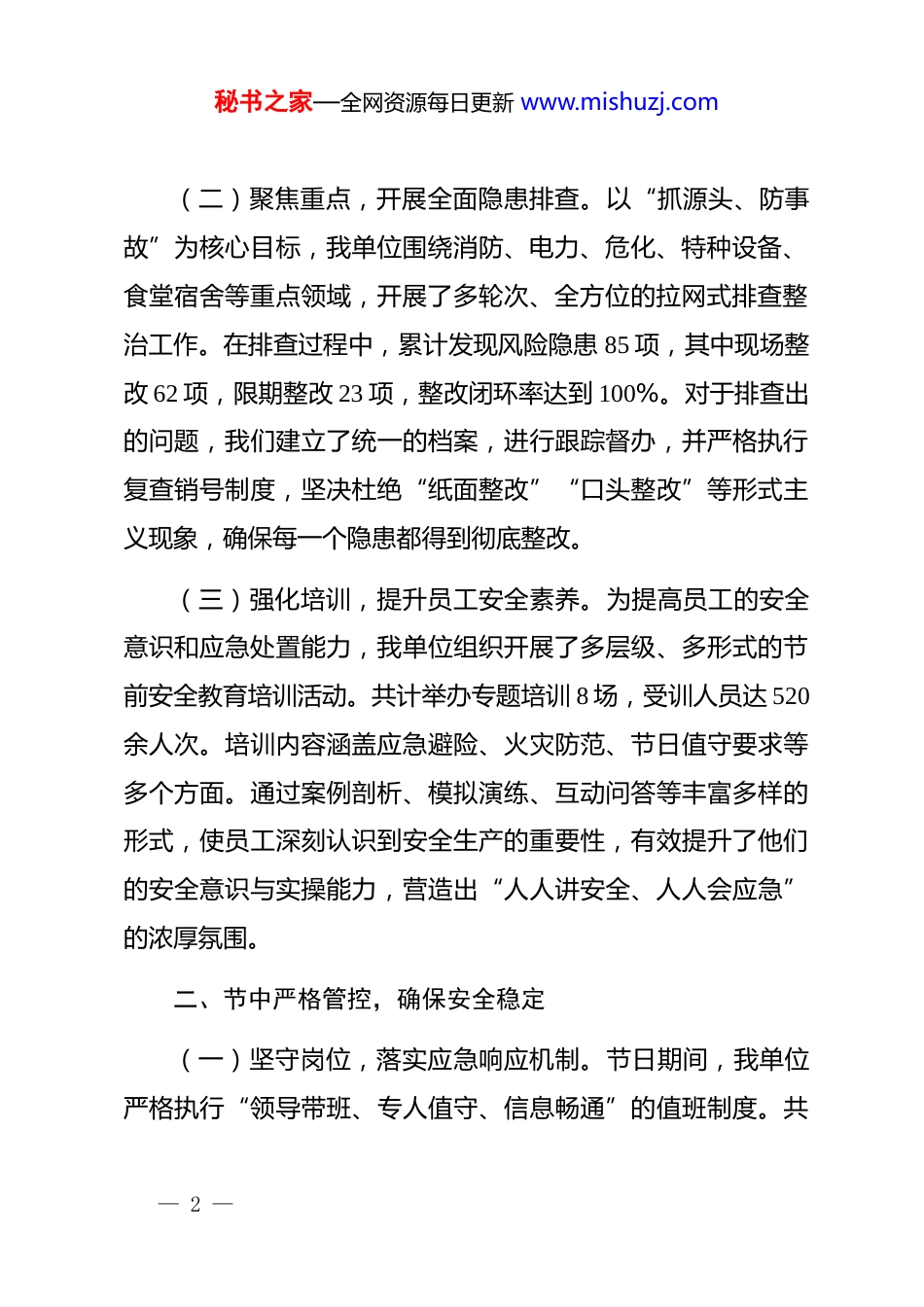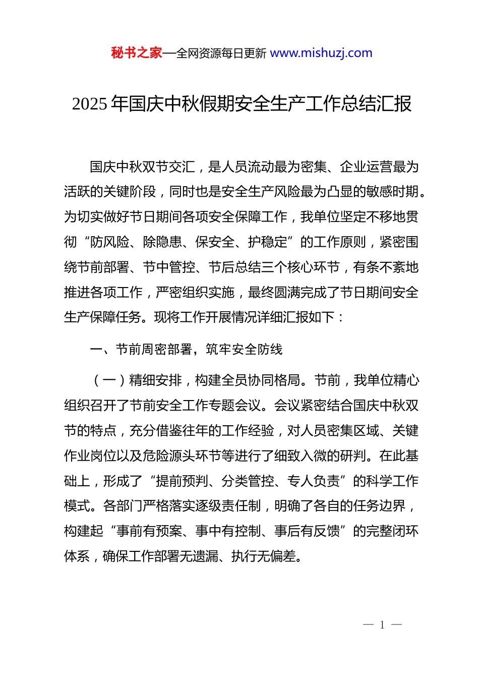 秘书之家—全网资源每日更新 www.mishuzj.com2025 年国庆中秋假期安全生产工作总结汇报国庆中秋双节交汇,是人员流动最为密集、企业运营最为活跃的关键阶段,同时也是安全生产风险最为凸显的敏感时期。为切实做好节日期间各项安全保障工作,我单位坚定不移地贯彻“防风险、除隐患、保安全、护稳定”的工作原则,紧密围绕节前部署、节中管控、节后总结三个核心环节,有条不紊地推进各项工作,严密组织实施,最终圆满完成了节日期间安全生产保障任务。现将工作开展情况详细汇报如下:一、节前周密部署,筑牢安全防线(一)精细安排,构建全员协同格局。节前,我单位精心组织召开了节前安全工作专题会议。会议紧密结合国庆中秋双节的特点,充分借鉴往年的工作经验,对人员密集区域、关键作业岗位以及危险源头环节等进行了细致入微的研判。在此基础上,形成了“提前预判、分类管控、专人负责”的科学工作模式。各部门严格落实逐级责任制,明确了各自的任务边界,构建起“事前有预案、事中有控制、事后有反馈”的完整闭环体系,确保工作部署无遗漏、执行无偏差。— 1 —秘书之家—全网资源每日更新 www.mishuzj.com(二)聚焦重点,开展全面隐患排查。以“抓源头、防事故”为核心目标,我单位围绕消防、电力、危化、特种设备、食堂宿舍等重点领域,开展了多轮次、全方位的拉网式排查整治工作。在排查过程中,累计发现风险隐患 85 项,其中现场整改 62 项,限期整改 23 项,整改闭环率达到 100%。对于排查出的问题,我们建立了统一的档案,进行跟踪督办,并严格执行复查销号制度,坚决杜绝“纸面整改”“口头整改”等形式主义现象,确保每一个隐患都得到彻底整改。(三)强化培训,提升员工安全素养。为提高员工的安全意识和应急处置能力,我单位组织开展了多层级、多形式的节前安全教育培训活动。共计举办专题培训 8 场,受训人员达 520余人次。培训内容涵盖应急避险、火灾防范、节日值守要求等多个方面。通过案例剖析、模拟演练、互动问答等丰富多样的形式,使员工深刻认识到安全生产的重要性,有效提升了他们的安全意识与实操能力,营造出“人人讲安全、人人会应急”的浓厚氛围。二、节中严格管控,确保安全稳定(一)坚守岗位,落实应急响应机制。节日期间,我单位严格执行“领导带班、专人值守、信息畅通”的值班制度。共— 2 —秘书之家—全网资源每日更新 www.mishuzj.com设置值守岗点 15 处,配备应急队员 45 人,并备齐了应急物资、通讯设备和处突预案,确保应急响应随时待命。值班人员严格按照要求每日记录、上传、汇总值班日志,确保信息传递及时、准确,指令执行高效,做到“问题发现早、处置反应快、执行力过硬”。(二)紧盯现场,加强巡查监管力度。为及时发现和消除安全隐患,我们进一步加密了重点区域现场巡查频次,每天至少安排 3 轮次专人巡视。重点对车间设备运行、配电房温控、易燃易爆物品储存区等高风险场所进行全方位看护。实行“问题即发现、责任即落实、整改即回访”的工作机制,确保安全监管动态化、全覆盖、零死角,有效防范了各类安全事故的发生。(三)规范行为,强化操作流程管理。加强对一线岗位员工作业行为的管控力度,重点查处违章操作、私自拆改设施、擅自进入禁区等高风险行为。通过监控实时抽查、岗位责任追踪、现场规范纠偏等多种手段,严肃处理了 5 起违规操作行为,起到了强烈的震慑与警示作用,促使全员自觉遵守操作规范,牢固树立“思想防线+制度防线”的安全理念。三、节后深入总结,完善长效机制— 3 —秘书之家—全网资源每日更新 www.mishuzj.com(一)全面复盘,总结经验教训。节日结束后,我单位及时组织召开了安全生产工作总结会议,对国庆中秋假期期间的安全生产工作进行了全面复盘。深入分析了工作中存在的问题和不足,总结了成功经验和有效做法。通过总结,我们发现部分员工在应急处置过程中存在反应不够迅速、操作不够熟练的问题,同时在安全管理制度的执行上还存在一些薄弱环节。(二)整改提升,补齐安全短板。针对总结中发现的问题我们制定了详细的整改措施,明确了责任人和整改期限。加强对应急...
