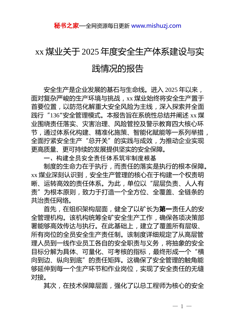 秘书之家—全网资源每日更新 www.mishuzj.comxx 煤业关于 2025 年度安全生产体系建设与实践情况的报告安全生产是企业发展的基石与生命线。进入 2025 年以来,面对复杂严峻的生产环境与挑战,xx 煤业始终将安全生产置于首要位置,以防范化解重大安全风险为主线,深入探索并全面践行“136”安全管理模式。本报告旨在系统性总结并阐述 xx 煤业围绕责任落实、灾害治理、风险管控及警示教育四大核心环节,通过体系化构建、精准化施策、智能化赋能等一系列举措,全面拧紧安全生产“总开关”的实践与成效,为推动企业实现更高质量、更可持续的发展提供坚实的安全保障。一、构建全员安全责任体系筑牢制度根基制度的生命力在于执行,而责任的落实是执行的根本保障。xx 煤业深刻认识到,安全生产管理的核心在于构建一个权责明晰、运转高效的责任体系。为此,单位以“层层负责、人人有责”为根本原则,致力于打造一个全方位、全覆盖、全链条的共治责任网络。首先,在组织架构层面,健全了以矿长为第一责任人的安全管理机构。该机构统筹全矿安全生产工作,确保各项决策部署能够高效传达与执行。在此基础上,建立了覆盖所有层级、所有岗位的全员安全生产责任制。该制度详细规定了从高层管理人员到一线作业员工各自的安全职责与义务,将抽象的安全目标分解为具体、可量化、可考核的指标,最终形成一个“横向到边、纵向到底”的责任矩阵。这确保了安全管理的触角能够延伸到每一个生产环节和作业岗位,实现了安全责任的无缝对接。其次,在技术保障层面,强化了以总工程师为核心的安全— 1 —秘书之家—全网资源每日更新 www.mishuzj.com技术管理体系。总工程师及其技术团队在安全技术领域被赋予了充分的决策权、指挥权以及至关重要的“一票否决权”。这意味着任何规程措施的编制、审批与落实,都必须经过严格的技术论证和把关。从源头上杜绝了因技术方案不科学、不严谨而可能引发的安全隐患,确保了各项生产作业活动均在科学、可靠的技术指导下进行。再者,在监督考核层面,创新并实施了“五查联动”机制。该机制整合了员工自查、区队部门检查、矿级综合检查、专项重点检查以及专兼职安全协防人员检查五种监督力量,形成了一股强大的监督合力。检查发现的问题与隐患,将直接与相关单位及个人的绩效薪酬、评优评先等切身利益挂钩。通过构建“监督-检查-整改-考核”的闭环管理流程,极大地提升了各级人员履行安全职责的主动性与自觉性,推动了安全责任从“纸面”真正落到“地面”。二、运用科技创新手段提升灾害治理能力煤矿生产面临的瓦斯、水、火、顶板等重大灾害是安全管理中必须攻克的难题。xx 煤业坚持“源头预防、科技先行”的理念,将科技创新与装备升级作为筑牢重大灾害“防火墙”的关键支撑,构建了专业化、系统化的灾害治理体系。在采掘技术创新方面,积极推广应用无煤柱与小煤柱开采技术。例如,在 x 工作面成功应用了无煤柱开采技术,而在 x工作面则应用了小煤柱技术。这些先进技术的应用,不仅显著提高了煤炭资源回收率,实现了煤炭的精采细采,更重要的是,其从根本上优化了矿井的应力分布,减少了矿压显现强度,为实现安全开采与绿色开采的有机统一提供了技术路径。同时,针对综采工作面两顺槽顶板管理这一长期存在的难题,单位成功实施了爆破预裂切顶卸压技术。该技术通过精确控制的爆破,有效转移和释放了顶板应力,极大地保障了回采期间的顶板稳定性,降低了冒顶事故的风险。— 2 —秘书之家—全网资源每日更新 www.mishuzj.com在生产装备升级方面,实现了关键作业环节的现代化与自动化。目前,所有掘进工作面均配备了“掘进机+锚杆钻车+皮带自移机尾”的成套先进设备。这一组合不仅将工人从高强度的体力劳动中解放出来,大幅提升了开掘效率,更重要的是,减少了人工作业环节,从而降低了人为失误的概率,为作业人员提供了更可靠的安全保障。在职业健康防护方面,井下作业环境得到了显著改善。通过推广应用双向自动隔爆装置、自动净化水幕等高效除尘设备,并配合掘进面湿式除-尘器的使用,作业场所的粉尘浓度得到了有效控制,为员工创造了更为健康的作业环境。...