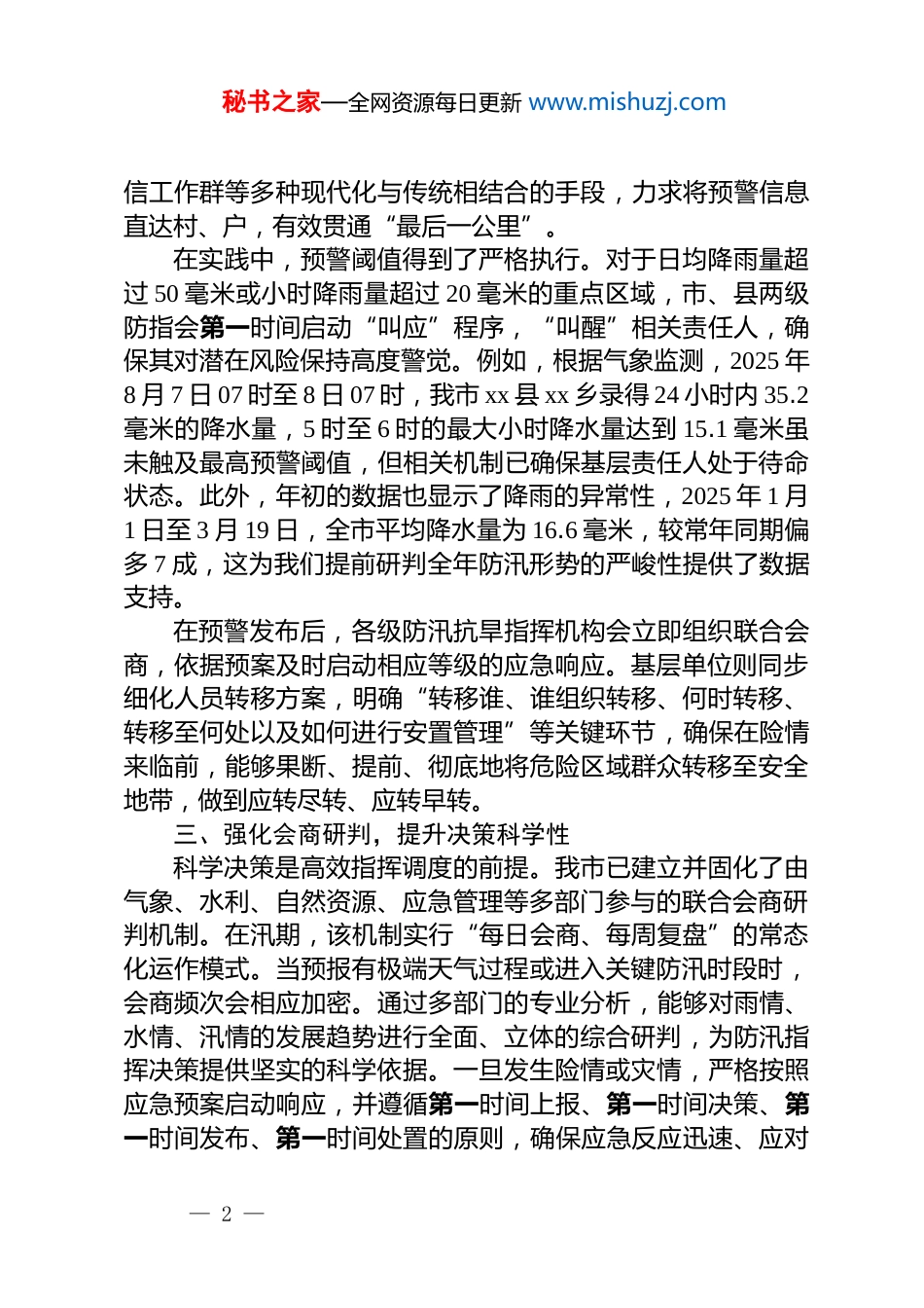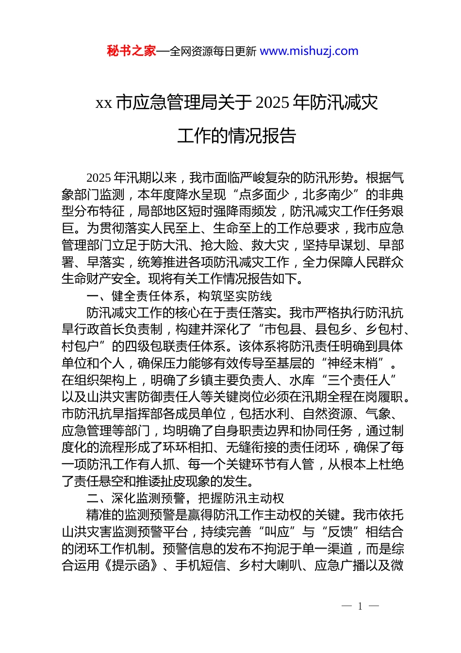 秘书之家—全网资源每日更新 www.mishuzj.comxx 市应急管理局关于 2025 年防汛减灾工作的情况报告2025 年汛期以来,我市面临严峻复杂的防汛形势。根据气象部门监测,本年度降水呈现“点多面少,北多南少”的非典型分布特征,局部地区短时强降雨频发,防汛减灾工作任务艰巨。为贯彻落实人民至上、生命至上的工作总要求,我市应急管理部门立足于防大汛、抢大险、救大灾,坚持早谋划、早部署、早落实,统筹推进各项防汛减灾工作,全力保障人民群众生命财产安全。现将有关工作情况报告如下。一、健全责任体系,构筑坚实防线防汛减灾工作的核心在于责任落实。我市严格执行防汛抗旱行政首长负责制,构建并深化了“市包县、县包乡、乡包村、村包户”的四级包联责任体系。该体系将防汛责任明确到具体单位和个人,确保压力能够有效传导至基层的“神经末梢”。在组织架构上,明确了乡镇主要负责人、水库“三个责任人”以及山洪灾害防御责任人等关键岗位必须在汛期全程在岗履职。市防汛抗旱指挥部各成员单位,包括水利、自然资源、气象、应急管理等部门,均明确了自身职责边界和协同任务,通过制度化的流程形成了环环相扣、无缝衔接的责任闭环,确保了每一项防汛工作有人抓、每一个关键环节有人管,从根本上杜绝了责任悬空和推诿扯皮现象的发生。二、深化监测预警,把握防汛主动权精准的监测预警是赢得防汛工作主动权的关键。我市依托山洪灾害监测预警平台,持续完善“叫应”与“反馈”相结合的闭环工作机制。预警信息的发布不拘泥于单一渠道,而是综合运用《提示函》、手机短信、乡村大喇叭、应急广播以及微— 1 —秘书之家—全网资源每日更新 www.mishuzj.com信工作群等多种现代化与传统相结合的手段,力求将预警信息直达村、户,有效贯通“最后一公里”。在实践中,预警阈值得到了严格执行。对于日均降雨量超过 50 毫米或小时降雨量超过 20 毫米的重点区域,市、县两级防指会第一时间启动“叫应”程序,“叫醒”相关责任人,确保其对潜在风险保持高度警觉。例如,根据气象监测,2025 年8 月 7 日 07 时至 8 日 07 时,我市 xx 县 xx 乡录得 24 小时内 35.2毫米的降水量,5 时至 6 时的最大小时降水量达到 15.1 毫米虽未触及最高预警阈值,但相关机制已确保基层责任人处于待命状态。此外,年初的数据也显示了降雨的异常性,2025 年 1 月1 日至 3 月 19 日,全市平均降水量为 16.6 毫米,较常年同期偏多 7 成,这为我们提前研判全年防汛形势的严峻性提供了数据支持。在预警发布后,各级防汛抗旱指挥机构会立即组织联合会商,依据预案及时启动相应等级的应急响应。基层单位则同步细化人员转移方案,明确“转移谁、谁组织转移、何时转移、转移至何处以及如何进行安置管理”等关键环节,确保在险情来临前,能够果断、提前、彻底地将危险区域群众转移至安全地带,做到应转尽转、应转早转。三、强化会商研判,提升决策科学性科学决策是高效指挥调度的前提。我市已建立并固化了由气象、水利、自然资源、应急管理等多部门参与的联合会商研判机制。在汛期,该机制实行“每日会商、每周复盘”的常态化运作模式。当预报有极端天气过程或进入关键防汛时段时,会商频次会相应加密。通过多部门的专业分析,能够对雨情、水情、汛情的发展趋势进行全面、立体的综合研判,为防汛指挥决策提供坚实的科学依据。一旦发生险情或灾情,严格按照应急预案启动响应,并遵循第一时间上报、第一时间决策、第一时间发布、第一时间处置的原则,确保应急反应迅速、应对— 2 —秘书之家—全网资源每日更新 www.mishuzj.com措施精准有效。四、严抓隐患排查,筑牢安全堤坝防汛工作重在“防”,隐患排查是防范风险的第一道关口。我市坚持“汛期不过、检查不止”的原则,由市防汛抗旱指挥部办公室牵头,组建了多个综合督查组,并联合相关行业主管部门,持续开展拉网式、全覆盖的专项督查。督查工作聚焦于河道行洪区、各类水库大坝、城市低洼易涝点、地质灾害隐患点等重点区域和关键设施。对于排查出的各类安全隐患,一律建立问题台账,明确整改责任单位、责任人和完成时限,实...