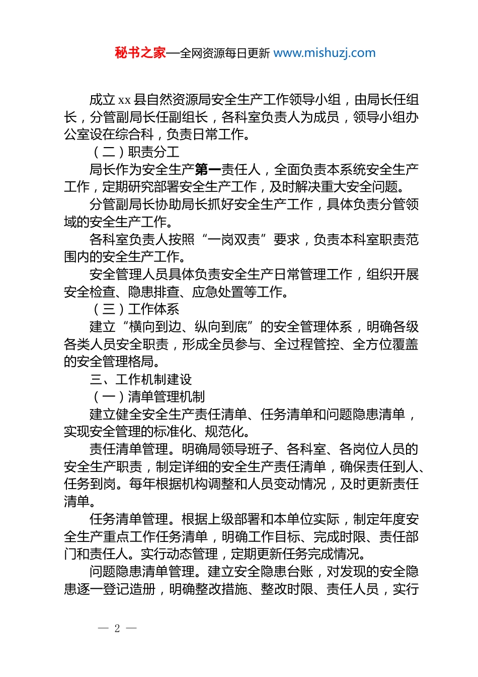 秘书之家—全网资源每日更新 www.mishuzj.comxx 县自然资源局资源安全工作机制为深入贯彻******关于安全生产和自然资源工作的重要论述,全面落实*中央、国务院关于安全生产的决策部署,按照“管行业必须管安全、管业务必须管安全、管生产经营必须管安全”的要求,切实维护自然资源领域安全稳定,特制定本工作机制。一、指导思想和基本原则(一)指导思想以**************思想为指导,深入贯彻*的二十大精神,坚持人民至上、生命至上,牢固树立总体国家安全观,强化安全生产红线意识和底线思维,统筹发展和安全,建立健全自然资源安全工作长效机制,为保障自然资源事业高质量发展提供坚强安全保障。(二)基本原则坚持*的领导。把*的领导贯穿于自然资源安全工作全过程,确保*中央关于安全生产的重大决策部署在自然资源系统得到全面贯彻落实。坚持人民至上。始终把人民群众生命财产安全放在第一位,切实保障从业人员和人民群众的安全。坚持预防为主。强化风险意识,建立健全风险分级管控和隐患排查治理双重预防机制,从源头上防范化解安全风险。坚持系统治理。统筹推进自然资源各领域安全工作,形成齐抓共管、协同配合的工作格局。坚持依法监管。严格按照法律法规履行安全监管职责,依法依规开展安全管理工作。二、组织体系与职责分工(一)组织架构— 1 —秘书之家—全网资源每日更新 www.mishuzj.com成立 xx 县自然资源局安全生产工作领导小组,由局长任组长,分管副局长任副组长,各科室负责人为成员,领导小组办公室设在综合科,负责日常工作。(二)职责分工局长作为安全生产第一责任人,全面负责本系统安全生产工作,定期研究部署安全生产工作,及时解决重大安全问题。分管副局长协助局长抓好安全生产工作,具体负责分管领域的安全生产工作。各科室负责人按照“一岗双责”要求,负责本科室职责范围内的安全生产工作。安全管理人员具体负责安全生产日常管理工作,组织开展安全检查、隐患排查、应急处置等工作。(三)工作体系建立“横向到边、纵向到底”的安全管理体系,明确各级各类人员安全职责,形成全员参与、全过程管控、全方位覆盖的安全管理格局。三、工作机制建设(一)清单管理机制建立健全安全生产责任清单、任务清单和问题隐患清单,实现安全管理的标准化、规范化。责任清单管理。明确局领导班子、各科室、各岗位人员的安全生产职责,制定详细的安全生产责任清单,确保责任到人、任务到岗。每年根据机构调整和人员变动情况,及时更新责任清单。任务清单管理。根据上级部署和本单位实际,制定年度安全生产重点工作任务清单,明确工作目标、完成时限、责任部门和责任人。实行动态管理,定期更新任务完成情况。问题隐患清单管理。建立安全隐患台账,对发现的安全隐患逐一登记造册,明确整改措施、整改时限、责任人员,实行— 2 —秘书之家—全网资源每日更新 www.mishuzj.com闭环管理,确保隐患及时消除。(二)风险分级管控机制建立覆盖自然资源各业务领域的风险分级管控体系,实现安全风险的精准识别、科学评估、有效管控。风险识别评估。定期组织开展安全风险辨识评估,针对地质勘查、测绘作业、矿山监管、不动产登记、执法检查等重点领域,系统识别各类安全风险点。建立风险数据库,实行动态更新。风险分级管控。按照风险程度,将安全风险分为重大风险、较大风险、一般风险和低风险四个等级,分别用红、橙、黄、蓝四种颜色标示,制定相应的管控措施。对重大风险实行重点监控,制定专项管控方案。风险管控责任。明确各级风险的管控责任,建立风险管控责任体系。重大风险由局长负责管控,较大风险由分管副局长负责管控,一般风险和低风险由相关科室负责人负责管控。(三)隐患排查治理机制建立“全覆盖、零容忍、严执法、重实效”的隐患排查治理机制,确保安全隐患及时发现、及时整改。定期排查。制定隐患排查计划,按照日常检查、专项检查、综合检查相结合的方式,定期组织开展安全隐患排查。日常检查由各科室负责,每周不少于 1 次;专项检查由安全管理部门组织,每月不少于 1 次;综合检查由局领导带队,每季度不少于 1 次。重点排查。结合季节特...