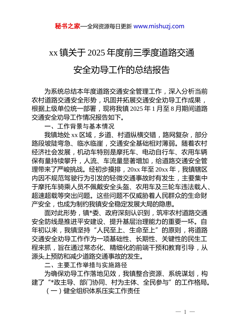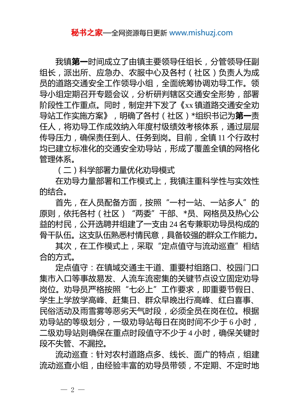秘书之家—全网资源每日更新 www.mishuzj.comxx 镇关于 2025 年度前三季度道路交通安全劝导工作的总结报告为系统总结本年度道路交通安全管理工作,深入分析当前农村道路交通安全形势,巩固并拓展交通安全劝导工作成果,根据上级单位统一部署,现将我镇 2025 年 1 月至 8 月期间道路交通安全劝导工作情况报告如下。一、工作背景与基本情况我镇地处 xx 区域,乡道、村道纵横交错,路网复杂,部分路段坡陡弯急、临水临崖,交通安全基础相对薄弱。随着农村经济社会发展,机动车特别是摩托车、电动自行车、农用车辆保有量持续攀升,人流、车流量显著增加,给道路交通安全管理带来了严峻挑战。经初步摸排,20xx 年至 20xx 年,我镇辖区内因不规范驾驶行为引发的轻微交通事故时有发生,主要集中于摩托车骑乘人员不佩戴安全头盔、农用车及三轮车违法载人、超速超载等突出问题。这些问题不仅威胁着人民群众的生命财产安全,也成为制约我镇安全稳定发展大局的隐患。面对此形势,镇*委、政府深刻认识到,筑牢农村道路交通安全防线是推进平安建设、提升基层治理能力的重要一环。自年初以来,我镇坚持“人民至上、生命至上”的原则,将道路交通安全劝导工作作为一项基础性、长期性、关键性的民生工程来抓,旨在通过常态化、精细化的前端干预和教育引导,从源头上预防和减少道路交通事故的发生。二、主要工作举措与实施路径为确保劝导工作落地见效,我镇整合资源、系统谋划,构建了“*政主导、部门协同、村为主体、全民参与”的工作格局。(一)健全组织体系压实工作责任— 1 —秘书之家—全网资源每日更新 www.mishuzj.com我镇第一时间成立了由镇主要领导任组长,分管领导任副组长,派出所、应急办、农服中心及各村(社区)负责人为成员的道路交通安全工作领导小组,全面统筹协调劝导工作。领导小组定期召开专题会议,分析研判辖区交通安全形势,部署阶段性工作重点。同时,制定并下发了《xx 镇道路交通安全劝导站工作实施方案》,明确了各村(社区)*组织书记为第一责任人,将劝导工作成效纳入年度村级绩效考核体系,通过层层传导压力,确保责任到人、任务到岗。目前,全镇 11 个行政村均已建立标准化的交通安全劝导站,形成了覆盖全镇的网格化管理体系。(二)科学部署力量优化劝导模式在劝导力量部署和工作模式上,我镇注重科学性与实效性的结合。首先,在人员配备方面,按照“一村一站、一站多人”的原则,依托各村(社区)“两委”干部、*员、网格员及热心公益的村民,公开选聘并组建了一支由 24 名专兼职劝导员构成的骨干队伍。这支队伍熟悉村情民意,具备较强的群众工作能力。其次,在工作模式上,采取“定点值守与流动巡查”相结合的方式。定点值守:在镇域交通主干道、重要村组路口、校园门口集市入口等事故易发、人流车流密集的关键节点设立固定劝导岗位。劝导员严格按照“七必上”工作要求,即重要节假日、学生上学放学高峰、赶集日、群众早晚出行高峰、红白喜事、民俗活动及雨雪雾等恶劣天气时段,必须全员在岗在位。根据劝导站的等级划分,一级劝导站每日在岗时间不少于 6 小时,二级劝导站则确保在重点时段值守不少于 4 小时,确保关键时段不失管、不漏控。流动巡查:针对农村道路点多、线长、面广的特点,组建流动巡查小组,由经验丰富的劝导员带领,不定期、不定时地— 2 —秘书之家—全网资源每日更新 www.mishuzj.com对辖区内易被忽视的“毛细血管”道路进行动态巡查,及时发现并纠正隐蔽的交通违法行为,弥补固定岗位的覆盖盲区。(三)强化业务培训提升履职能力为打造一支专业、规范的劝导员队伍,我镇联合 xx 县公安局交警大队、辖区派出所,定期组织开展业务培训。培训内容涵盖《道路交通安全法》等法律法规、常见交通违法行为的识别与危害、规范的劝导手势与用语、现场安全防护知识以及突发事件的初步处置流程。通过“理论讲解+案例分析+现场演练”的模式,确保每一位劝导员都能准确掌握工作职责与操作规程,做到文明劝导、依法劝导、有效劝导,提升其履职的专业性和权威性。(四)聚焦重点违法精准开展劝导工作中,劝导员紧盯农村地区...