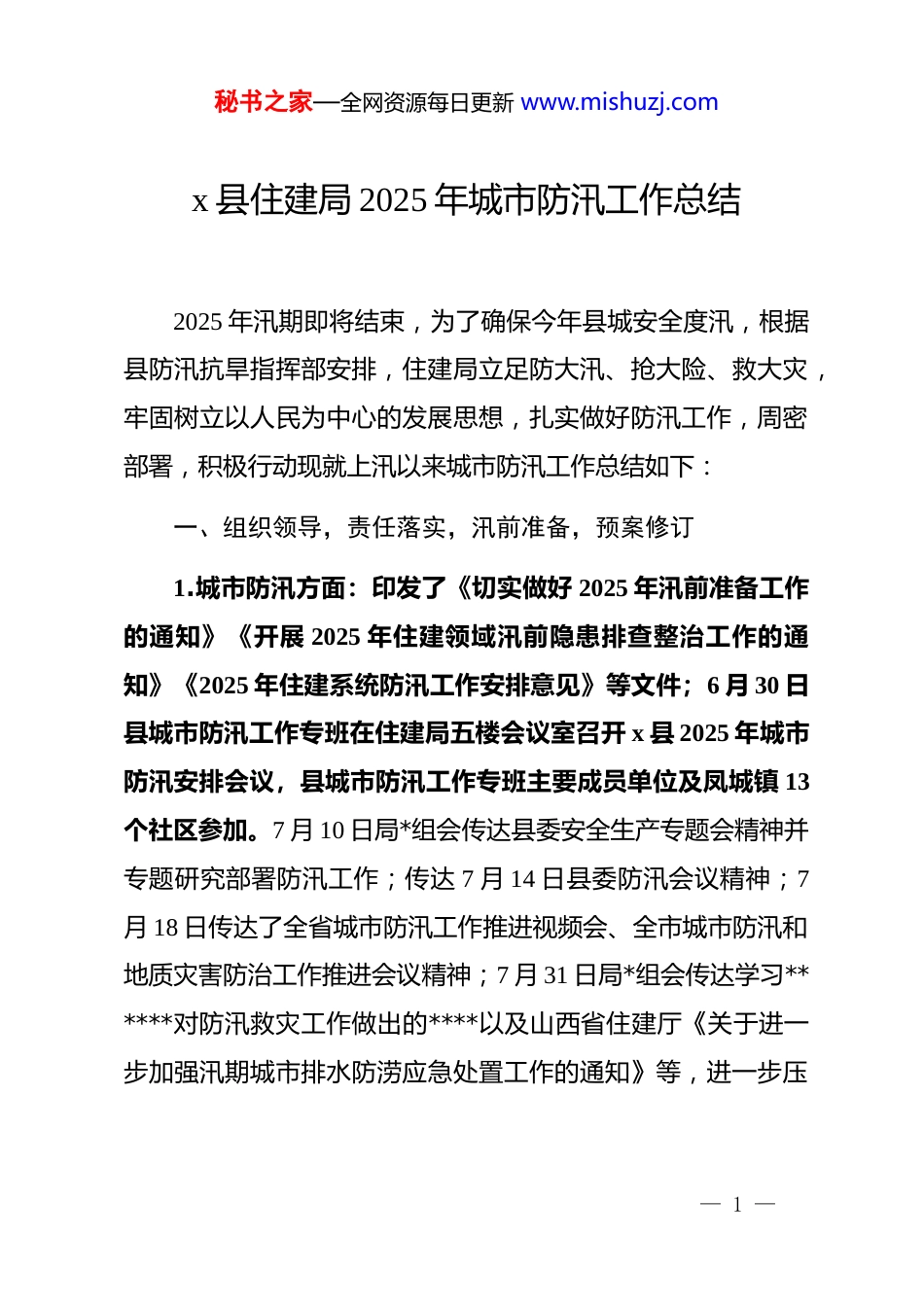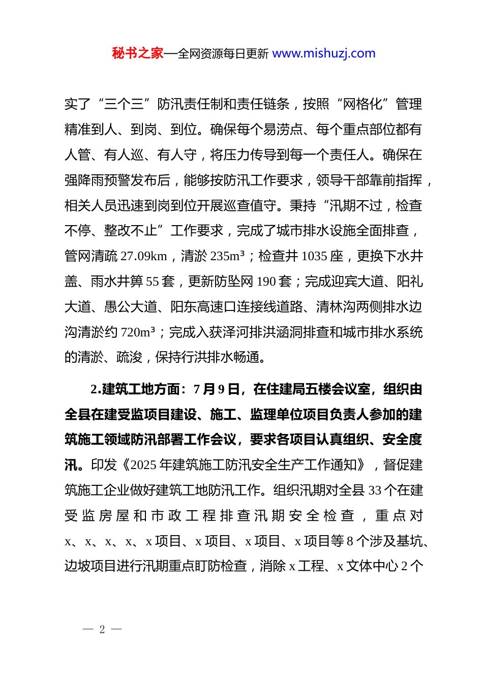秘书之家—全网资源每日更新 www.mishuzj.comx 县住建局 2025 年城市防汛工作总结2025 年汛期即将结束,为了确保今年县城安全度汛,根据县防汛抗旱指挥部安排,住建局立足防大汛、抢大险、救大灾,牢固树立以人民为中心的发展思想,扎实做好防汛工作,周密部署,积极行动现就上汛以来城市防汛工作总结如下:一、组织领导,责任落实,汛前准备,预案修订1.城市防汛方面:印发了《切实做好 2025 年汛前准备工作的通知》《开展 2025 年住建领域汛前隐患排查整治工作的通知》《2025 年住建系统防汛工作安排意见》等文件;6 月 30 日县城市防汛工作专班在住建局五楼会议室召开 x 县 2025 年城市防汛安排会议,县城市防汛工作专班主要成员单位及凤城镇 13个社区参加。7 月 10 日局*组会传达县委安全生产专题会精神并专题研究部署防汛工作;传达 7 月 14 日县委防汛会议精神;7月 18 日传达了全省城市防汛工作推进视频会、全市城市防汛和地质灾害防治工作推进会议精神;7 月 31 日局*组会传达学习******对防汛救灾工作做出的****以及山西省住建厅《关于进一步加强汛期城市排水防涝应急处置工作的通知》等,进一步压— 1 —秘书之家—全网资源每日更新 www.mishuzj.com实了“三个三”防汛责任制和责任链条,按照“网格化”管理精准到人、到岗、到位。确保每个易涝点、每个重点部位都有人管、有人巡、有人守,将压力传导到每一个责任人。确保在强降雨预警发布后,能够按防汛工作要求,领导干部靠前指挥,相关人员迅速到岗到位开展巡查值守。秉持“汛期不过,检查不停、整改不止”工作要求,完成了城市排水设施全面排查,管网清疏 27.09km,清淤 235m³;检查井 1035 座,更换下水井盖、雨水井箅 55 套,更新防坠网 190 套;完成迎宾大道、阳礼大道、愚公大道、阳东高速口连接线道路、清林沟两侧排水边沟清淤约 720m³;完成入获泽河排洪涵洞排查和城市排水系统的清淤、疏浚,保持行洪排水畅通。2.建筑工地方面:7 月 9 日,在住建局五楼会议室,组织由全县在建受监项目建设、施工、监理单位项目负责人参加的建筑施工领域防汛部署工作会议,要求各项目认真组织、安全度汛。印发《2025 年建筑施工防汛安全生产工作通知》,督促建筑施工企业做好建筑工地防汛工作。组织汛期对全县 33 个在建受 监 房 屋 和 市 政 工 程 排 查 汛 期 安 全 检 查 , 重 点 对x、x、x、x、x 项目、x 项目、x 项目、x 项目等 8 个涉及基坑、边坡项目进行汛期重点盯防检查,消除 x 工程、x 文体中心 2 个— 2 —秘书之家—全网资源每日更新 www.mishuzj.com汛期安全风险点,我局累计出动 57 人次,对建筑施工现场防汛工作落实情况进行日常巡查和抽查,结合市局交叉互检,累计检查项目 44 个,发现并督促整改防汛措施落实不到位的隐患 12条。3.危旧房屋排查方面:6 月 9 日、6 月 25 日,我局先后两次对自建房安全度汛工作进行了会议部署,印发了《关于做好汛期农房防范工作的通知》,明确要求汛前对辖区内自建房进行全面排查、雨中巡查、雨后核查。我局通过深入乡镇摸排,依据农村自建房易发生安全隐患房屋的特点,总结出老院老宅住人、糊砌房、窑洞、采煤深陷区等 16 类重点监管房屋,用半个月时间到乡镇实地走访,根据15 个乡镇各自情况下发了针对性汛期自建房安全防范工作的提醒函。在排查中发现的 x 镇 x 村和 x 镇 x 村两户“六类”低收入群体住房存在隐患,已督促乡镇将农户转移至安全房屋安置,并对旧房进行了封控。同时要求乡镇汛期加大排查力度,尤其是对“六类”低收入群体的住房。对于存在安全隐患的住房,一旦发现要立马做到清人封房,将人员转移至安全住房,坚决做到应转尽转。二、培训演练,监测预警,会商部署,防御过程。— 3 —秘书之家—全网资源每日更新 www.mishuzj.com于 5 月 12 日组织进行了 x 县城市内涝应急演练桌面推演,检验了防汛应急预案的科学性、实用性和可操作性。7 个项目结合“安全生产月”工作开展了防汛应急演练。对凤凰路眼科医院段两侧边坡进行沉降监测...