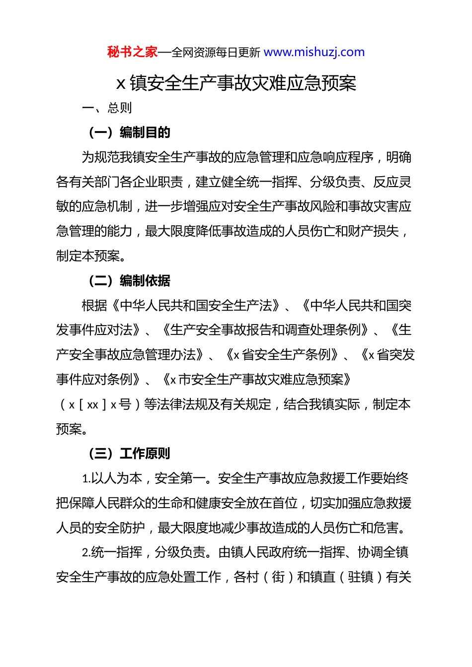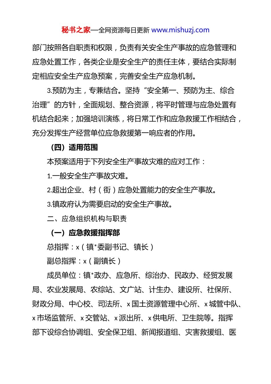 秘书之家—全网资源每日更新 www.mishuzj.comx 镇安全生产事故灾难应急预案一、总则(一)编制目的为规范我镇安全生产事故的应急管理和应急响应程序,明确各有关部门各企业职责,建立健全统一指挥、分级负责、反应灵敏的应急机制,进一步增强应对安全生产事故风险和事故灾害应急管理的能力,最大限度降低事故造成的人员伤亡和财产损失,制定本预案。(二)编制依据根据《中华人民共和国安全生产法》、《中华人民共和国突发事件应对法》、《生产安全事故报告和调查处理条例》、《生产安全事故应急管理办法》、《x 省安全生产条例》、《x 省突发事件应对条例》、《x 市安全生产事故灾难应急预案》(x[xx]x 号)等法律法规及有关规定,结合我镇实际,制定本预案。(三)工作原则1.以人为本,安全第一。安全生产事故应急救援工作要始终把保障人民群众的生命和健康安全放在首位,切实加强应急救援人员的安全防护,最大限度地减少事故造成的人员伤亡和危害。2.统一指挥,分级负责。由镇人民政府统一指挥、协调全镇安全生产事故的应急处置工作,各村(街)和镇直(驻镇)有关秘书之家—全网资源每日更新 www.mishuzj.com部门按照各自职责和权限,负责有关安全生产事故的应急管理和应急处置工作,各类企业是安全生产的责任主体,要结合实际制定相应安全生产应急预案,完善安全生产应急机制。3.预防为主,专兼结合。坚持“安全第一、预防为主、综合治理”的方针,全面规划、整合资源,将平时管理与应急处置有机结合起来;加强培训演练,将日常工作和应急救援工作相结合,充分发挥生产经营单位应急救援第一响应者的作用。(四)适用范围本预案适用于下列安全生产事故灾难的应对工作:1.一般安全生产事故灾难。2.超出企业、村(街)应急处置能力的安全生产事故。3.镇政府认为需要启动的安全生产事故。二、应急组织机构与职责(一)应急救援指挥部总指挥:x(镇*委副书记、镇长)副总指挥:x(副镇长)成员单位:镇*政办、应急所、综治办、民政办、经贸发展局、农业发展局、农综站、文广站、计生办、建设所、社保所、财政分局、中心校、司法所、x 国土资源管理中心所、x 城管中队、x 市场监管所、x 交管站、x 派出所、x 供电所、卫生院等。指挥部下设综合协调组、安全保卫组、新闻报道组、灾害救援组、医秘书之家—全网资源每日更新 www.mishuzj.com疗救护组、后勤保障组、事故调查组、善后处理组 8 个专业处置组,具体承担事故救援和处置工作。指挥部工作职责:在发生重大生产安全事故时,负责事故现场应急处置和抢险救援以及善后处理的组织指挥工作。总指挥是处置重大生产安全事故的组织者和指挥者,负责组织、指挥事故应急救援处置工作。指挥部成员单位职责应急所负责具体组织、协调、指挥工矿商贸行业安全生产事故灾难的应急救援;向镇应急指挥部提出应急处置建议。x 派出所、x 城管中队负责具体组织、协调、指挥道路交通、火灾等事故灾难的应急救援;参与其它行业领域的事故灾难的应急救援;组织、指导事发地的社会治安管理、道路交通管制和重点目标的安全保卫工作。民政办负责组织指导事故灾难群众救济工作以及遇难人员遗体处置等相关事务,会同事发地村(街)组织协调转移人员生活安置的保障工作。x 财政分局负责安全生产事故灾难应急资金的预算、管理,依法依规保障应急救援工作所需经费。社保所负责组织指导统筹地区对安全生产事故灾难伤亡人员的工伤认定和工伤保险待遇支付工作。x 国土资源管理中心所负责提供事故灾难所在地泥石流、山秘书之家—全网资源每日更新 www.mishuzj.com体滑坡等地质灾害信息和制订应对措施。建设所负责组织、协调、指挥城乡建筑工程安全生产事故灾难的应急救援,并提供技术支撑;组织、协调指挥公用事业安全生产事故灾难的应急救援。经贸发展局组织、协调、指挥镇重点工程安全生产事故灾难的应急救援。x 交管站负责具体组织、协调、指挥水上交通事故的应急救援;组织调集、协调车辆及船舶,保障应急救援人员、物资运输。农业发展局负责具体组织、协调、指挥渔业船舶、农机等安全生产事故灾难的应急救援。农综站负责提供事故灾难所...