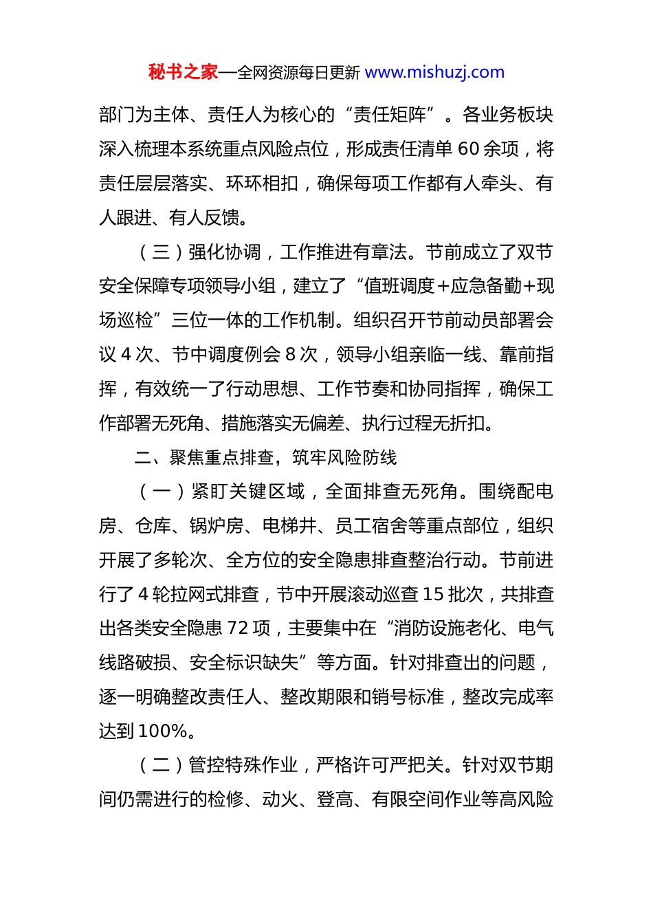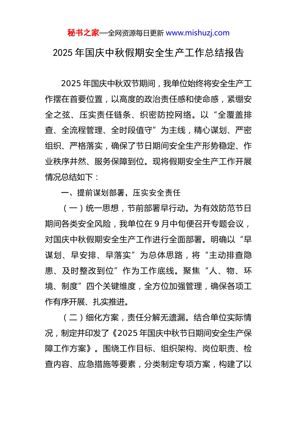秘书之家—全网资源每日更新 www.mishuzj.com2025 年国庆中秋假期安全生产工作总结报告 2025 年国庆中秋双节期间,我单位始终将安全生产工作摆在首要位置,以高度的政治责任感和使命感,紧绷安全之弦、压实责任链条、织密防控网络。以“全覆盖排查、全流程管理、全时段值守”为主线,精心谋划、严密组织、严格落实,确保了节日期间安全生产形势稳定、作业秩序井然、服务保障到位。现将假期安全生产工作开展情况总结如下:一、提前谋划部署,压实安全责任(一)统一思想,节前部署早行动。为有效防范节日期间各类安全风险,我单位在 9 月中旬便召开专题会议,对国庆中秋假期安全生产工作进行全面部署。明确以“早谋划、早安排、早落实”为总体思路,将“主动排查隐患、及时整改到位”作为工作底线。聚焦“人、物、环境、制度”四个关键维度,全方位加强管理,确保各项工作有序开展、扎实推进。(二)细化方案,责任分解无遗漏。结合单位实际情况,制定并印发了《2025 年国庆中秋节日期间安全生产保障工作方案》。围绕工作目标、组织架构、岗位职责、检查内容、应急措施等要素,分类制定专项方案,构建了以秘书之家—全网资源每日更新 www.mishuzj.com部门为主体、责任人为核心的“责任矩阵”。各业务板块深入梳理本系统重点风险点位,形成责任清单 60 余项,将责任层层落实、环环相扣,确保每项工作都有人牵头、有人跟进、有人反馈。(三)强化协调,工作推进有章法。节前成立了双节安全保障专项领导小组,建立了“值班调度+应急备勤+现场巡检”三位一体的工作机制。组织召开节前动员部署会议 4 次、节中调度例会 8 次,领导小组亲临一线、靠前指挥,有效统一了行动思想、工作节奏和协同指挥,确保工作部署无死角、措施落实无偏差、执行过程无折扣。二、聚焦重点排查,筑牢风险防线(一)紧盯关键区域,全面排查无死角。围绕配电房、仓库、锅炉房、电梯井、员工宿舍等重点部位,组织开展了多轮次、全方位的安全隐患排查整治行动。节前进行了 4 轮拉网式排查,节中开展滚动巡查 15 批次,共排查出各类安全隐患 72 项,主要集中在“消防设施老化、电气线路破损、安全标识缺失”等方面。针对排查出的问题,逐一明确整改责任人、整改期限和销号标准,整改完成率达到 100%。(二)管控特殊作业,严格许可严把关。针对双节期间仍需进行的检修、动火、登高、有限空间作业等高风险秘书之家—全网资源每日更新 www.mishuzj.com作业,严格执行“谁审批、谁负责”的原则。落实作业前风险评估、作业中现场监护、作业后验收确认的全过程管理机制。节日期间累计审批特殊作业 45 起,做到了 100%全程监督、100%安全交底、100%资料存档。对于重点项目,安排领导班子成员驻点督导,确保问题及时解决、责任落实到位。(三)关注生活区域,保障员工居住安全。节日期间员工宿舍入住率较高,我们将员工生活区域纳入重点巡查范围,开展了“宿舍安全专项整治”行动。清理违规电器20 台、排查电线乱拉乱接 20 处、整治物品乱堆乱放 15次。同时,在宿舍区张贴安全警示标语 15 条,发放安全倡议书 150 份,引导员工增强安全意识,自觉排查隐患、规范用电行为,形成了人人参与、人人负责的安全管理格局。三、创新宣传教育,营造安全氛围(一)开展分级培训,提升风险识别能力。节前针对管理层、中层干部、一线员工等不同群体,开展了分级分类安全培训。为管理层举办了安全生产形势分析讲座,增强其安全管理决策能力;为中层干部组织了安全法规和管理方法培训,提升其安全管理水平;为一线员工开展了岗位安全操作规程和应急处置技能培训,提高其风险识别和秘书之家—全网资源每日更新 www.mishuzj.com应急处置能力。累计培训 200 余人次,有效增强了全体员工的安全意识和防范能力。(二)丰富宣传形式,增强安全防范意识。通过单位内部网站、微信公众号、宣传栏等多种渠道,广泛宣传安全生产知识和节日期间安全注意事项。发布安全提示信息30 余条,推送安全案例分析 10 余篇,制作安全宣传海报20 余张。同时,组织开展了安全知识竞赛、安全演讲比赛等活动,吸引了 100...