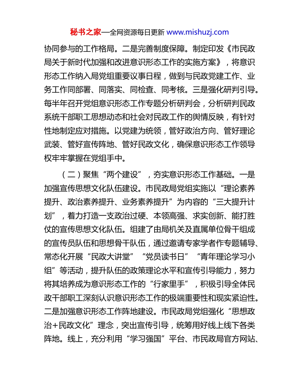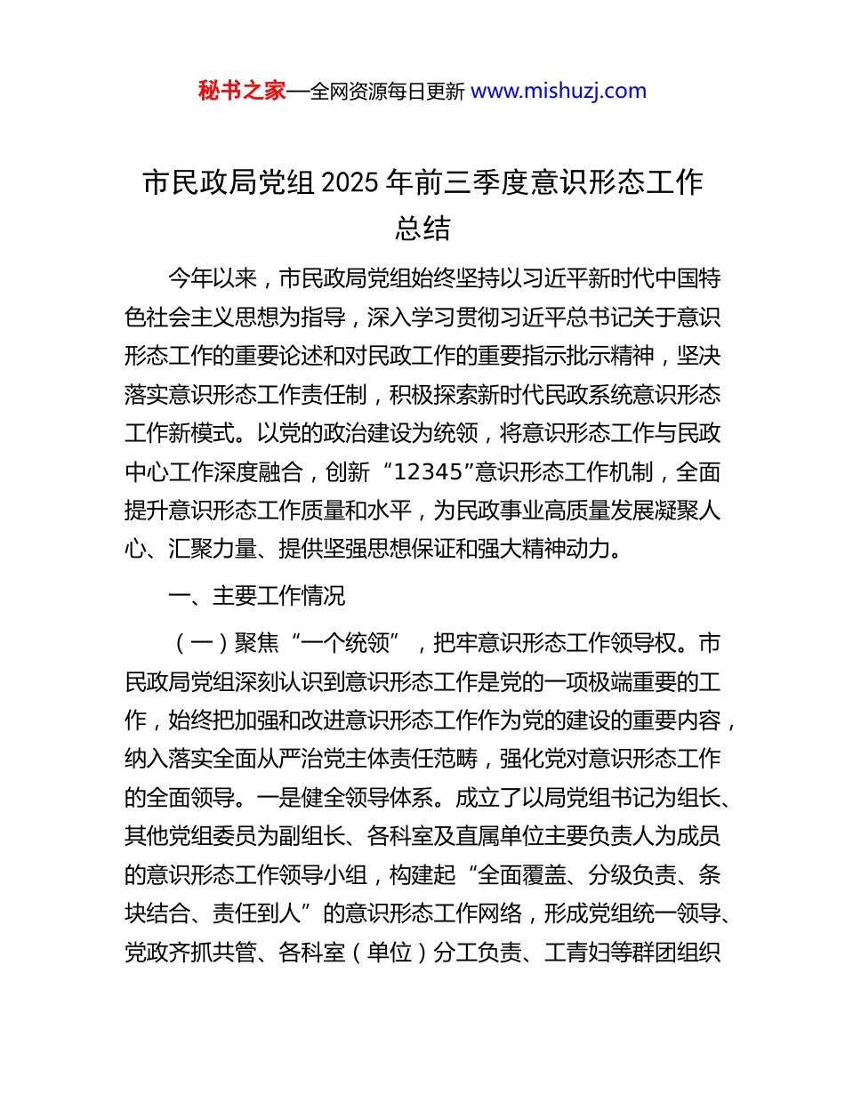 秘书之家—全网资源每日更新 www.mishuzj.com市民政局党组 2025 年前三季度意识形态工作总结今年以来,市民政局党组始终坚持以习近平新时代中国特色社会主义思想为指导,深入学习贯彻习近平总书记关于意识形态工作的重要论述和对民政工作的重要指示批示精神,坚决落实意识形态工作责任制,积极探索新时代民政系统意识形态工作新模式。以党的政治建设为统领,将意识形态工作与民政中心工作深度融合,创新“12345”意识形态工作机制,全面提升意识形态工作质量和水平,为民政事业高质量发展凝聚人心、汇聚力量、提供坚强思想保证和强大精神动力。一、主要工作情况(一)聚焦“一个统领”,把牢意识形态工作领导权。市民政局党组深刻认识到意识形态工作是党的一项极端重要的工作,始终把加强和改进意识形态工作作为党的建设的重要内容,纳入落实全面从严治党主体责任范畴,强化党对意识形态工作的全面领导。一是健全领导体系。成立了以局党组书记为组长、其他党组委员为副组长、各科室及直属单位主要负责人为成员的意识形态工作领导小组,构建起“全面覆盖、分级负责、条块结合、责任到人”的意识形态工作网络,形成党组统一领导、党政齐抓共管、各科室(单位)分工负责、工青妇等群团组织秘书之家—全网资源每日更新 www.mishuzj.com协同参与的工作格局。二是完善制度保障。制定印发《市民政局关于新时代加强和改进意识形态工作的实施方案》,将意识形态工作纳入局党组重要议事日程,做到与民政党建工作、业务工作同部署、同落实、同检查、同考核。三是强化研判引导。每半年召开党组意识形态工作专题分析研判会,分析研判民政系统干部职工思想动态和社会对民政工作的舆情反映,有针对性地制定应对措施。以党建为统领,管好政治方向、管好理论武装、管好宣传阵地、管好民政文化,确保意识形态工作领导权牢牢掌握在党组手中。(二)聚焦“两个建设”,夯实意识形态工作基础。一是加强宣传思想文化队伍建设。市民政局党组实施以“理论素养提升、政治素养提升、业务素养提升”为内容的“三大提升计划”,着力打造一支政治过硬、本领高强、求实创新、能打胜仗的宣传思想文化队伍。组建了由局机关及直属单位骨干组成的宣传员队伍和思想骨干队伍,通过邀请专家学者作专题辅导、常态化开展“民政大讲堂”“党员读书日”“青年理论学习小组”等活动,提升队伍的政策理论水平和宣传引导能力,努力将其培养成为意识形态工作的“行家里手”,积极引导全体民政干部职工深刻认识意识形态工作的极端重要性和现实紧迫性。二是加强意识形态工作阵地建设。市民政局党组强化“思想政治+民政文化”理念,突出宣传引导,统筹用好线上线下各类阵地。线上,充分利用“学习强国”平台、市民政局官方网站、秘书之家—全网资源每日更新 www.mishuzj.com微信公众号、微博、政务新媒体矩阵等,及时传达党的声音,解读民政政策,宣传先进典型;线下,规范管理局机关及直属单位宣传栏、公示栏、党员活动室、阅览室、服务窗口等阵地,将日常学习教育由线下向线上延伸,实现线上线下同频共振。严格落实谈心谈话、领导干部接访下访、局长信箱等制度,结合组织生活会、“三会一课”等,畅通干部职工思想动态交流渠道和群众意见反馈渠道,实现由单向被动宣传向双向主动交流的转变。总结提炼并大力弘扬“民政为民、民政爱民”工作理念和具有本地民政特色的精神价值理念,打造动态宣传阵地,进一步激发干部职工干事创业的责任感和使命感。(三)聚焦“三个结合”,强化意识形态工作抓手。一是与提升治理能力相结合。市民政局党组深入发挥党建引领作用,将意识形态工作融入民政事业改革发展和治理能力现代化全过程。不断完善“三重一大”决策制度实施办法及党组会议、局长办公会决策事项权责清单,明确界定党组在民政事业发展规划、重大项目安排、重要人事任免、大额资金使用等方面的决策把关作用,严格执行党组会议事程序,切实发挥了党组“把方向、管大局、保落实”的领导核心和政治核心作用。通过强化理论武装和思想引领,确保全体干部职工在思想上政治上行动上同党中央保持高度一致,为提升民政治理体系和治理能力...