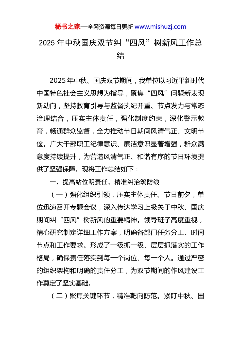 秘书之家—全网资源每日更新 www.mishuzj.com2025 年中秋国庆双节纠“四风”树新风工作总结 2025 年中秋、国庆双节期间,我单位以习近平新时代中国特色社会主义思想为指导,聚焦“四风”问题新表现新动向,坚持教育引导与监督执纪并重、节点发力与常态治理结合,压实主体责任,强化制度约束,深化警示教育,畅通群众监督,全力推动节日期间风清气正、文明节俭。广大干部职工纪律意识、廉洁意识显著增强,群众满意度持续提升,为营造风清气正、和谐有序的节日环境提供了坚强保障。现将工作总结如下:一、提高站位明责任,精准纠治筑防线(一)强化组织引领,压实主体责任。节日前夕,单位迅速召开专题会议,深入传达学习上级关于中秋、国庆期间纠“四风”树新风的重要精神。领导班子高度重视,精心研究制定详细工作方案,明确各部门任务分工、时间节点和工作要求。形成了一级抓一级、层层抓落实的工作格局,确保责任落实到每一个岗位、每一个人。通过严密的组织架构和明确的责任分工,为双节期间的作风建设工作奠定了坚实基础。(二)聚焦关键环节,精准靶向防范。紧盯中秋、国秘书之家—全网资源每日更新 www.mishuzj.com庆期间易发多发的“四风”问题,如违规收送礼品礼金、违规发放津补贴、违规公款吃喝等,聚焦这些突出问题提出刚性要求。组织全体干部职工签订廉洁过节承诺书,进一步强化自我约束。成立专项督查组,采取“四不两直”方式,对单位内部及下属部门进行突击检查。重点检查办公场所、食堂、仓库等,查看是否存在违规存放礼品、违规接待等情况,确保监督无死角。(三)完善制度体系,扎紧纪律牢笼。修订完善一系列与节日作风建设相关的制度文件,进一步明确纪律红线和行为准则。推行“阳光采购”平台,对节日期间的物资采购进行全程监管,确保采购过程公开透明、合规合法。建立“节日廉政提醒+个人承诺+家庭助廉”三位一体机制,在双节前夕,向全体干部职工发送廉洁过节短信,提醒大家严守纪律底线。组织家属座谈会,与家属签署《家庭助廉倡议书》,充分发挥家庭在廉洁自律方面的监督作用,构建内外联动的监督网络。二、人民至上解难题,文明节俭树新风(一)聚焦民生热点,推动政策落地。围绕群众在中秋、国庆期间反映强烈的现实问题,组织开展专项巡查。深入基层一线进行走访调研和突击检查,重点关注民生保障、市场供应、旅游服务等方面。通过实地查看、与群众秘书之家—全网资源每日更新 www.mishuzj.com交流等方式,发现并督促整改问题隐患。设立“节日服务直通车”热线,安排专人 24 小时值守,受理群众咨询投诉事项。对群众反映的问题,及时进行分类处理,确保事事有回音、件件有着落,推动各项政策在节日期间落地见效。(二)倡导文明风尚,弘扬节俭美德。全面推行“光盘行动”,在单位食堂及各大餐饮场所设置“文明用餐劝导员”,积极营造节约粮食的良好氛围。倡导干部职工在节日期间绿色出行、低碳过节,减少能源消耗和环境污染。创新开展“清风家书”“廉洁家风故事分享会”等活动,引导干部职工传承和弘扬崇德尚廉的优良家风。通过这些活动,不仅增强了干部职工的廉洁意识,也在全社会营造了文明节俭的节日氛围。(三)畅通监督渠道,构建全民共治。依托“智慧”平台,优化问题反映功能,让群众可以通过手机 APP、微信公众号等多种途径,随时随地反映“四风”问题。设立“节日作风观察员”制度,邀请人大代表、政协委员、群众代表等担任观察员,对节日期间的作风建设情况进行监督。建立健全快速响应机制,对观察员反馈的问题及时进行调查处理,并将处理结果及时反馈给观察员和群众,形成全民参与、共治共享的良好局面。秘书之家—全网资源每日更新 www.mishuzj.com三、健全机制促长效,巩固成果展新貌(一)加强协同监督,提升执纪效能。建立健全多部门信息共享、线索移送、联合处置机制。加强与纪检、财政、审计等部门的沟通协作,定期召开联席会议,交流工作进展情况,共享监督信息。探索运用大数据比对技术,对节日期间的财务数据、消费记录等进行分析,实现对“四风”问题的精准预警。通过多部门协同作战和科技手段的运用,提升了监督执纪...