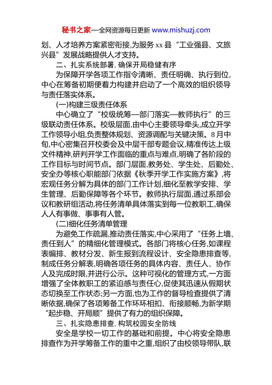 秘书之家—全网资源每日更新 www.mishuzj.comxx 单位 2025 年秋季学期开学筹备工作情况报告为确保 2025 年秋季学期各项工作安全、平稳、高效运行,xx 县职业教育中心紧密围绕 xx 省及 xx 市关于职业教育高质量发展的战略部署,立足于“安全有序、提质增效”的核心目标,于 2025 年 8 月启动并全面完成了新学期开学筹备工作。本次筹备工作以系统化部署、精细化排查、标准化整治和人性化保障为四大抓手,为新学年技能人才培养工作的顺利开展奠定了坚实基础。本报告旨在对此次筹备工作的总体情况、主要举措、实施成效及未来展望进行系统性总结。一、总体情况与基本遵循中心作为 xx 县域内技术技能人才培养的核心基地,在服务地方产业转型升级、促进青年高质量就业方面扮演着关键角色。截至 2025 年秋季学期,中心办学规模保持稳定,现有教职工约 110 人,其中包括一支由 73 名“双师型”教师构成的骨干力量,并常年聘用超过 30 名具备丰富实践经验的企业专家与实训指导教师。中心在校生规模约为 1100 余人。近年来,中心持续加大投入,实训教学条件得到显著改善,教学仪器设备总值已近 6000 万元,建有覆盖智能制造、电子信息、现代服务等领域的专业实训室 50 余个,为深化产教融合、提升学生实践能力提供了有力支撑。面对新时代职业教育发展的要求,以及当前区域经济对高素质技术技能人才的迫切需求中心将开学筹备工作视为保障全年教学质量的先决性、基础性工作。全部筹备活动严格遵循上级教育主管部门的指导方针,以《秋季开学工作实施方案》为纲领性文件,确保各项举措与中心年度发展规秘书之家—全网资源每日更新 www.mishuzj.com划、人才培养方案紧密衔接,为服务 xx 县“工业强县、文旅兴县”发展战略提供人才支持。二、扎实系统部署,确保开局稳健有序为保障开学各项工作指令清晰、责任明确、执行到位,中心在筹备初期便着力构建并启动了一个高效的组织领导与责任落实体系。(一)构建三级责任体系中心确立了“校级统筹—部门落实—教师执行”的三级联动责任体系。校级层面,由中心主要领导牵头,成立开学工作领导小组,负责整体规划、资源调配与关键决策。8 月中旬,中心密集召开校委会及中层干部专题会议,精准传达上级文件精神,研判开学工作面临的重点与难点,明确了各阶段的工作目标与时间节点。部门层面,教务处、学生处、后勤处、安全办等核心职能部门依据《秋季开学工作实施方案》,将宏观任务分解为具体的部门工作计划,细化至教学安排、学生管理、后勤保障等各个环节。教师执行层面,通过系部会议和教研组活动,将任务清单具体落实到每一位教职工,确保人人有事做、事事有人管。(二)细化任务清单管理为避免工作疏漏,推动责任落实,中心采用了“任务上墙、责任到人”的精细化管理模式。各部门将核心任务,如课程表编排、教材分发、新生报到流程设计、安全隐患排查等,制成任务分解表,明确各项任务的具体内容、责任人、协作人及完成时限,并进行公示。这种可视化的管理方式,一方面增强了全体教职工的紧迫感与责任心,促使其迅速从假期状态切换至工作状态;另一方面,也为工作的督导检查提供了清晰依据,确保了各项筹备工作环环相扣、衔接顺畅,为新学期“起步稳、开局顺”提供了有力的组织保障。三、扎实隐患排查,构筑校园安全防线安全是学校一切工作的基础和前提。中心将安全隐患排查作为开学筹备工作的重中之重,组织了由校领导带队,联秘书之家—全网资源每日更新 www.mishuzj.com合安全办、后勤处、实训处及各专业系部负责人组成的安全排查小组,对校园及周边环境开展了“拉网式、全覆盖、无死角”的深度排查。(一)专业实训设备安全检修职业院校的实训室是安全管理的重点区域。排查小组针对数控加工、汽车维修、电工电子、烹饪等专业的全部实训室进行了专项检查。技术人员逐一启动并测试了各类大型专业教学设施,包括车床、铣床、焊接设备、汽车举升机等,全面评估其运行状态。对检查中发现存在磨损、老化的电气元件、传动部件及管线,立即进行更换,确保设备性能稳定可靠。尽管具体更换的老化零件型号及详细的检修时间表并未在公开材料中逐一列明,但中心建立了完整的检修记录与备...