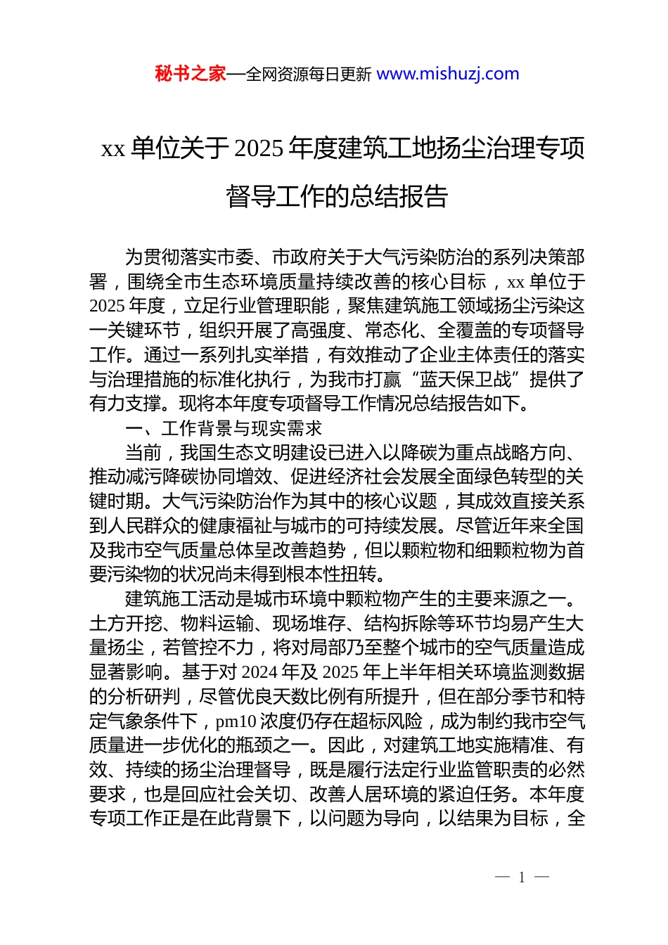 秘书之家—全网资源每日更新 www.mishuzj.comxx 单位关于 2025 年度建筑工地扬尘治理专项督导工作的总结报告为贯彻落实市委、市政府关于大气污染防治的系列决策部署,围绕全市生态环境质量持续改善的核心目标,xx 单位于2025 年度,立足行业管理职能,聚焦建筑施工领域扬尘污染这一关键环节,组织开展了高强度、常态化、全覆盖的专项督导工作。通过一系列扎实举措,有效推动了企业主体责任的落实与治理措施的标准化执行,为我市打赢“蓝天保卫战”提供了有力支撑。现将本年度专项督导工作情况总结报告如下。一、工作背景与现实需求当前,我国生态文明建设已进入以降碳为重点战略方向、推动减污降碳协同增效、促进经济社会发展全面绿色转型的关键时期。大气污染防治作为其中的核心议题,其成效直接关系到人民群众的健康福祉与城市的可持续发展。尽管近年来全国及我市空气质量总体呈改善趋势,但以颗粒物和细颗粒物为首要污染物的状况尚未得到根本性扭转。建筑施工活动是城市环境中颗粒物产生的主要来源之一。土方开挖、物料运输、现场堆存、结构拆除等环节均易产生大量扬尘,若管控不力,将对局部乃至整个城市的空气质量造成显著影响。基于对 2024 年及 2025 年上半年相关环境监测数据的分析研判,尽管优良天数比例有所提升,但在部分季节和特定气象条件下,pm10 浓度仍存在超标风险,成为制约我市空气质量进一步优化的瓶颈之一。因此,对建筑工地实施精准、有效、持续的扬尘治理督导,既是履行法定行业监管职责的必然要求,也是回应社会关切、改善人居环境的紧迫任务。本年度专项工作正是在此背景下,以问题为导向,以结果为目标,全— 1 —秘书之家—全网资源每日更新 www.mishuzj.com面展开。二、主要督导措施与工作成效中心紧扣“源头严防、过程严管、后果严惩”的工作思路整合内外部资源,构建了“巡查、执法、服务”三位一体的督导工作体系,取得了显著成效。(一)实施协同联动巡查聚力压实主体责任中心深刻认识到,扬尘治理是一项系统工程,非单一部门能独立完成。为此,中心积极主动与 xx 市住建局等主管部门建立常态化协同工作机制,派出具备丰富现场经验的专业技术人员,深度参与市级联合巡查行动。此举打破了部门间的信息壁垒,形成了监管合力。截至 2025 年 9 月,联合巡查组已累计对全市范围内不同区域、不同施工阶段的 40 个重点在建项目实施了突击检查与专项巡查。在巡查过程中,共计发现并记录了扬尘防治措施不到位问题 30 余处,问题类型涵盖工地围挡不规范、主要道路未硬化、裸露土方覆盖不全、车辆冲洗设施闲置或无效、湿法作业落实不到位等多个方面。针对发现的问题,巡查组坚持“零容忍”态度,依法依规向相关责任单位下达了《限期整改通知书》16份,明确整改标准、时限与复查要求。通过这种联合执法的形式,不仅提升了发现问题的精准度,更向市场传递了政府严格监管的明确信号,有力地将扬尘治理的压力传导至建设、施工、监理等各方主体,促使其从被动应付向主动作为转变,从源头上压实了企业不可推卸的主体责任。(二)推行常态化专项督导强化执法刚性约束为避免“一阵风”式的治理,确保扬尘管控措施在整个施工周期内得到持续、有效的执行,中心将常态化督导作为本年度工作的重中之重。中心内部组建了多个由业务骨干构成的专项督导组,不发通知、不打招呼,采取“四不两直”方式,持续深入全市各个建筑施工一线。— 2 —秘书之家—全网资源每日更新 www.mishuzj.com数据显示,截至目前,中心各督导组已累计开展各类施工现场检查 410 余次,基本实现了对辖区内在建工地的动态全覆盖。在检查过程中,执法力度与精细度并重。一方面,严格执行非道路移动机械排放标准,对进入施工现场的挖掘机、装载机等设备进行排查,共劝离和驱离了 90 多台次不符合环保排放标准的机械设备,有效减少了移动源污染。另一方面,针对现场扬尘管控的薄弱环节,累计下达了《扬尘治理限期整改通知书》39 份。对于部分责任意识淡薄、屡教不改的单位,中心采取了更为严厉的惩戒措施。年内共计对 11 家扬尘治理工作落实严重不力的施工或建设单位负...