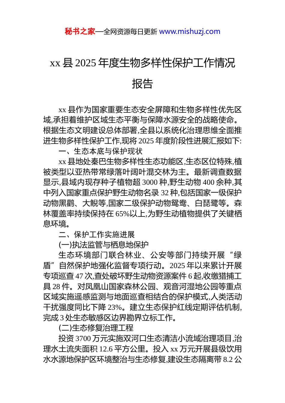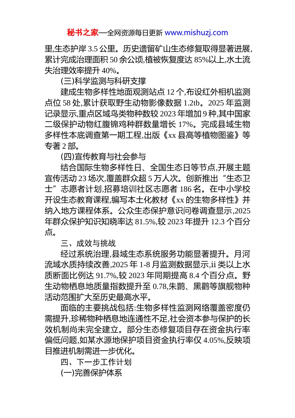 秘书之家—全网资源每日更新 www.mishuzj.comxx 县 2025 年度生物多样性保护工作情况报告xx 县作为国家重要生态安全屏障和生物多样性优先区域,承担着维护区域生态平衡与保障水源安全的战略使命。根据生态文明建设总体部署,全县以系统化治理思维全面推进生物多样性保护工作,现将 2025 年度阶段性进展汇报如下:一、生态本底与保护现状xx 县地处秦巴生物多样性生态功能区,生态区位特殊,植被类型以亚热带常绿落叶阔叶混交林为主。最新调查数据显示,县域内现存种子植物超 3000 种,野生动物 400 余种,其中列入国家重点保护野生动物名录 32 种,包括国家一级保护动物黑鹳、大鲵等,国家二级保护动物鸳鸯、白琵鹭等。森林覆盖率持续保持在 65%以上,为野生动植物提供了关键栖息环境。二、保护工作实施进展(一)执法监管与栖息地保护生态环境部门联合林业、公安等部门持续开展“绿盾”自然保护地强化监督专项行动。2025 年以来累计开展专项巡查 47 次,查处破坏野生动物资源案件 6 起,收缴猎捕工具 28 件。对凤凰山国家森林公园、观音河湿地公园等重点区域实施遥感监测与地面巡查相结合的保护模式,人类活动干扰强度同比下降 23%。建立生态保护红线定期评估机制,完成 3 处生态敏感区边界勘界立标工作。(二)生态修复治理工程投资 3700 万元实施双河口生态清洁小流域治理项目,治理水土流失面积 12.6 平方公里。投入 xx 万元开展县级饮用水水源地保护区环境整治与生态修复,建设生态隔离带 8.2 公秘书之家—全网资源每日更新 www.mishuzj.com里,生态护岸 3.5 公里。历史遗留矿山生态修复取得显著进展,累计完成治理面积 50 余公顷,植被恢复度达 85%以上,水土流失治理效率提升 40%。(三)科学监测与科研支撑建成生物多样性地面观测站点 12 个,布设红外相机监测点位 58 处,累计获取野生动物影像数据 1.2tb。2025 年监测记录显示,重点区域鸟类物种数较 2023 年增加 9 种,其中国家二级保护动物红腹锦鸡种群数量增长 17%。完成县域生物多样性本底调查第一期工程,出版《xx 县高等植物图鉴》等专著 2 部。(四)宣传教育与社会参与结合国际生物多样性日、全国生态日等节点,开展主题宣传活动 23 场次,覆盖群众超 5 万人次。创新推出“生态卫士”志愿者计划,招募培训社区志愿者 186 名。在中小学校开设生态教育课程,编写本土化教材《xx 的生物多样性》并纳入地方课程体系。公众生态保护意识问卷调查显示,2025年群众保护知识知晓率达 81.5%,较 2023 年提升 12.3 个百分点。三、成效与挑战经过系统治理,县域生态系统服务功能显著提升。月河流域水质持续改善,2025 年 1-8 月监测数据显示,ⅱ 类以上水质断面比例达 91.7%,较 2023 年同期提高 8.4 个百分点。野生动物栖息地质量指数提升至 0.78,朱鹮、黑鹳等旗舰物种活动范围扩大至历史最高水平。面临的主要挑战包括:生物多样性监测网络覆盖密度仍需提升,珍稀物种栖息地连通性不足,社会资本参与保护的长效机制尚未完全建立。部分生态修复项目存在资金执行率偏低问题,如某水源地保护项目资金执行率仅 4.05%,反映项目推进机制需进一步优化。四、下一步工作计划(一)完善保护体系秘书之家—全网资源每日更新 www.mishuzj.com2026 年底前建成生物多样性智慧监测平台,整合遥感监测、地面观测和社区监测数据。推进生态廊道建设工程,重点实施 3 处关键栖息地连通项目。(二)深化科学修复启动历史遗留矿山生态修复二期工程,计划治理面积 35公顷。开展湿地生态系统碳汇能力评估研究,探索生态产品价值实现路径。(三)创新机制建设建立生态保护补偿专项资金,推行“保护者受益、使用者付费”机制。探索设立生物多样性保护基金,吸引社会资本参与保护事业。(四)强化能力建设2026 年完成全县生物多样性本底调查第二期工程,发布县域濒危物种红色名录。加强执法队伍专业培训,配备现代化执法装备,提升违法行为发现能力。xx 县将始终坚持生态优先、绿色发展理念,持续推进生物多样性保护与恢复工作,为构建人与自然和谐共生的现代化县域典范提供坚实生态保障。