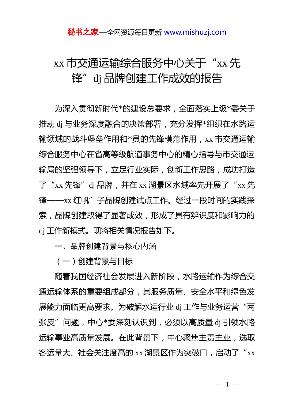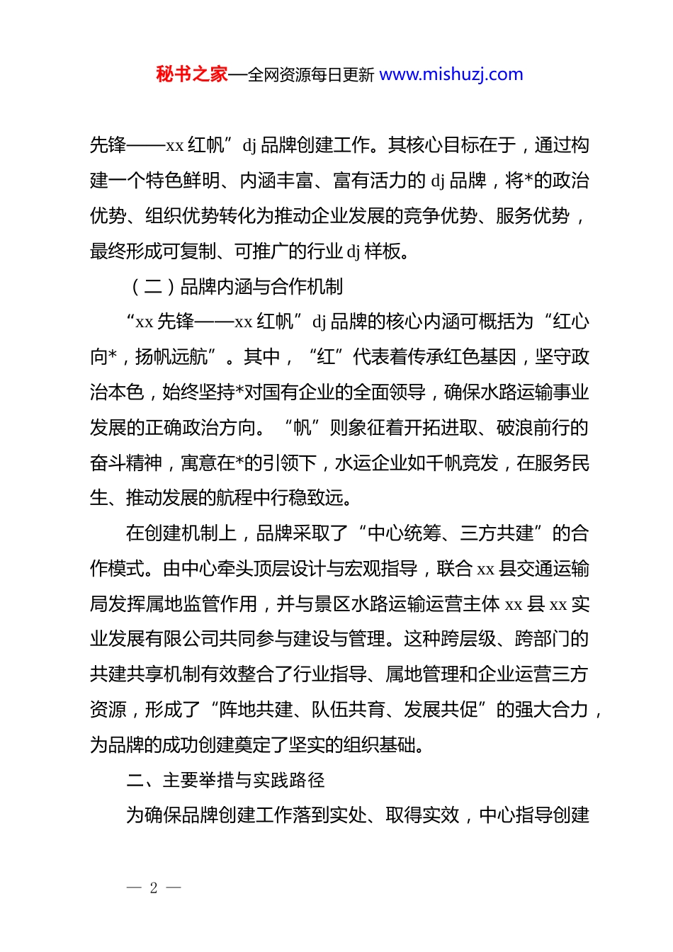 秘书之家—全网资源每日更新 www.mishuzj.comxx 市交通运输综合服务中心关于“xx 先锋”dj 品牌创建工作成效的报告为深入贯彻新时代*的建设总要求,全面落实上级*委关于推动 dj 与业务深度融合的决策部署,充分发挥*组织在水路运输领域的战斗堡垒作用和*员的先锋模范作用,xx 市交通运输综合服务中心在省高等级航道事务中心的精心指导与市交通运输局的坚强领导下,立足行业实际,创新工作思路,成功打造了“xx 先锋”dj 品牌,并在 xx 湖景区水域率先开展了“xx 先锋——xx 红帆”子品牌创建试点工作。经过一段时间的实践探索,品牌创建取得了显著成效,形成了具有辨识度和影响力的dj 工作新模式。现将相关情况报告如下。一、品牌创建背景与核心内涵(一)创建背景与目标随着我国经济社会发展进入新阶段,水路运输作为综合交通运输体系的重要组成部分,其服务质量、安全水平和绿色发展能力面临更高要求。为破解水运行业 dj 工作与业务运营“两张皮”问题,中心*委深刻认识到,必须以高质量 dj 引领水路运输事业高质量发展。在此背景下,中心聚焦主责主业,选取客运量大、社会关注度高的 xx 湖景区作为突破口,启动了“xx— 1 —秘书之家—全网资源每日更新 www.mishuzj.com先锋——xx 红帆”dj 品牌创建工作。其核心目标在于,通过构建一个特色鲜明、内涵丰富、富有活力的 dj 品牌,将*的政治优势、组织优势转化为推动企业发展的竞争优势、服务优势,最终形成可复制、可推广的行业 dj 样板。(二)品牌内涵与合作机制“xx 先锋——xx 红帆”dj 品牌的核心内涵可概括为“红心向*,扬帆远航”。其中,“红”代表着传承红色基因,坚守政治本色,始终坚持*对国有企业的全面领导,确保水路运输事业发展的正确政治方向。“帆”则象征着开拓进取、破浪前行的奋斗精神,寓意在*的引领下,水运企业如千帆竞发,在服务民生、推动发展的航程中行稳致远。在创建机制上,品牌采取了“中心统筹、三方共建”的合作模式。由中心牵头顶层设计与宏观指导,联合 xx 县交通运输局发挥属地监管作用,并与景区水路运输运营主体 xx 县 xx 实业发展有限公司共同参与建设与管理。这种跨层级、跨部门的共建共享机制有效整合了行业指导、属地管理和企业运营三方资源,形成了“阵地共建、队伍共育、发展共促”的强大合力,为品牌的成功创建奠定了坚实的组织基础。二、主要举措与实践路径为确保品牌创建工作落到实处、取得实效,中心指导创建— 2 —秘书之家—全网资源每日更新 www.mishuzj.com单位系统构建了“政治领航、发展竞航、安全护航、绿色续航”四位一体的 dj 矩阵,将 dj 工作全面融入水路运输服务的各领域和全过程。(一)实施“政治领航”工程,筑牢思想根基坚持把*的政治建设摆在首位,不断强化*员干部的理论武装和*性修养。一是规范组织生活。严格执行“三会一课”、主题*日等制度,组织*员深入学习*的创新理论,确保*组织的凝聚力和战斗力得到实质性提升。二是建强红色阵地。在景区游客服务中心、检票口、重点船舶等关键服务节点,设立了 3 个“*员先锋岗”,公开*员身份,亮明服务承诺,让*员的先锋形象在一线窗口熠熠生辉。三是打造红色课堂。创新性地将一艘核心游船改造为“*员先锋号”,在船舱内设置*史学习教育和红色故事展示区,使游船从单一的交通工具,转变为流动的红色教育基地,让“xx 红帆”成为 xx 湖上一道亮丽的风景线。(二)实施“发展竞航”工程,提升服务效能品牌创建的出发点和落脚点是服务人民群众,推动事业发展。为此,中心指导运营企业推出一系列提质增效的举措。一是推出惠民政策。制定并实施了 xx 籍居民免门票乘坐游船的优惠政策,有效提升了本地居民的幸福感和获得感。二是完善硬件设施。积极协调资源,完成了景区一期提升改造工程,对坝— 3 —秘书之家—全网资源每日更新 www.mishuzj.com面码头等关键基础设施进行了升级,显著改善了游客的登船环境和候船体验。三是优化服务流程。对景区水上游览航线进行了科学优化,增加了沿途景点语音播报服务,丰富了游客的体验内容。同时,在码头区域精心打造了“xx ...