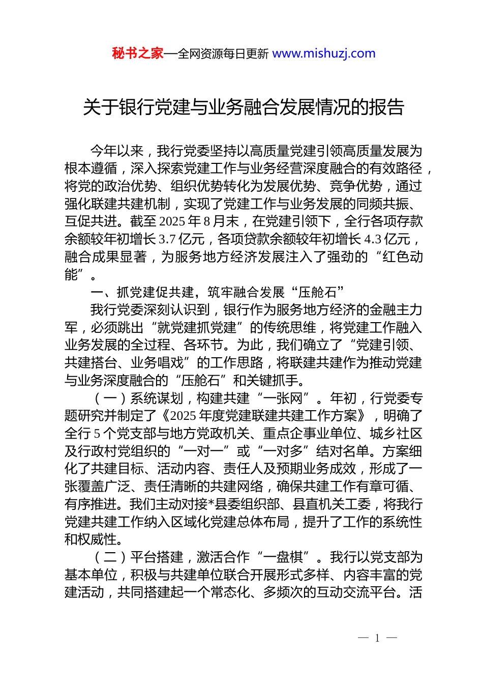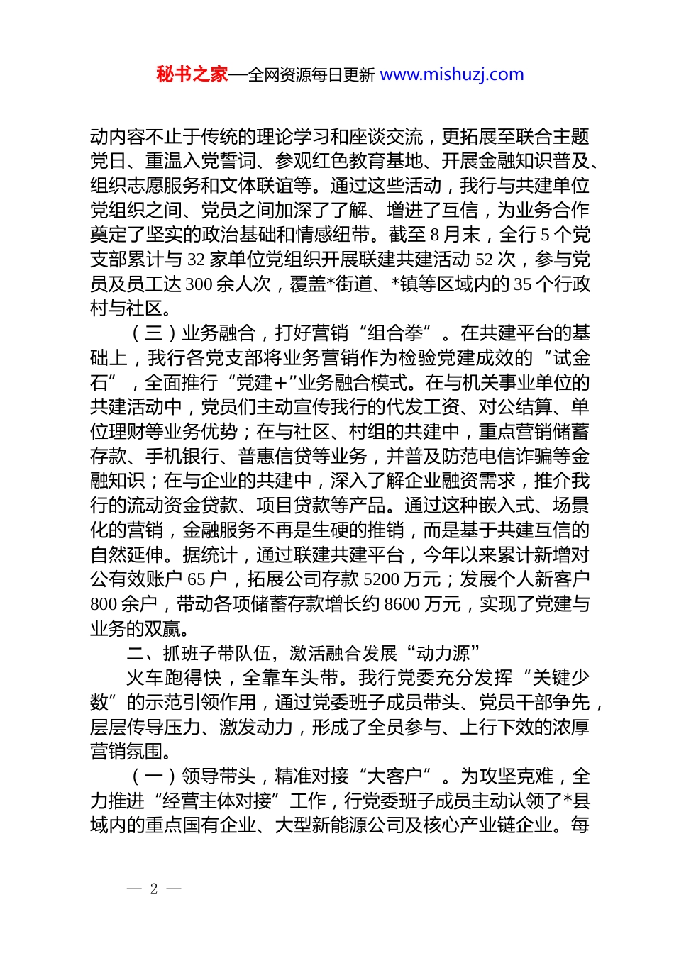 秘书之家—全网资源每日更新 www.mishuzj.com关于银行党建与业务融合发展情况的报告今年以来,我行党委坚持以高质量党建引领高质量发展为根本遵循,深入探索党建工作与业务经营深度融合的有效路径,将党的政治优势、组织优势转化为发展优势、竞争优势,通过强化联建共建机制,实现了党建工作与业务发展的同频共振、互促共进。截至 2025 年 8 月末,在党建引领下,全行各项存款余额较年初增长 3.7 亿元,各项贷款余额较年初增长 4.3 亿元,融合成果显著,为服务地方经济发展注入了强劲的“红色动能”。一、抓党建促共建,筑牢融合发展“压舱石”我行党委深刻认识到,银行作为服务地方经济的金融主力军,必须跳出“就党建抓党建”的传统思维,将党建工作融入业务发展的全过程、各环节。为此,我们确立了“党建引领、共建搭台、业务唱戏”的工作思路,将联建共建作为推动党建与业务深度融合的“压舱石”和关键抓手。(一)系统谋划,构建共建“一张网”。年初,行党委专题研究并制定了《2025 年度党建联建共建工作方案》,明确了全行 5 个党支部与地方党政机关、重点企事业单位、城乡社区及行政村党组织的“一对一”或“一对多”结对名单。方案细化了共建目标、活动内容、责任人及预期业务成效,形成了一张覆盖广泛、责任清晰的共建网络,确保共建工作有章可循、有序推进。我们主动对接*县委组织部、县直机关工委,将我行党建共建工作纳入区域化党建总体布局,提升了工作的系统性和权威性。(二)平台搭建,激活合作“一盘棋”。我行以党支部为基本单位,积极与共建单位联合开展形式多样、内容丰富的党建活动,共同搭建起一个常态化、多频次的互动交流平台。活— 1 —秘书之家—全网资源每日更新 www.mishuzj.com动内容不止于传统的理论学习和座谈交流,更拓展至联合主题党日、重温入党誓词、参观红色教育基地、开展金融知识普及、组织志愿服务和文体联谊等。通过这些活动,我行与共建单位党组织之间、党员之间加深了了解、增进了互信,为业务合作奠定了坚实的政治基础和情感纽带。截至 8 月末,全行 5 个党支部累计与 32 家单位党组织开展联建共建活动 52 次,参与党员及员工达 300 余人次,覆盖*街道、*镇等区域内的 35 个行政村与社区。(三)业务融合,打好营销“组合拳”。在共建平台的基础上,我行各党支部将业务营销作为检验党建成效的“试金石”,全面推行“党建+”业务融合模式。在与机关事业单位的共建活动中,党员们主动宣传我行的代发工资、对公结算、单位理财等业务优势;在与社区、村组的共建中,重点营销储蓄存款、手机银行、普惠信贷等业务,并普及防范电信诈骗等金融知识;在与企业的共建中,深入了解企业融资需求,推介我行的流动资金贷款、项目贷款等产品。通过这种嵌入式、场景化的营销,金融服务不再是生硬的推销,而是基于共建互信的自然延伸。据统计,通过联建共建平台,今年以来累计新增对公有效账户 65 户,拓展公司存款 5200 万元;发展个人新客户800 余户,带动各项储蓄存款增长约 8600 万元,实现了党建与业务的双赢。二、抓班子带队伍,激活融合发展“动力源”火车跑得快,全靠车头带。我行党委充分发挥“关键少数”的示范引领作用,通过党委班子成员带头、党员干部争先,层层传导压力、激发动力,形成了全员参与、上行下效的浓厚营销氛围。(一)领导带头,精准对接“大客户”。为攻坚克难,全力推进“经营主体对接”工作,行党委班子成员主动认领了*县域内的重点国有企业、大型新能源公司及核心产业链企业。每— 2 —秘书之家—全网资源每日更新 www.mishuzj.com位班子成员均建立了一份详实的走访对接清单,明确了目标客户、服务需求和营销计划,坚持“每周有联系、每月必上门”的原则,定期提供“一对一”的专属金融服务。截至 8 月末,行党委班子成员带头走访重点企业 40 余家,成功对接了*新能源、*化工等大型项目,带来项目贷款意向超过 2 亿元,实现对公存款沉淀 6000 余万元,为我行业务发展打开了新局面。(二)党员示范,网格营销“全覆盖”。在班子成员的带动下,全行党员干部充分发挥先锋模范...