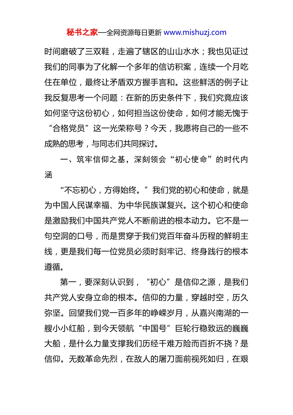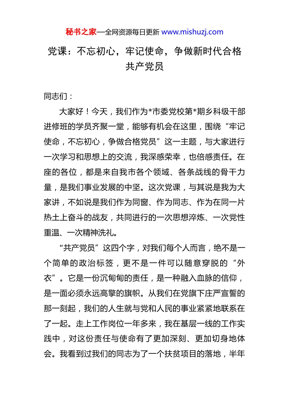 秘书之家—全网资源每日更新 www.mishuzj.com党课:不忘初心,牢记使命,争做新时代合格共产党员 同志们:大家好!今天,我们作为*市委党校第*期乡科级干部进修班的学员齐聚一堂,能够有机会在这里,围绕“牢记使命,不忘初心,争做合格党员”这一主题,与大家进行一次学习和思想上的交流,我深感荣幸,也倍感责任。在座的各位,都是来自我市各个领域、各条战线的骨干力量,是我们事业发展的中坚。这次党课,与其说是我为大家讲,不如说是我们作为同窗、作为同志、作为在同一片热土上奋斗的战友,共同进行的一次思想淬炼、一次党性重温、一次精神洗礼。“共产党员”这四个字,对我们每个人而言,绝不是一个简单的政治标签,更不是一件可以随意穿脱的“外衣”。它是一份沉甸甸的责任,是一种融入血脉的信仰,是一面必须永远高擎的旗帜。从我们在党旗下庄严宣誓的那一刻起,我们的人生就与党和人民的事业紧紧地联系在了一起。走上工作岗位一年多来,我在基层一线的工作实践中,对这份责任与使命有了更加深刻、更加切身地体会。我看到过我们的同志为了一个扶贫项目的落地,半年秘书之家—全网资源每日更新 www.mishuzj.com时间磨破了三双鞋,走遍了辖区的山山水水;我也见证过我们的同事为了化解一个多年的信访积案,连续一个月吃住在单位,最终让矛盾双方握手言和。这些鲜活的例子让我反复思考一个问题:在新的历史条件下,我们究竟应该如何坚守这份初心,如何担当这份使命,如何才能无愧于“合格党员”这一光荣称号?今天,我愿将自己的一些不成熟的思考,与同志们共同探讨。一、筑牢信仰之基,深刻领会“初心使命”的时代内涵“不忘初心,方得始终。”我们党的初心和使命,就是为中国人民谋幸福、为中华民族谋复兴。这个初心和使命是激励我们中国共产党人不断前进的根本动力。它不是一句空洞的口号,而是贯穿于我们党百年奋斗历程的鲜明主线,更是我们每一位党员必须时刻牢记、终身践行的根本遵循。第一,要深刻认识到,“初心”是信仰之源,是我们共产党人安身立命的根本。信仰的力量,穿越时空,历久弥坚。回望我们党一百多年的峥嵘岁月,从嘉兴南湖的一艘小小红船,到今天领航“中国号”巨轮行稳致远的巍巍大船,是什么力量支撑我们历经千难万险而百折不挠?是信仰。无数革命先烈,在敌人的屠刀面前视死如归,在艰秘书之家—全网资源每日更新 www.mishuzj.com苦卓绝的环境中坚守阵地,靠的正是对共产主义的坚定信仰和对党的事业的无限忠诚。这种信仰,源自我们对马克思主义科学真理的深刻认同,源自我们对共产主义远大理想的执着追求。在今天,我们身处的环境发生了深刻变化,我们面临的考验也更加复杂。各种思潮交流交融交锋,物质诱惑和“围猎”风险无处不在。越是在这种情况下,我们越要把稳思想之舵,补足精神之钙。所谓“精神之钙”,就是坚定的理想信念。理想信念一旦动摇,其他一切都会动摇。我们必须把学习党的创新理论,特别是学习领会习近平新时代中国特色社会主义思想作为首要政治任务。要坚持读原著、学原文、悟原理,深刻理解其核心要义、精神实质、丰富内涵和实践要求,真正做到学思用贯通、知信行统一。只有理论上清醒,政治上才能坚定。只有筑牢了信仰的根基,我们才能在任何风浪考验面前都“乱云飞渡仍从容”,才能始终保持共产党人的政治本色和精神风骨。第二,要深刻认识到,“使命”是时代之问,是我们共产党人砥砺前行的方向。初心是起点,使命是征程。如果说“为人民谋幸福、为民族谋复兴”是我们永恒的初心,那么在不同的历史时期,这个初心会具化为不同的时代使命。在新民主主义革命时期,我们的使命是推翻“三秘书之家—全网资源每日更新 www.mishuzj.com座大山”,建立新中国;在社会主义革命和建设时期,我们的使命是确立社会主义基本制度,推进社会主义建设;在改革开放新时期,我们的使命是开创和发展中国特色社会主义。而今天,我们站在“两个一百年”奋斗目标的历史交汇点上,我们的使命,就是要在中国式现代化的宏伟蓝图下,全面建设社会主义现代化强国,实现中华民族伟大复兴。具体到我们*省、我们*市,我们的使命就是要在新发展格局中找...