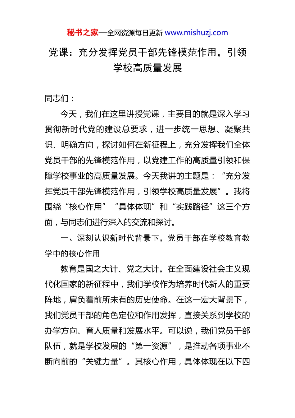 秘书之家—全网资源每日更新 www.mishuzj.com党课:充分发挥党员干部先锋模范作用,引领学校高质量发展 同志们:今天,我们在这里讲授党课,主要目的就是深入学习贯彻新时代党的建设总要求,进一步统一思想、凝聚共识、明确方向,探讨如何在新征程上,充分发挥我们全体党员干部的先锋模范作用,以党建工作的高质量引领和保障学校事业的高质量发展。今天我讲的主题是:“充分发挥党员干部先锋模范作用,引领学校高质量发展”。我将围绕“核心作用”“具体体现”和“实践路径”这三个方面,与同志们进行深入的交流和探讨。一、深刻认识新时代背景下,党员干部在学校教育教学中的核心作用教育是国之大计、党之大计。在全面建设社会主义现代化国家的新征程中,我们学校作为培养时代新人的重要阵地,肩负着前所未有的历史使命。在这一宏大背景下,我们党员干部的角色定位和作用发挥,直接关系到学校的办学方向、育人质量和发展水平。可以说,我们党员干部队伍,就是学校发展的“第一资源”,是推动各项事业不断向前的“关键力量”。其核心作用,具体体现在以下四秘书之家—全网资源每日更新 www.mishuzj.com个方面:(一)是政治引领的“定盘星”。“为党育人、为国育才”是我们的初心和使命。学校作为意识形态工作的前沿阵地,必须牢牢掌握党对教育工作的领导权。我们党员干部,特别是党员领导干部,首先是政治上的明白人,是党的教育方针最忠实的执行者和最坚定的捍卫者。在纷繁复杂的社会思潮面前,我们要始终保持清醒的政治头脑,站稳政治立场,把准政治方向。我们的言行,就是一面旗帜,要确保党的路线方针政策在学校的每一个角落都得到不折不扣地贯彻执行。从课堂教学的价值导向,到校园文化的思想内涵,再到师生员工的精神风貌,我们都必须发挥“定盘星”和“压舱石”的作用,确保学校这艘大船始终沿着正确的航向破浪前行,确保培养出的学生都是理想信念坚定、能够担当民族复兴大任的时代新人。(二)是教育改革的“先锋队”。当前,新一轮科技革命和产业变革正在深刻重塑世界,也对教育提出了前所未有的新挑战和新要求。课程改革、教学模式创新、评价体系重构、数字化转型等,每一项都是难啃的“硬骨头”。面对这些挑战,是畏缩不前、墨守成规,还是勇立潮头、锐意进取?我们党员干部必须选择后者,也只能选择后者。我们要做教育改革的“先锋队”和“突击队”。秘书之家—全网资源每日更新 www.mishuzj.com要带头学习新知识、新理念、新技术,带头探索智慧教育、项目式学习等新型教学模式,带头承担最艰巨的教改课题。正如我们学校正在推进的“智慧课堂”建设项目,冲在最前面的,就应该也必须是我们党员教师。据统计,2025 年上半年,我校立项的 10 项校级重点教研课题中,由党员教师牵头或作为核心成员参与的就有 8 项,这就是先锋作用的最好诠释。我们要在改革的深水区中敢于试、敢于闯,用我们的实际行动,为全校教职工蹚出一条路,带动学校整体教育教学水平的迭代升级。(三)是师德师风的“示范者”。“学高为师,身正为范。”教师的职业特殊性决定了我们不仅是知识的传授者,更是学生品格的塑造者。党员干部的师德师风,更是直接影响着整个教师队伍的风气,关系到学校的声誉和育人成效。我们必须深刻认识到,自己的一言一行,都可能成为学生效仿的标杆;自己的一举一动,都在无声地诠释着“教师”二字的深刻内涵。“其身正,不令而行;其身不正,虽令不从。”我们党员干部要在师德师风建设中走在最前列,要带头遵守《新时代教师职业行为十项准则》,做到以德立身、以德立学、以德施教。要关爱每一名学生,特别是那些家庭困难、学习有困难的同学,用爱心和责任心为他们点亮希望之灯。要淡泊名利、廉洁从秘书之家—全网资源每日更新 www.mishuzj.com教,自觉抵制各种不正之风,以高尚的人格魅力和学识魅力赢得学生的尊敬和爱戴,为全校教师树立起一座座鲜活的道德丰碑。(四)是凝心聚力的“主心骨”。学校的发展,离不开全体教职工的共同努力和团结奋斗。一个有战斗力的集体,必然是一个人心齐、风气正的集体。我们党员干部,就是这个集体中负责团结群众、凝聚...