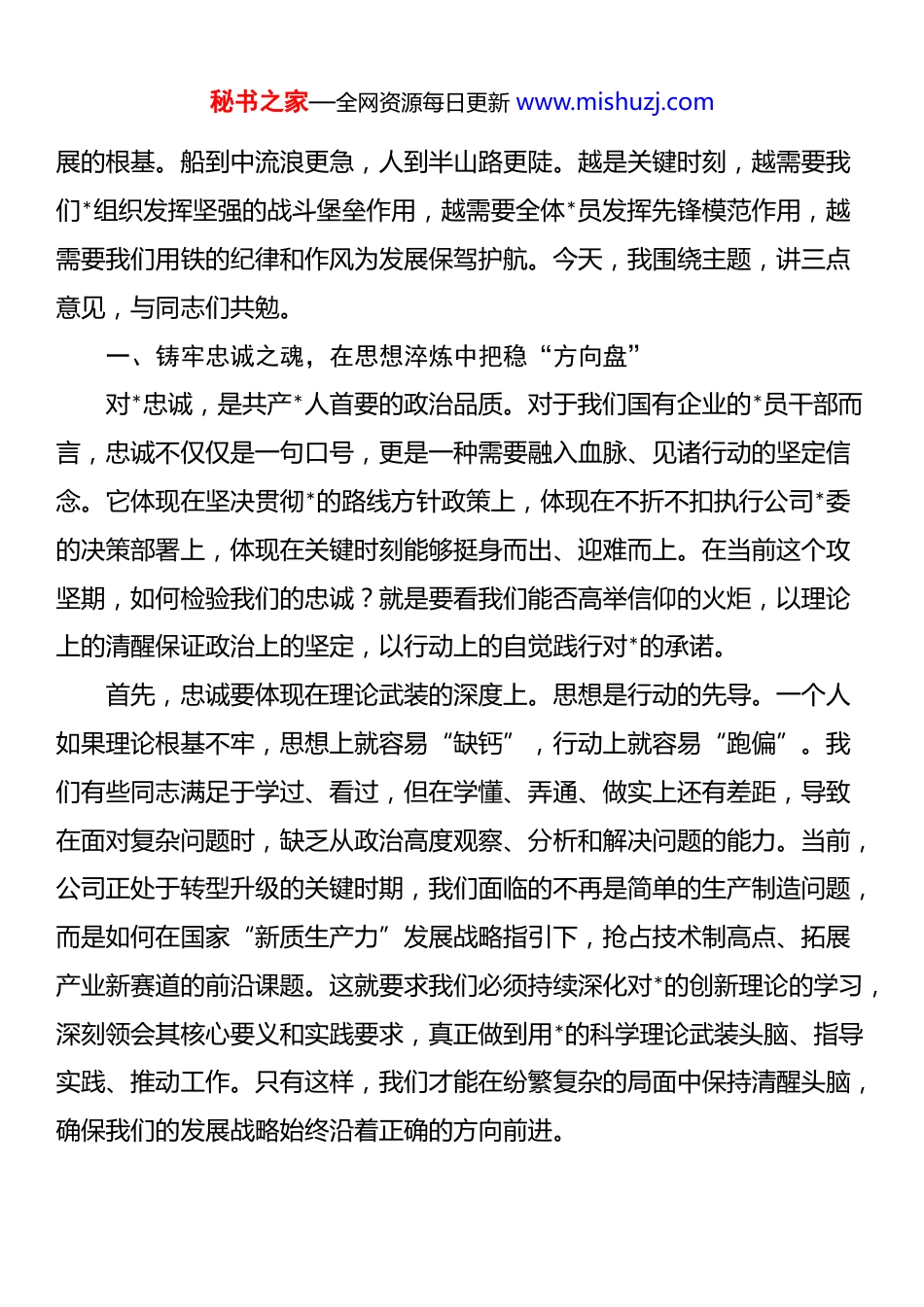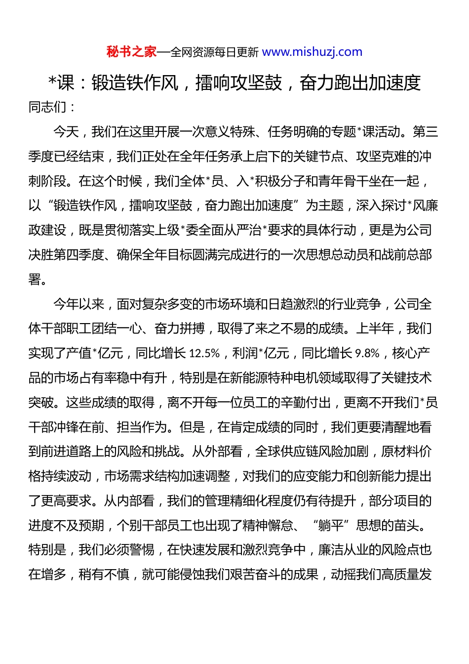 秘书之家—全网资源每日更新 www.mishuzj.com*课:锻造铁作风,擂响攻坚鼓,奋力跑出加速度同志们:今天,我们在这里开展一次意义特殊、任务明确的专题*课活动。第三季度已经结束,我们正处在全年任务承上启下的关键节点、攻坚克难的冲刺阶段。在这个时候,我们全体*员、入*积极分子和青年骨干坐在一起,以“锻造铁作风,擂响攻坚鼓,奋力跑出加速度”为主题,深入探讨*风廉政建设,既是贯彻落实上级*委全面从严治*要求的具体行动,更是为公司决胜第四季度、确保全年目标圆满完成进行的一次思想总动员和战前总部署。今年以来,面对复杂多变的市场环境和日趋激烈的行业竞争,公司全体干部职工团结一心、奋力拼搏,取得了来之不易的成绩。上半年,我们实现了产值*亿元,同比增长 12.5%,利润*亿元,同比增长 9.8%,核心产品的市场占有率稳中有升,特别是在新能源特种电机领域取得了关键技术突破。这些成绩的取得,离不开每一位员工的辛勤付出,更离不开我们*员干部冲锋在前、担当作为。但是,在肯定成绩的同时,我们更要清醒地看到前进道路上的风险和挑战。从外部看,全球供应链风险加剧,原材料价格持续波动,市场需求结构加速调整,对我们的应变能力和创新能力提出了更高要求。从内部看,我们的管理精细化程度仍有待提升,部分项目的进度不及预期,个别干部员工也出现了精神懈怠、“躺平”思想的苗头。特别是,我们必须警惕,在快速发展和激烈竞争中,廉洁从业的风险点也在增多,稍有不慎,就可能侵蚀我们艰苦奋斗的成果,动摇我们高质量发秘书之家—全网资源每日更新 www.mishuzj.com展的根基。船到中流浪更急,人到半山路更陡。越是关键时刻,越需要我们*组织发挥坚强的战斗堡垒作用,越需要全体*员发挥先锋模范作用,越需要我们用铁的纪律和作风为发展保驾护航。今天,我围绕主题,讲三点意见,与同志们共勉。一、铸牢忠诚之魂,在思想淬炼中把稳“方向盘”对*忠诚,是共产*人首要的政治品质。对于我们国有企业的*员干部而言,忠诚不仅仅是一句口号,更是一种需要融入血脉、见诸行动的坚定信念。它体现在坚决贯彻*的路线方针政策上,体现在不折不扣执行公司*委的决策部署上,体现在关键时刻能够挺身而出、迎难而上。在当前这个攻坚期,如何检验我们的忠诚?就是要看我们能否高举信仰的火炬,以理论上的清醒保证政治上的坚定,以行动上的自觉践行对*的承诺。首先,忠诚要体现在理论武装的深度上。思想是行动的先导。一个人如果理论根基不牢,思想上就容易“缺钙”,行动上就容易“跑偏”。我们有些同志满足于学过、看过,但在学懂、弄通、做实上还有差距,导致在面对复杂问题时,缺乏从政治高度观察、分析和解决问题的能力。当前,公司正处于转型升级的关键时期,我们面临的不再是简单的生产制造问题,而是如何在国家“新质生产力”发展战略指引下,抢占技术制高点、拓展产业新赛道的前沿课题。这就要求我们必须持续深化对*的创新理论的学习,深刻领会其核心要义和实践要求,真正做到用*的科学理论武装头脑、指导实践、推动工作。只有这样,我们才能在纷繁复杂的局面中保持清醒头脑,确保我们的发展战略始终沿着正确的方向前进。秘书之家—全网资源每日更新 www.mishuzj.com其次,忠诚要体现在履职尽责的力度上。忠诚不是空谈,而是实干。衡量一名*员干部是否忠诚,最终要看他是否在自己的岗位上创造了实实在在的业绩。在急难险重的任务面前,*员干部就是要第一个站出来,最后一个撤下去。今年上半年,我们的“*系列高效电机”研发团队为了攻克一个关键技术瓶颈,连续一个月吃住在实验室,*员技术骨干*同志带领团队反复试验上千次,最终成功突破,使我们的产品能效比提升了 15%,达到了国际领先水平。这就是忠诚最生动的体现。反观之,少数同志在工作中拈轻怕重、挑肥拣瘦,遇到困难绕着走,碰到矛盾往上交,这本质上就是对组织、对事业的不忠诚。我们每一位*员都要时常叩问自己的内心:在公司需要的时候,我是否能挺身而出?在任务面前,我是否能做到全力以赴?最后,忠诚要体现在严守纪律的尺度上。纪律是带电的“高压线”,是不可逾越的“底线”。d 的纪律和规矩,是忠...