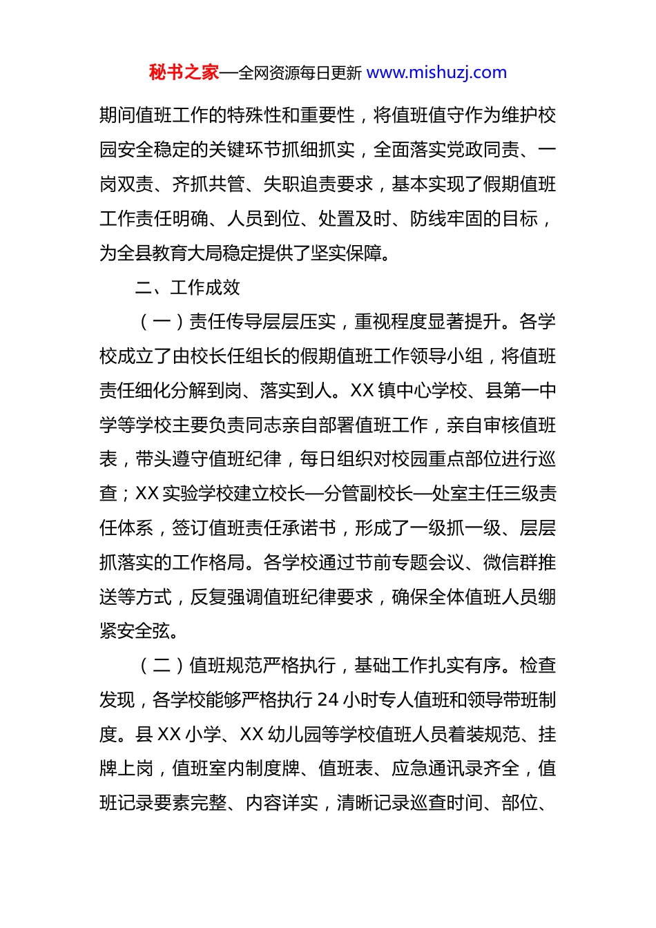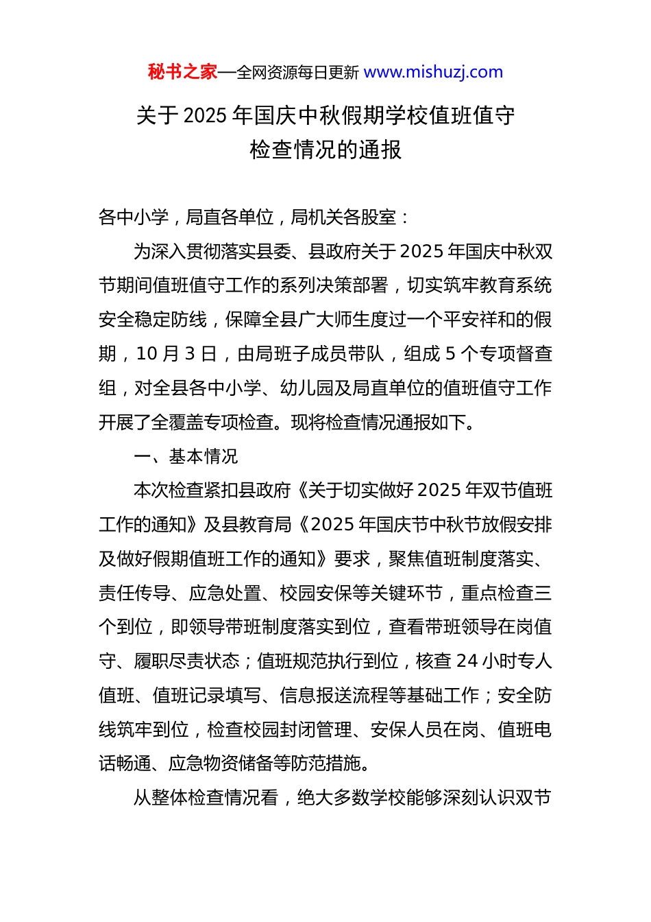 秘书之家—全网资源每日更新 www.mishuzj.com关于 2025 年国庆中秋假期学校值班值守检查情况的通报 各中小学,局直各单位,局机关各股室:为深入贯彻落实县委、县政府关于 2025 年国庆中秋双节期间值班值守工作的系列决策部署,切实筑牢教育系统安全稳定防线,保障全县广大师生度过一个平安祥和的假期,10 月 3 日,由局班子成员带队,组成 5 个专项督查组,对全县各中小学、幼儿园及局直单位的值班值守工作开展了全覆盖专项检查。现将检查情况通报如下。一、基本情况本次检查紧扣县政府《关于切实做好 2025 年双节值班工作的通知》及县教育局《2025 年国庆节中秋节放假安排及做好假期值班工作的通知》要求,聚焦值班制度落实、责任传导、应急处置、校园安保等关键环节,重点检查三个到位,即领导带班制度落实到位,查看带班领导在岗值守、履职尽责状态;值班规范执行到位,核查 24 小时专人值班、值班记录填写、信息报送流程等基础工作;安全防线筑牢到位,检查校园封闭管理、安保人员在岗、值班电话畅通、应急物资储备等防范措施。从整体检查情况看,绝大多数学校能够深刻认识双节秘书之家—全网资源每日更新 www.mishuzj.com期间值班工作的特殊性和重要性,将值班值守作为维护校园安全稳定的关键环节抓细抓实,全面落实党政同责、一岗双责、齐抓共管、失职追责要求,基本实现了假期值班工作责任明确、人员到位、处置及时、防线牢固的目标,为全县教育大局稳定提供了坚实保障。二、工作成效(一)责任传导层层压实,重视程度显著提升。各学校成立了由校长任组长的假期值班工作领导小组,将值班责任细化分解到岗、落实到人。XX 镇中心学校、县第一中学等学校主要负责同志亲自部署值班工作,亲自审核值班表,带头遵守值班纪律,每日组织对校园重点部位进行巡查;XX 实验学校建立校长—分管副校长—处室主任三级责任体系,签订值班责任承诺书,形成了一级抓一级、层层抓落实的工作格局。各学校通过节前专题会议、微信群推送等方式,反复强调值班纪律要求,确保全体值班人员绷紧安全弦。(二)值班规范严格执行,基础工作扎实有序。检查发现,各学校能够严格执行 24 小时专人值班和领导带班制度。县 XX 小学、XX 幼儿园等学校值班人员着装规范、挂牌上岗,值班室内制度牌、值班表、应急通讯录齐全,值班记录要素完整、内容详实,清晰记录巡查时间、部位、秘书之家—全网资源每日更新 www.mishuzj.com发现问题及处置结果;XX 镇中心小学创新实行双人双岗值班模式,明确行政人员与安保人员协同值守职责,有效提升了值班处置效能。各学校能够按要求做好信息报送工作,每日定时向教育局报送平安信息,未发生迟报、漏报情况。(三)应急处置准备充分,响应机制运转高效。各学校普遍修订完善了假期突发事件应急预案,针对性开展了消防、反恐防暴等应急演练。县职业中专配备专职应急值守人员,储备充足的消防器材、急救药品等应急物资,建立应急物资台账并实行动态管理;XX 街道中心学校与辖区派出所、卫生院建立联动机制,明确应急处置流程和联络方式,确保遇有突发情况能够快速响应、有效处置。检查期间,模拟拨打 12 所学校值班电话,能在 3 声内接通,值班人员能够准确回答值班要求及应急处置流程。(四)校园安保防线牢固,安全管控全面到位。各学校严格落实校园封闭管理要求,假期期间仅保留主校门通行,配备 2 名以上安保人员 24 小时值守。XX 镇初中安保人员严格执行入校登记验证制度,对来访人员实行身份核实、电话确认、安全检查、信息登记全流程管理;县四中通过监控设备,实现视频巡查与现场巡查相结合,有效提升了安防智能化水平。截至目前,全县教育系统未发生校秘书之家—全网资源每日更新 www.mishuzj.com园安全责任事故及涉生安全事件。(五)宣传教育深入开展,安全氛围浓厚和谐。各学校在节前通过主题班会、致家长一封信、家校微信群等多种形式,集中开展防溺水、交通安全、消防安全、防范电信网 络诈骗 等安全教育, 严格 落实 1530 安全教育要求。XX 镇初中制作假期安全宣传短视频,通过校园公众号推送,点击量达 X 余...