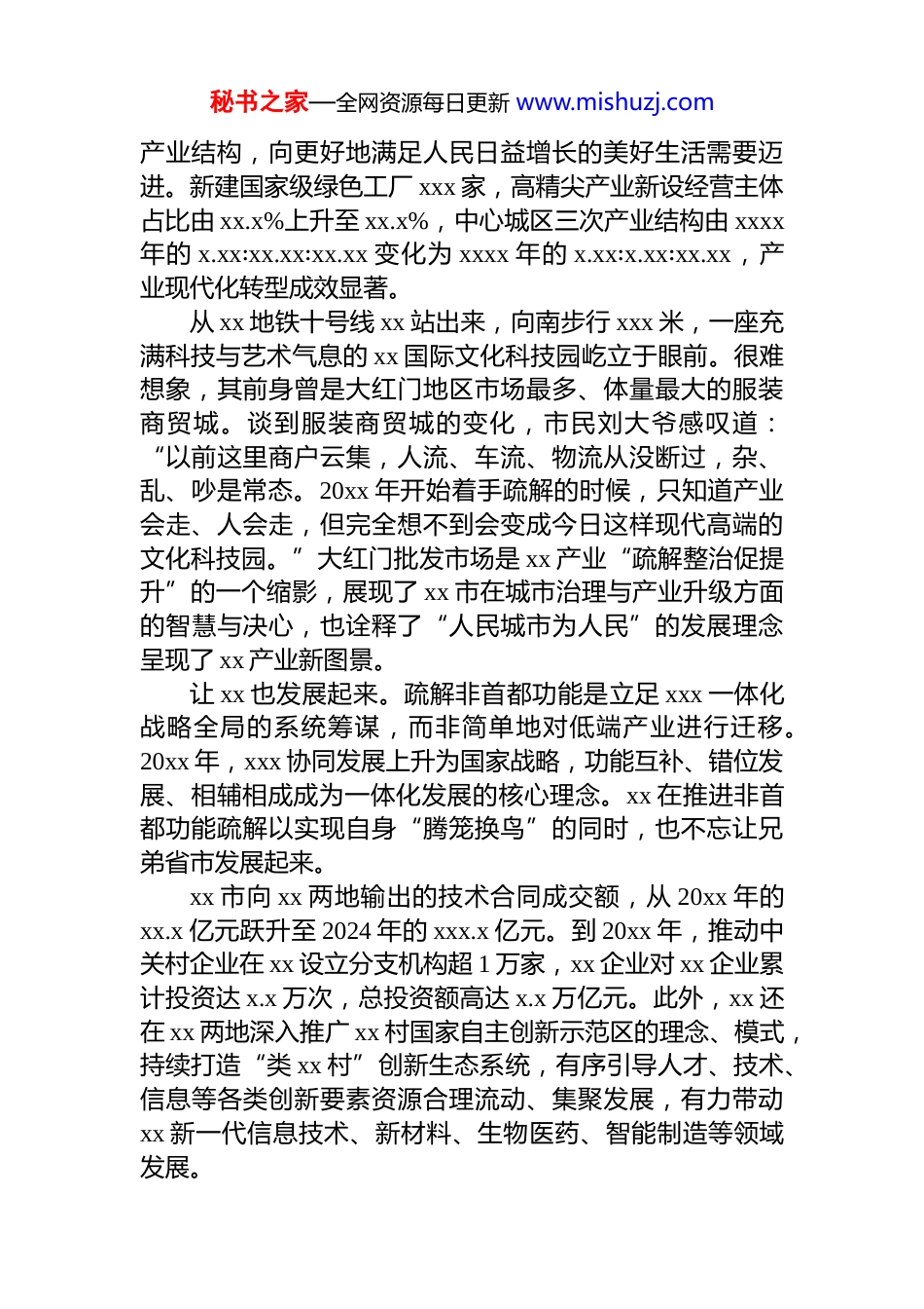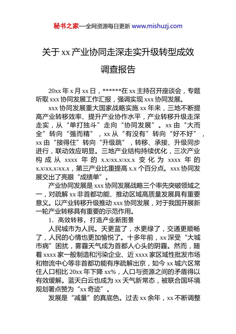 秘书之家—全网资源每日更新 www.mishuzj.com关于 xx 产业协同走深走实升级转型成效调查报告20xx 年 x 月 xx 日,******在 xx 主持召开座谈会,专题听取 xxx 协同发展工作汇报,强调实现 xxx 协同发展。xxx 协同发展重大国家战略实施 xx 年来,三地不断提高产业转移效率、提升产业协作水平,产业转移升级走深走实,从“单打独斗”走向“协同发展”。xx 由“大而全”转向“强而精”,xx 从“有没有”转向“好不好”,xx 由“接得住”转向“升级跳”,转移、承接、升级同步进行,联动效应明显。三地产业结构持续优化,三次产业构 成 从 xxxx 年 的 x.x∶xx.x∶xx.x 变 化 为 xxxx 年 的x.x∶xx.x∶xx.x,第三产业比重提高 x.x 个百分点。xxx 协同发展交出了亮眼“成绩单”。产业协同发展是 xxx 协同发展战略三个率先突破领域之一,对疏解 xx 非首都功能、推动区域高质量发展具有重要意义。以产业转移升级推动 xxx 协同发展,对于我国开展新一轮产业转移具有重要的示范作用。1.高效转移,打造产业新图景人民城市为人民。天更蓝了,水更绿了,交通更顺畅了,人民的心情也更加愉悦了。十多年前,xx 深受“大城市病”困扰,雾霾天气成为首都人心头的阴霾。然而,随着 xxxx 家一般制造和污染企业、近 xxxx 家区域性批发市场和物流中心等非首都功能有序疏解出京,如今 xx 城六区常住人口相比 20xx 年下降 xx%,人口与资源之间的矛盾得以有效缓解。蓝天白云也成为 xx 天气新常态,被联合国环境规划署点赞为“xx 奇迹”。发展是“减量”的真底色。过去 xx 余年,xx 不断调整秘书之家—全网资源每日更新 www.mishuzj.com产业结构,向更好地满足人民日益增长的美好生活需要迈进。新建国家级绿色工厂 xxx 家,高精尖产业新设经营主体占比由 xx.x%上升至 xx.x%,中心城区三次产业结构由 xxxx年的 x.xx∶xx.xx∶xx.xx 变化为 xxxx 年的 x.xx∶x.xx∶xx.xx,产业现代化转型成效显著。从 xx 地铁十号线 xx 站出来,向南步行 xxx 米,一座充满科技与艺术气息的 xx 国际文化科技园屹立于眼前。很难想象,其前身曾是大红门地区市场最多、体量最大的服装商贸城。谈到服装商贸城的变化,市民刘大爷感叹道:“以前这里商户云集,人流、车流、物流从没断过,杂、乱、吵是常态。20xx 年开始着手疏解的时候,只知道产业会走、人会走,但完全想不到会变成今日这样现代高端的文化科技园。”大红门批发市场是 xx 产业“疏解整治促提升”的一个缩影,展现了 xx 市在城市治理与产业升级方面的智慧与决心,也诠释了“人民城市为人民”的发展理念呈现了 xx 产业新图景。让 xx 也发展起来。疏解非首都功能是立足 xxx 一体化战略全局的系统筹谋,而非简单地对低端产业进行迁移。20xx 年,xxx 协同发展上升为国家战略,功能互补、错位发展、相辅相成成为一体化发展的核心理念。xx 在推进非首都功能疏解以实现自身“腾笼换鸟”的同时,也不忘让兄弟省市发展起来。xx 市向 xx 两地输出的技术合同成交额,从 20xx 年的xx.x 亿元跃升至 2024 年的 xxx.x 亿元。到 20xx 年,推动中关村企业在 xx 设立分支机构超 1 万家,xx 企业对 xx 企业累计投资达 x.x 万次,总投资额高达 x.x 万亿元。此外,xx 还在 xx 两地深入推广 xx 村国家自主创新示范区的理念、模式,持续打造“类 xx 村”创新生态系统,有序引导人才、技术、信息等各类创新要素资源合理流动、集聚发展,有力带动xx 新一代信息技术、新材料、生物医药、智能制造等领域发展。秘书之家—全网资源每日更新 www.mishuzj.com制度保障保驾护航。为确保在“迁得出去”的同时能够“落得下来”,xx 联合 xx、xx 不断加强制度保障,共同出台多项政策文件,确保这些主体在 xx 地区落地后,能够享受到完备的基础设施配套服务,从而实现平稳过渡与持续发展,为打造产业新图景保驾护航。2.精准承接,开创产业新局面产业转移承接,对于承接地来说,既要承得住,也要接得稳,还要承得准。为加强 xxx 产业转移承接平台的统筹规划建设,20xx 年...