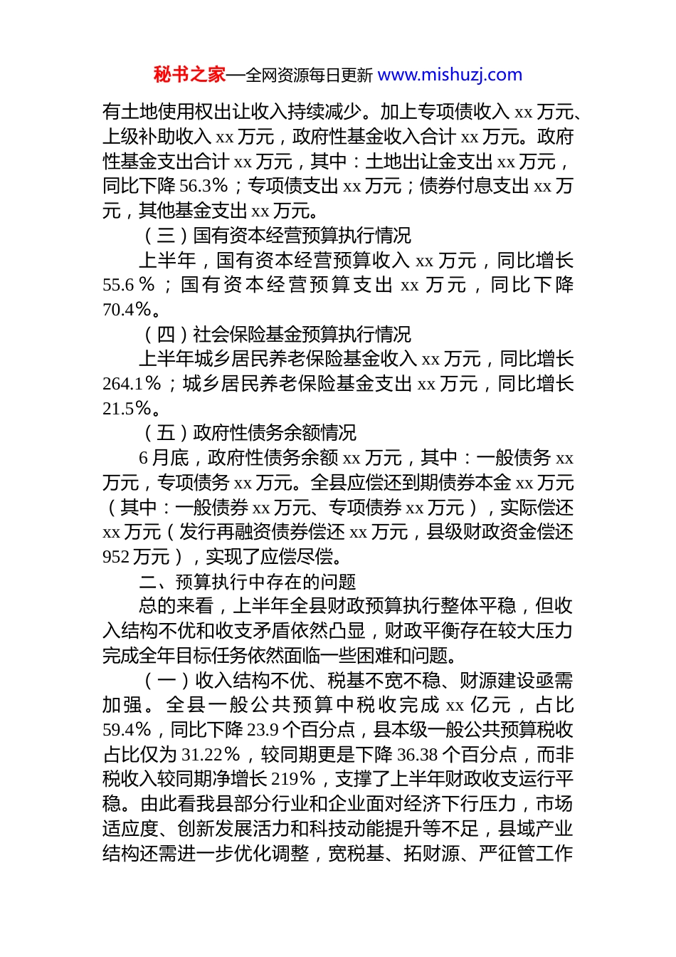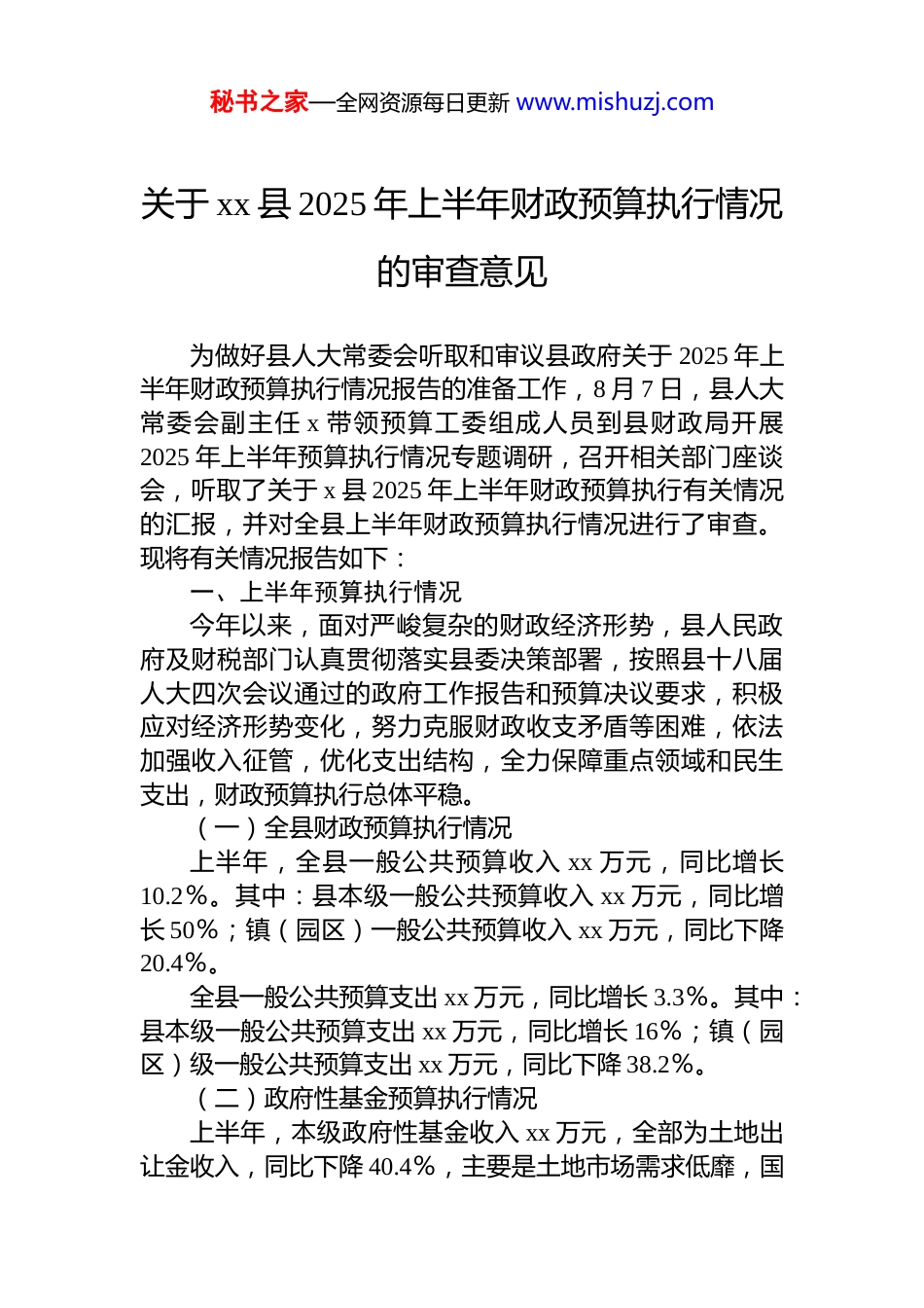 秘书之家—全网资源每日更新 www.mishuzj.com关于 xx 县 2025 年上半年财政预算执行情况的审查意见为做好县人大常委会听取和审议县政府关于 2025 年上半年财政预算执行情况报告的准备工作,8 月 7 日,县人大常委会副主任 x 带领预算工委组成人员到县财政局开展2025 年上半年预算执行情况专题调研,召开相关部门座谈会,听取了关于 x 县 2025 年上半年财政预算执行有关情况的汇报,并对全县上半年财政预算执行情况进行了审查。现将有关情况报告如下:一、上半年预算执行情况今年以来,面对严峻复杂的财政经济形势,县人民政府及财税部门认真贯彻落实县委决策部署,按照县十八届人大四次会议通过的政府工作报告和预算决议要求,积极应对经济形势变化,努力克服财政收支矛盾等困难,依法加强收入征管,优化支出结构,全力保障重点领域和民生支出,财政预算执行总体平稳。(一)全县财政预算执行情况上半年,全县一般公共预算收入 xx 万元,同比增长10.2%。其中:县本级一般公共预算收入 xx 万元,同比增长 50%;镇(园区)一般公共预算收入 xx 万元,同比下降20.4%。全县一般公共预算支出 xx 万元,同比增长 3.3%。其中:县本级一般公共预算支出 xx 万元,同比增长 16%;镇(园区)级一般公共预算支出 xx 万元,同比下降 38.2%。(二)政府性基金预算执行情况上半年,本级政府性基金收入 xx 万元,全部为土地出让金收入,同比下降 40.4%,主要是土地市场需求低靡,国秘书之家—全网资源每日更新 www.mishuzj.com有土地使用权出让收入持续减少。加上专项债收入 xx 万元、上级补助收入 xx 万元,政府性基金收入合计 xx 万元。政府性基金支出合计 xx 万元,其中:土地出让金支出 xx 万元,同比下降 56.3%;专项债支出 xx 万元;债券付息支出 xx 万元,其他基金支出 xx 万元。(三)国有资本经营预算执行情况上半年,国有资本经营预算收入 xx 万元,同比增长55.6 % ; 国 有 资 本 经 营 预 算 支 出 xx 万 元 , 同 比 下 降70.4%。(四)社会保险基金预算执行情况上半年城乡居民养老保险基金收入 xx 万元,同比增长264.1%;城乡居民养老保险基金支出 xx 万元,同比增长21.5%。(五)政府性债务余额情况6 月底,政府性债务余额 xx 万元,其中:一般债务 xx万元,专项债务 xx 万元。全县应偿还到期债券本金 xx 万元(其中:一般债券 xx 万元、专项债券 xx 万元),实际偿还xx 万元(发行再融资债券偿还 xx 万元,县级财政资金偿还952 万元),实现了应偿尽偿。二、预算执行中存在的问题总的来看,上半年全县财政预算执行整体平稳,但收入结构不优和收支矛盾依然凸显,财政平衡存在较大压力完成全年目标任务依然面临一些困难和问题。(一)收入结构不优、税基不宽不稳、财源建设亟需加 强 。 全 县 一 般 公 共 预 算 中 税 收 完 成 xx 亿 元 , 占 比59.4%,同比下降 23.9 个百分点,县本级一般公共预算税收占比仅为 31.22%,较同期更是下降 36.38 个百分点,而非税收入较同期净增长 219%,支撑了上半年财政收支运行平稳。由此看我县部分行业和企业面对经济下行压力,市场适应度、创新发展活力和科技动能提升等不足,县域产业结构还需进一步优化调整,宽税基、拓财源、严征管工作秘书之家—全网资源每日更新 www.mishuzj.com亟需加强。(二)刚性支出增大、收支矛盾依然、支出结构需再优化。面对财政收入特别是税收增长压力,刚性支出只增不减,上半年全县一般公共预算财政自给率为 51%,县本级仅为 35%,从一般公共预算支出科目看,教育、农业、卫生健康都有不同程度增幅,一般公共服务和社会保障就业都有 2 位数增长,全县民生类支出较去年同期增长11.2%,收支矛盾依然较为突出,“三保”等重点支出保障面临挑战。(三)预算绩效待提升、风险管控压力犹存、财政监督需加强。部分预算单位和项目预算绩效目标设定不够科学合理,绩效评价指标体系尚不完善,绩效指标设置与财政支出标准的衔接匹配性不强,绩效评价结果运用不充分债...