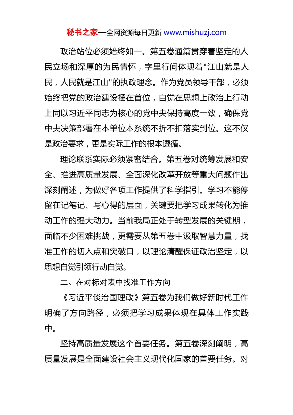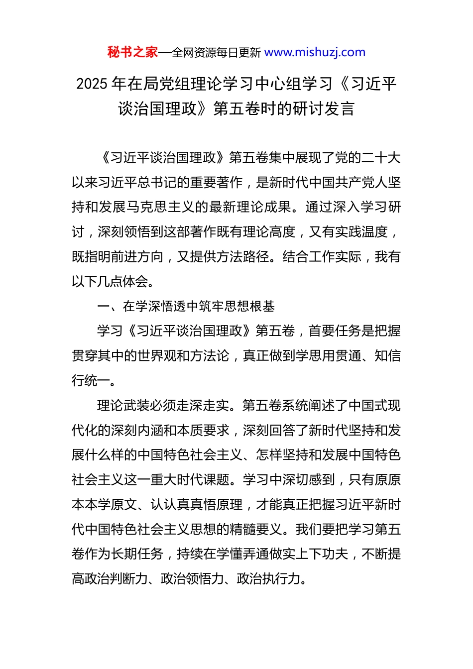 秘书之家—全网资源每日更新 www.mishuzj.com2025 年在局党组理论学习中心组学习《习近平谈治国理政》第五卷时的研讨发言 《习近平谈治国理政》第五卷集中展现了党的二十大以来习近平总书记的重要著作,是新时代中国共产党人坚持和发展马克思主义的最新理论成果。通过深入学习研讨,深刻领悟到这部著作既有理论高度,又有实践温度,既指明前进方向,又提供方法路径。结合工作实际,我有以下几点体会。一、在学深悟透中筑牢思想根基学习《习近平谈治国理政》第五卷,首要任务是把握贯穿其中的世界观和方法论,真正做到学思用贯通、知信行统一。理论武装必须走深走实。第五卷系统阐述了中国式现代化的深刻内涵和本质要求,深刻回答了新时代坚持和发展什么样的中国特色社会主义、怎样坚持和发展中国特色社会主义这一重大时代课题。学习中深切感到,只有原原本本学原文、认认真真悟原理,才能真正把握习近平新时代中国特色社会主义思想的精髓要义。我们要把学习第五卷作为长期任务,持续在学懂弄通做实上下功夫,不断提高政治判断力、政治领悟力、政治执行力。秘书之家—全网资源每日更新 www.mishuzj.com政治站位必须始终如一。第五卷通篇贯穿着坚定的人民立场和深厚的为民情怀,字里行间体现着"江山就是人民,人民就是江山"的执政理念。作为党员领导干部,必须始终把党的政治建设摆在首位,自觉在思想上政治上行动上同以习近平同志为核心的党中央保持高度一致,确保党中央决策部署在本单位本系统不折不扣落实到位。这不仅是政治要求,更是实际工作的根本遵循。理论联系实际必须紧密结合。第五卷对统筹发展和安全、推进高质量发展、全面深化改革开放等重大问题作出深刻阐述,为做好各项工作提供了科学指引。学习不能停留在记笔记、写心得的层面,关键要把学习成果转化为推动工作的强大动力。当前我局正处于转型发展的关键期,面临不少困难挑战,更需要从第五卷中汲取智慧力量,找准工作的切入点和突破口,以理论清醒保证政治坚定,以思想自觉引领行动自觉。二、在对标对表中找准工作方向《习近平谈治国理政》第五卷为我们做好新时代工作明确了方向路径,必须把学习成果体现在具体工作实践中。坚持高质量发展这个首要任务。第五卷深刻阐明,高质量发展是全面建设社会主义现代化国家的首要任务。对秘书之家—全网资源每日更新 www.mishuzj.com照这一要求反思工作,我们在推动发展过程中还存在质量效益不高、创新能力不强等短板。必须完整、准确、全面贯彻新发展理念,把高质量发展要求贯穿工作全过程各方面。一是强化创新驱动,加大科技投入力度,推动关键技术攻关取得突破,以创新为发展注入新动能。二是优化发展结构,推进传统业务转型升级,培育新的增长点,实现发展方式从规模扩张向质量提升转变。三是提升服务效能,深化"放管服"改革,优化办事流程,让群众和企业办事更便捷更高效。增强防范化解风险的本领能力。第五卷强调要坚持底线思维,增强忧患意识,着力防范化解重大风险。当前外部环境复杂严峻,各类风险隐患交织叠加,我们必须时刻保持清醒头脑,提高见微知著的能力。一是健全风险防控机制,完善风险研判、评估、预警体系,做到早发现、早报告、早处置。二是加强重点领域监管,对涉及安全稳定的关键环节严格把关,决不能出现系统性风险。三是提升应急处置能力,完善应急预案,加强演练培训,确保一旦出现突发情况能够迅速反应、妥善应对。践行以人民为中心的发展思想。第五卷反复强调要坚持人民至上,把人民对美好生活的向往作为奋斗目标。检视工作发现,一些同志对群众诉求重视不够,服务意识有秘书之家—全网资源每日更新 www.mishuzj.com待增强。必须树牢群众观点,站稳人民立场,真正把群众的急难愁盼问题放在心上。一是畅通诉求渠道,完善群众意见建议收集反馈机制,确保群众声音能够及时传递上来。二是解决突出问题,聚焦群众反映强烈的堵点难点,一件接着一件办,一年接着一年干,让群众看到实实在在的变化。三是改进工作作风,力戒形式主义官僚主义,多做雪中送炭的事,少做锦上添花的事,以实际行动赢得群众信赖。三、在担当作为中展现实干成效学习的目的在...