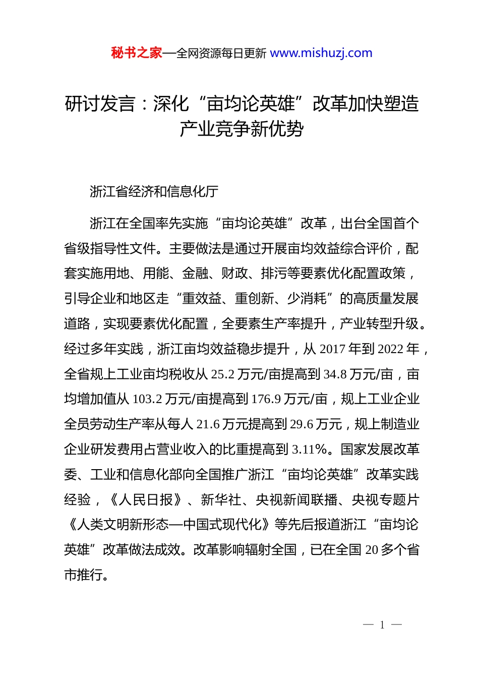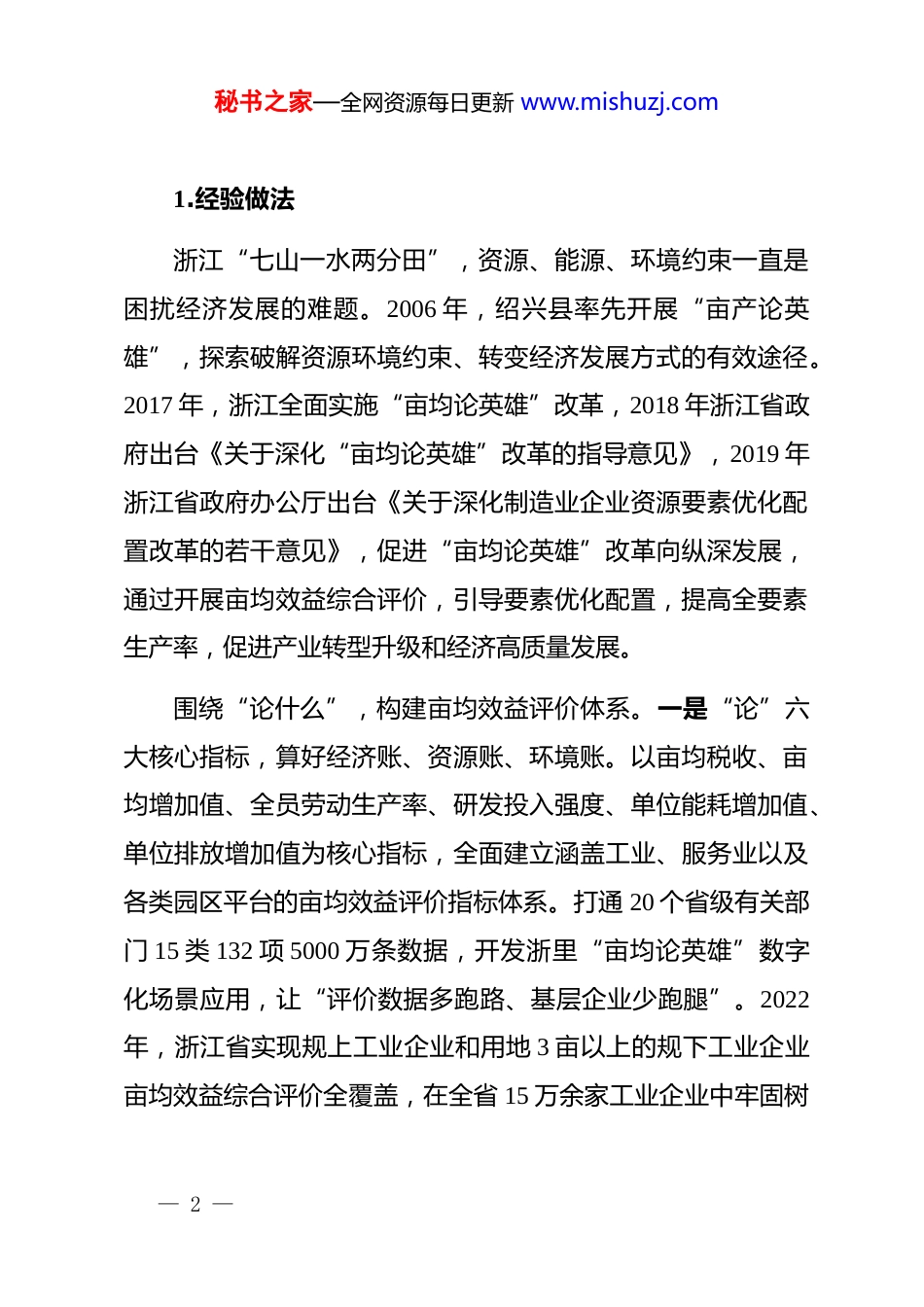 秘书之家—全网资源每日更新 www.mishuzj.com研讨发言:深化“亩均论英雄”改革加快塑造产业竞争新优势浙江省经济和信息化厅浙江在全国率先实施“亩均论英雄”改革,出台全国首个省级指导性文件。主要做法是通过开展亩均效益综合评价,配套实施用地、用能、金融、财政、排污等要素优化配置政策,引导企业和地区走“重效益、重创新、少消耗”的高质量发展道路,实现要素优化配置,全要素生产率提升,产业转型升级。经过多年实践,浙江亩均效益稳步提升,从 2017 年到 2022 年,全省规上工业亩均税收从 25.2 万元/亩提高到 34.8 万元/亩,亩均增加值从 103.2 万元/亩提高到 176.9 万元/亩,规上工业企业全员劳动生产率从每人 21.6 万元提高到 29.6 万元,规上制造业企业研发费用占营业收入的比重提高到 3.11%。国家发展改革委、工业和信息化部向全国推广浙江“亩均论英雄”改革实践经验,《人民日报》、新华社、央视新闻联播、央视专题片《人类文明新形态—中国式现代化》等先后报道浙江“亩均论英雄”改革做法成效。改革影响辐射全国,已在全国 20 多个省市推行。— 1 —秘书之家—全网资源每日更新 www.mishuzj.com1.经验做法浙江“七山一水两分田”,资源、能源、环境约束一直是困扰经济发展的难题。2006 年,绍兴县率先开展“亩产论英雄”,探索破解资源环境约束、转变经济发展方式的有效途径。2017 年,浙江全面实施“亩均论英雄”改革,2018 年浙江省政府出台《关于深化“亩均论英雄”改革的指导意见》,2019 年浙江省政府办公厅出台《关于深化制造业企业资源要素优化配置改革的若干意见》,促进“亩均论英雄”改革向纵深发展,通过开展亩均效益综合评价,引导要素优化配置,提高全要素生产率,促进产业转型升级和经济高质量发展。围绕“论什么”,构建亩均效益评价体系。一是“论”六大核心指标,算好经济账、资源账、环境账。以亩均税收、亩均增加值、全员劳动生产率、研发投入强度、单位能耗增加值、单位排放增加值为核心指标,全面建立涵盖工业、服务业以及各类园区平台的亩均效益评价指标体系。打通 20 个省级有关部门 15 类 132 项 5000 万条数据,开发浙里“亩均论英雄”数字化场景应用,让“评价数据多跑路、基层企业少跑腿”。2022年,浙江省实现规上工业企业和用地 3 亩以上的规下工业企业亩均效益综合评价全覆盖,在全省 15 万余家工业企业中牢固树— 2 —秘书之家—全网资源每日更新 www.mishuzj.com立“重效益、重创新、少消耗”的高质量发展导向。 二是“论”企业发展实绩,让评价体系更为科学合理。评价过程突出分类分业,对民生保障类、科技创新类、新兴产业培育类、产业链关键环节企业等加大扶持培育力度;对初创企业、“小升规”企业、重大项目建设期内企业等,视情设置一定过渡期暂不评价;对高耗能高排放行业加大单位能耗增加值、单位排放增加值等绿色发展指标的权重。同时,鼓励各地结合当地发展基础和产业特色,丰富评价指标体系,既遵照全省统一的要求,又充分彰显地方特点,符合企业现实需求。围绕“怎么论”,建立正向激励、反向推动的工作机制。一是加大正向激励力度。坚持利用效率高,要素供给多,全省统一、规范实施、政策协同,依据亩均效益综合评价结果,配套实施金融、用地、用能、排污、财政等要素优化配置政策,对 a、b 类企业给予优先支持,促进资源要素向亩均效益高的企业集聚,努力实现以最小的资源环境消耗换取最大的发展效益。2022 年,浙江省针对亩均效益 a、b 类企业,优先支持财政奖补资金 289.5 亿元,优先支持用地 7.5 万亩,有力促进了企业、产业转型升级。将“亩均论英雄”改革理念前移,融入“标准地”改革,发挥改革共振效应。二是加大反向推动力度。深入— 3 —秘书之家—全网资源每日更新 www.mishuzj.com实施制造业“腾笼换鸟、凤凰涅槃”攻坚行动,加强对低效用地(企业)的分类帮扶、综合治理。利用大数据精准识别低效工业地块、园区、企业,落实属地政府主体责任和职能部门协同责任,通过兼并重组、整体腾退、搬迁入园、改造提升、依法整治等途径系统治理,帮扶...
