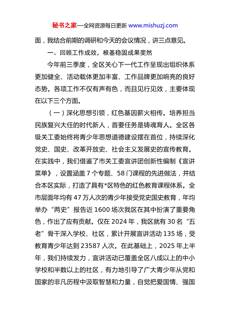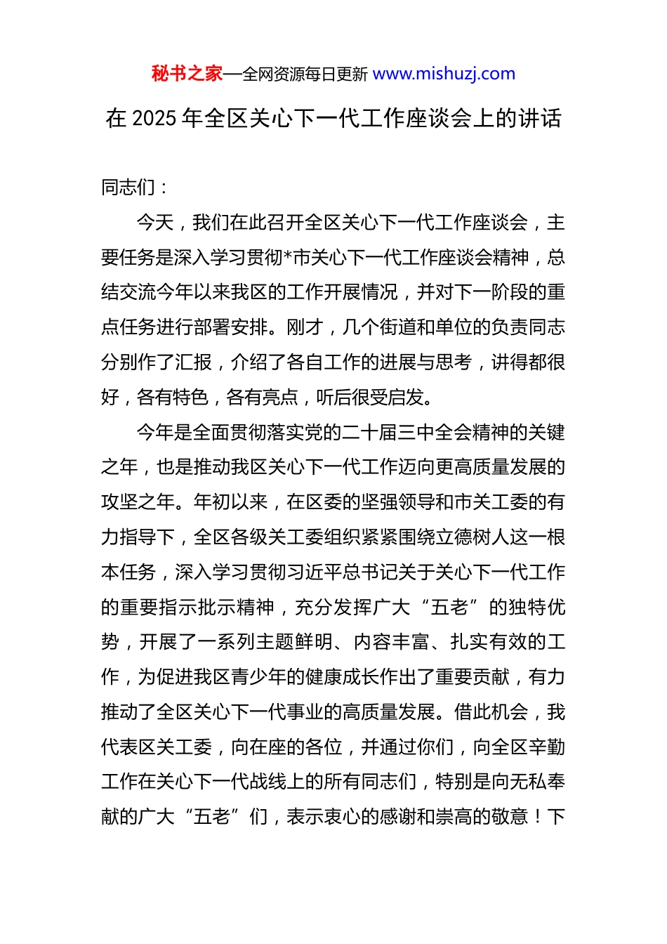 秘书之家—全网资源每日更新 www.mishuzj.com在 2025 年全区关心下一代工作座谈会上的讲话 同志们:今天,我们在此召开全区关心下一代工作座谈会,主要任务是深入学习贯彻*市关心下一代工作座谈会精神,总结交流今年以来我区的工作开展情况,并对下一阶段的重点任务进行部署安排。刚才,几个街道和单位的负责同志分别作了汇报,介绍了各自工作的进展与思考,讲得都很好,各有特色,各有亮点,听后很受启发。今年是全面贯彻落实党的二十届三中全会精神的关键之年,也是推动我区关心下一代工作迈向更高质量发展的攻坚之年。年初以来,在区委的坚强领导和市关工委的有力指导下,全区各级关工委组织紧紧围绕立德树人这一根本任务,深入学习贯彻习近平总书记关于关心下一代工作的重要指示批示精神,充分发挥广大“五老”的独特优势,开展了一系列主题鲜明、内容丰富、扎实有效的工作,为促进我区青少年的健康成长作出了重要贡献,有力推动了全区关心下一代事业的高质量发展。借此机会,我代表区关工委,向在座的各位,并通过你们,向全区辛勤工作在关心下一代战线上的所有同志们,特别是向无私奉献的广大“五老”们,表示衷心的感谢和崇高的敬意!下秘书之家—全网资源每日更新 www.mishuzj.com面,我结合前期的调研和今天的会议情况,讲三点意见。一、回顾工作成效,根基稳固成果斐然今年前三季度,全区关心下一代工作呈现出组织体系更加健全、活动载体更加丰富、工作品牌更加响亮的良好态势。各项工作不仅有声有色,而且见行见效,主要体现在以下三个方面。(一)深化思想引领,红色基因薪火相传。培养担当民族复兴大任的时代新人,首要任务是铸魂育人。全区各级关工委始终将青少年思想道德建设摆在首位,持续深化党史、国史、改革开放史、社会主义发展史的宣传教育。在实践中,我们借鉴了市关工委宣讲团创新性编制《宣讲菜单》,设置涵盖 7 个专题、58 门课程的先进做法,并结合本区实际,打造了具有*区特色的红色教育课程体系。全市层面年均有 47 万人次的青少年接受党史国史教育,年均举办“两史”报告近 1600 场次我区在其中扮演了重要角色,作出了应有贡献。仅在 2024 年,我区就有 30 名“五老”骨干深入学校、社区,累计开展宣讲活动 135 场,受教育青少年达到 23587 人次。在此基础上,2025 年上半年,我们持续发力,宣讲活动已覆盖全区八成以上的中小学校和半数以上的社区,有力地引导了广大青少年从党和国家的非凡历程中汲取智慧和力量,自觉把爱国情、强国秘书之家—全网资源每日更新 www.mishuzj.com志、报国行融入人生追求。(二)聚焦立德树人,三项教育协同发力。立德树人是一项系统工程,需要家庭、学校、社会同向发力。我们着力推动法治教育、家庭教育和心理健康教育的深度融合,构建起了协同育人的大格局。在家庭教育方面,我区持续推进的“家庭教育品质提升行动”取得了显著成效,通过“基层点单、送教上门”等灵活形式,累计开展专题宣讲 120 余场次,惠及家长和青少年逾万人。我们还依托全区建成的 65 处青少年教育基地,将家庭教育指导服务延伸至基层末梢,打通了服务群众的“最后一公里”。在法治教育方面,一些街道关工委主动与司法所、派出所等单位联动,邀请法治副校长和“五老”法律工作者,通过模拟法庭、案例分析等青少年喜闻乐见的形式,将法治的种子播撒进孩子们的心田。在心理健康方面,我们关注到当前青少年成长中的新情况、新问题,积极链接专业心理咨询资源,开展团体辅导和个体咨询,为孩子们的健康心灵保驾护航。(三)创新平台载体,“五老”品牌愈发闪亮。“五老”是关心下一代工作的宝贵财富和中坚力量。如何把这支队伍的优势发挥好,是我们工作的关键。今年以来,全区在“五老”工作室的规范化建设上取得了新进展。我们秘书之家—全网资源每日更新 www.mishuzj.com不仅鼓励创建以“五老”个人名字命名的特色工作室,还积极推动建立功能型的“五老”工作室集群,例如,有的街道整合辖区内退休老教师资源,成立了“学业辅导”工作室;有的社区依托退役军人服务站,建立了“红色传承”工作室。这些工作室已经成为凝...