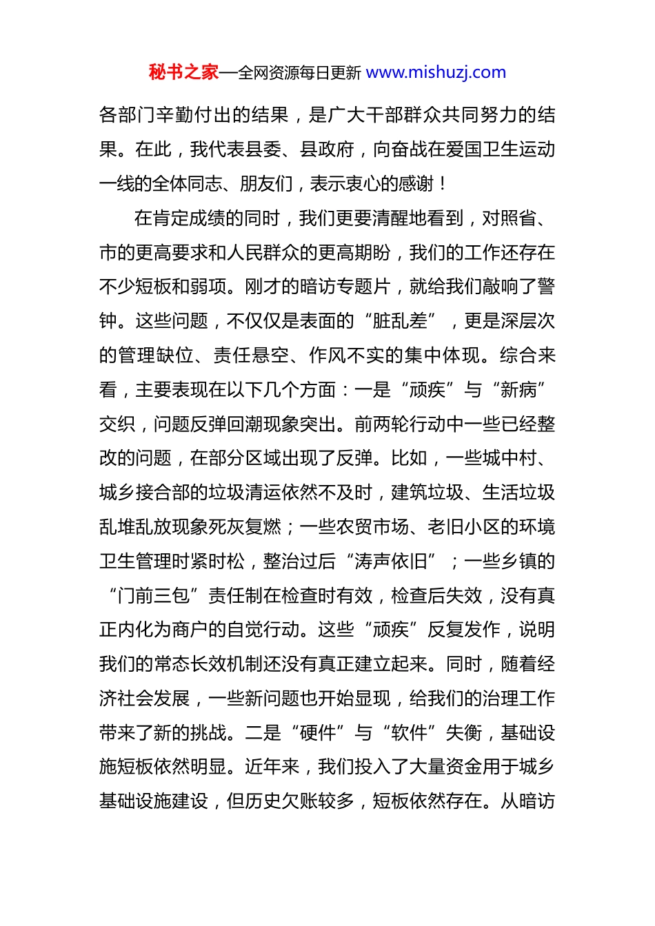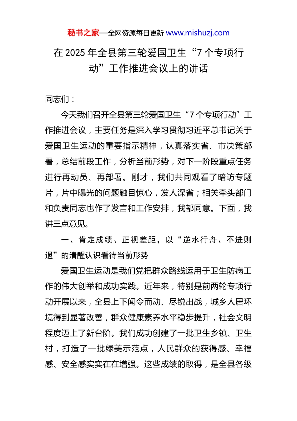 秘书之家—全网资源每日更新 www.mishuzj.com在 2025 年全县第三轮爱国卫生“7 个专项行动”工作推进会议上的讲话 同志们:今天我们召开全县第三轮爱国卫生“7 个专项行动”工作推进会议,主要任务是深入学习贯彻习近平总书记关于爱国卫生运动的重要指示精神,认真落实省、市决策部署,总结前段工作,分析当前形势,对下一阶段重点任务进行再动员、再部署。刚才,我们共同观看了暗访专题片,片中曝光的问题触目惊心,发人深省;相关牵头部门和负责同志也作了发言和工作安排,我都同意。下面,我讲三点意见。一、肯定成绩、正视差距,以“逆水行舟、不进则退”的清醒认识看待当前形势爱国卫生运动是我们党把群众路线运用于卫生防病工作的伟大创举和成功实践。近年来,特别是前两轮专项行动开展以来,全县上下闻令而动、尽锐出战,城乡人居环境得到显著改善,群众健康素养水平稳步提升,社会文明程度迈上了新台阶。我们成功创建了一批卫生乡镇、卫生村,打造了一批绿美示范点,人民群众的获得感、幸福感、安全感实实在在增强。这些成绩的取得,是全县各级秘书之家—全网资源每日更新 www.mishuzj.com各部门辛勤付出的结果,是广大干部群众共同努力的结果。在此,我代表县委、县政府,向奋战在爱国卫生运动一线的全体同志、朋友们,表示衷心的感谢!在肯定成绩的同时,我们更要清醒地看到,对照省、市的更高要求和人民群众的更高期盼,我们的工作还存在不少短板和弱项。刚才的暗访专题片,就给我们敲响了警钟。这些问题,不仅仅是表面的“脏乱差”,更是深层次的管理缺位、责任悬空、作风不实的集中体现。综合来看,主要表现在以下几个方面:一是“顽疾”与“新病”交织,问题反弹回潮现象突出。前两轮行动中一些已经整改的问题,在部分区域出现了反弹。比如,一些城中村、城乡接合部的垃圾清运依然不及时,建筑垃圾、生活垃圾乱堆乱放现象死灰复燃;一些农贸市场、老旧小区的环境卫生管理时紧时松,整治过后“涛声依旧”;一些乡镇的“门前三包”责任制在检查时有效,检查后失效,没有真正内化为商户的自觉行动。这些“顽疾”反复发作,说明我们的常态长效机制还没有真正建立起来。同时,随着经济社会发展,一些新问题也开始显现,给我们的治理工作带来了新的挑战。二是“硬件”与“软件”失衡,基础设施短板依然明显。近年来,我们投入了大量资金用于城乡基础设施建设,但历史欠账较多,短板依然存在。从暗访秘书之家—全网资源每日更新 www.mishuzj.com片中可以看到,部分乡镇的公厕设施损坏严重,洗手设施形同虚设,漏水、无皂液等问题普遍存在,这不仅影响使用,更传播疾病;一些背街小巷、老旧小区道路破损、管网堵塞,污水横流;部分餐饮小店、食品摊贩的防鼠、防蚊、防蝇“三防”设施严重缺失,食品安全存在巨大隐患。这些“硬件”上的不足,直接制约了我们专项行动的成效。三是“表象”与“里子”脱节,精细化管理水平亟待提升。我们的工作,很多时候还停留在扫干净、摆整齐的“面子”功夫上,缺乏“绣花”功夫和“里子”意识。比如,城市管理中,对车辆乱停乱放、商铺占道经营等问题,往往是运动式、突击式治理,缺乏常态化的疏导和执法;在农村人居环境整治中,对生活垃圾的分类处理、生活污水的有效治理、厕所粪污的无害化处置等关键环节,还存在思路不清、措施不力、效果不佳的问题。这些都反映出我们的管理理念、管理方式、管理能力与新时代的要求还不相适应。四是“上热”与“下冷”并存,全民参与氛围尚未形成。县委、县政府高度重视,各牵头部门也积极推动,但压力传导层层递减,“上热中温下冷”的现象依然存在。部分基层单位和干部存在畏难情绪、厌战心理,认为专项行动是“一阵风”,工作标准不高、要求不严;广大群众的知晓率、参与度还有待提高,“健康第一秘书之家—全网资源每日更新 www.mishuzj.com责任人”的意识还没有深入人心,乱扔垃圾、随地吐痰等不文明行为仍时有发生。同志们,问题是时代的声音,也是我们工作的导向。我们必须以“成绩每天归零”的心态,以“时时放心不下”的责任感,深刻反思、举一反三,拿出刮骨疗毒的勇气和壮士断腕的决...