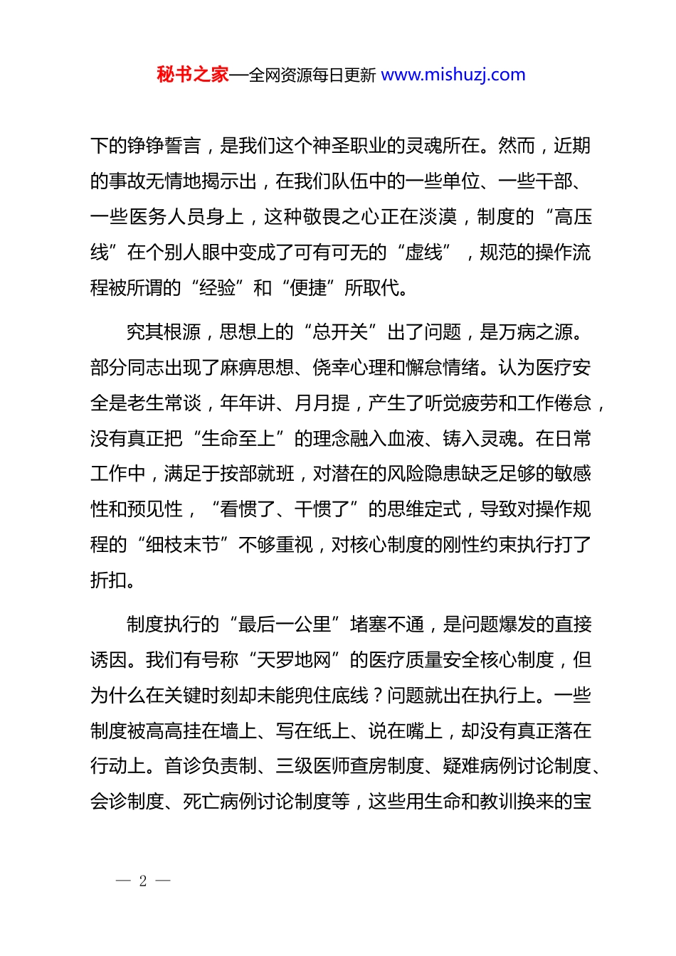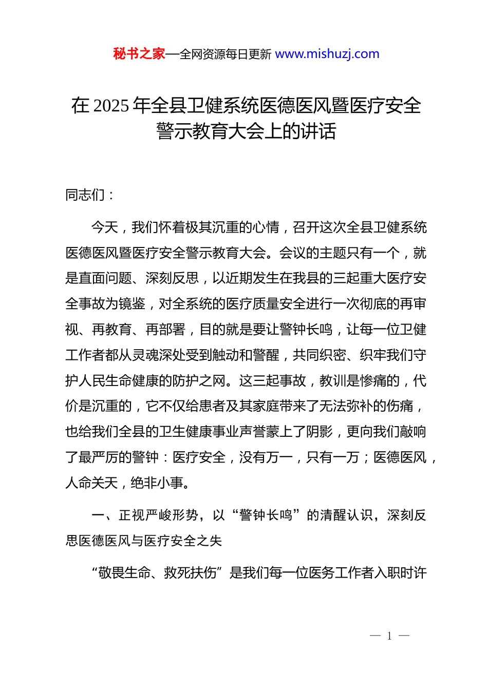 秘书之家—全网资源每日更新 www.mishuzj.com在 2025 年全县卫健系统医德医风暨医疗安全警示教育大会上的讲话同志们:今天,我们怀着极其沉重的心情,召开这次全县卫健系统医德医风暨医疗安全警示教育大会。会议的主题只有一个,就是直面问题、深刻反思,以近期发生在我县的三起重大医疗安全事故为镜鉴,对全系统的医疗质量安全进行一次彻底的再审视、再教育、再部署,目的就是要让警钟长鸣,让每一位卫健工作者都从灵魂深处受到触动和警醒,共同织密、织牢我们守护人民生命健康的防护之网。这三起事故,教训是惨痛的,代价是沉重的,它不仅给患者及其家庭带来了无法弥补的伤痛,也给我们全县的卫生健康事业声誉蒙上了阴影,更向我们敲响了最严厉的警钟:医疗安全,没有万一,只有一万;医德医风,人命关天,绝非小事。一、正视严峻形势,以“警钟长鸣”的清醒认识,深刻反思医德医风与医疗安全之失“敬畏生命、救死扶伤”是我们每一位医务工作者入职时许— 1 —秘书之家—全网资源每日更新 www.mishuzj.com下的铮铮誓言,是我们这个神圣职业的灵魂所在。然而,近期的事故无情地揭示出,在我们队伍中的一些单位、一些干部、一些医务人员身上,这种敬畏之心正在淡漠,制度的“高压线”在个别人眼中变成了可有可无的“虚线”,规范的操作流程被所谓的“经验”和“便捷”所取代。究其根源,思想上的“总开关”出了问题,是万病之源。部分同志出现了麻痹思想、侥幸心理和懈怠情绪。认为医疗安全是老生常谈,年年讲、月月提,产生了听觉疲劳和工作倦怠,没有真正把“生命至上”的理念融入血液、铸入灵魂。在日常工作中,满足于按部就班,对潜在的风险隐患缺乏足够的敏感性和预见性,“看惯了、干惯了”的思维定式,导致对操作规程的“细枝末节”不够重视,对核心制度的刚性约束执行打了折扣。制度执行的“最后一公里”堵塞不通,是问题爆发的直接诱因。我们有号称“天罗地网”的医疗质量安全核心制度,但为什么在关键时刻却未能兜住底线?问题就出在执行上。一些制度被高高挂在墙上、写在纸上、说在嘴上,却没有真正落在行动上。首诊负责制、三级医师查房制度、疑难病例讨论制度、会诊制度、死亡病例讨论制度等,这些用生命和教训换来的宝— 2 —秘书之家—全网资源每日更新 www.mishuzj.com贵经验,在实际工作中是否做到了不折不扣、不留死角?我们必须扪心自问。当制度的权威性被漠视,当操作的规范性被随意简化,事故的发生就从偶然变成了必然。监督管理的“牙齿”没有真正咬合,是责任链条断裂的重要原因。管理责任的虚化、监督检查的弱化、追责问责的软化,为医疗安全隐患的滋生提供了土壤。部分医疗机构的管理者,对医疗质量安全的重视程度仅仅停留在开会发文层面,日常监管“雨过地皮湿”,满足于走马观花式的检查,缺乏深入科室、深入环节,去发现真实问题的决心和手段。对发现的问题,往往是批评教育多,动真碰硬少,没有形成强大的震慑力。这种“宽松软”的管理状态,实质上是对患者生命安全的不负责,也是对我们医务人员自身职业生涯的不负责。同志们,血的教训必须汲取,惨痛的代价不能白付。我们必须清醒地认识到,当前我县医疗安全形势依然严峻复杂,我们正走在一条布满风险的钢丝绳上,稍有不慎,就可能坠入万丈深渊。全县卫健系统必须立即行动起来,以刮骨疗毒的勇气和壮士断腕的决心,彻底整治沉疴积弊,坚决扭转被动局面。二、聚焦关键环节,以“时时放心不下”的责任担当,全面织密医疗质量安全之网— 3 —秘书之家—全网资源每日更新 www.mishuzj.com守护医疗安全,既要靠思想自觉,更要靠制度的刚性约束和行动的精准落实。各级医疗机构必须坚决扛起主体责任,聚焦关键环节,形成“全链条、无缝隙”的管理闭环。在此,我重点强调八项工作:第一,严格落实医疗质量核心制度,让规范成为铁律。制度是安全的基石。今年 6 月,国家卫健委发布了《医疗质量安全核心制度落实情况监测指标》,提出了 35 项量化硬指标,这是我们工作的“指挥棒”和“度量衡”。各单位要立即组织专题学习,逐条逐项对标对表,将这 35 项指标全面融入日常质控和绩效考核。例...