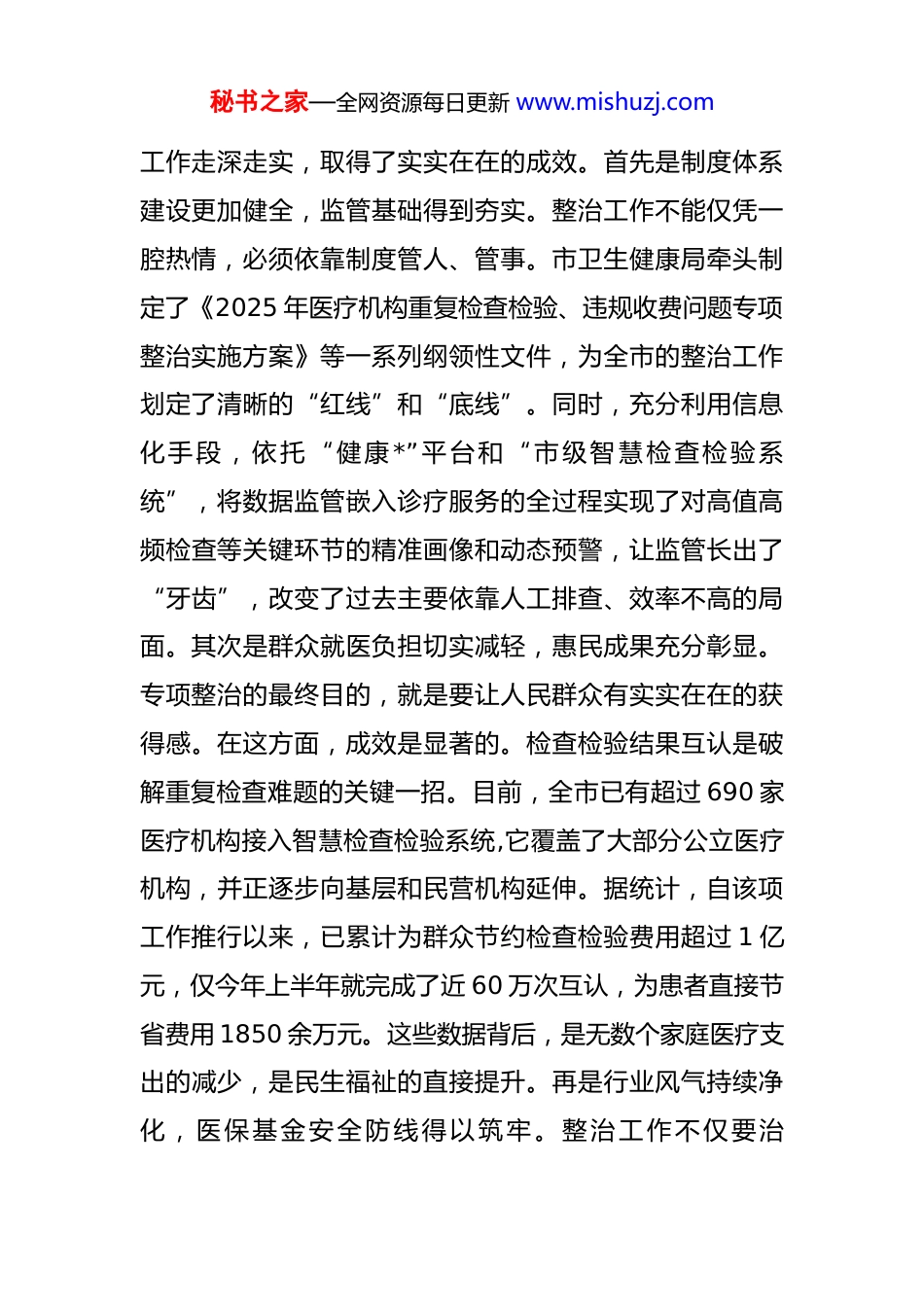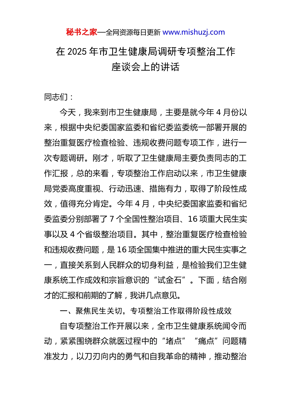 秘书之家—全网资源每日更新 www.mishuzj.com在 2025 年市卫生健康局调研专项整治工作座谈会上的讲话 同志们:今天,我来到市卫生健康局,主要是就今年 4 月份以来,根据中央纪委国家监委和省纪委监委统一部署开展的整治重复医疗检查检验、违规收费问题专项工作,进行一次专题调研。刚才,听取了卫生健康局主要负责同志的工作汇报,总的来看,专项整治工作启动以来,市卫生健康局党委高度重视、行动迅速、措施有力,取得了阶段性成效,值得充分肯定。今年 4 月,中央纪委国家监委和省纪委监委分别部署了 7 个全国性整治项目、16 项重大民生实事以及 4 个省级整治项目。其中,整治重复医疗检查检验和违规收费问题,是 16 项全国集中推进的重大民生实事之一,直接关系到人民群众的切身利益,是检验我们卫生健康系统工作成效和宗旨意识的“试金石”。下面,结合刚才的汇报和前期的了解,我讲几点意见。一、聚焦民生关切,专项整治工作取得阶段性成效自专项整治工作开展以来,全市卫生健康系统闻令而动,紧紧围绕群众就医过程中的“堵点”“痛点”问题精准发力,以刀刃向内的勇气和自我革命的精神,推动整治秘书之家—全网资源每日更新 www.mishuzj.com工作走深走实,取得了实实在在的成效。首先是制度体系建设更加健全,监管基础得到夯实。整治工作不能仅凭一腔热情,必须依靠制度管人、管事。市卫生健康局牵头制定了《2025 年医疗机构重复检查检验、违规收费问题专项整治实施方案》等一系列纲领性文件,为全市的整治工作划定了清晰的“红线”和“底线”。同时,充分利用信息化手段,依托“健康 *”平台和“市级智慧检查检验系统”,将数据监管嵌入诊疗服务的全过程实现了对高值高频检查等关键环节的精准画像和动态预警,让监管长出了“牙齿”,改变了过去主要依靠人工排查、效率不高的局面。其次是群众就医负担切实减轻,惠民成果充分彰显。专项整治的最终目的,就是要让人民群众有实实在在的获得感。在这方面,成效是显著的。检查检验结果互认是破解重复检查难题的关键一招。目前,全市已有超过 690 家医疗机构接入智慧检查检验系统,它覆盖了大部分公立医疗机构,并正逐步向基层和民营机构延伸。据统计,自该项工作推行以来,已累计为群众节约检查检验费用超过 1 亿元,仅今年上半年就完成了近 60 万次互认,为患者直接节省费用 1850 余万元。这些数据背后,是无数个家庭医疗支出的减少,是民生福祉的直接提升。再是行业风气持续净化,医保基金安全防线得以筑牢。整治工作不仅要治秘书之家—全网资源每日更新 www.mishuzj.com“乱”,更要防“骗”。通过与医保、市场监管等部门的协同作战,全市对欺诈骗保、违规收费等行为保持了高压态势。今年以来,全市纪检监察机关已追回医保基金 6350余万元查处了一批违规医疗机构,惩治了一批违法违规人员,形成了强大的震慑效应。通过强化行风建设,聘请社会监督员,畅通投诉举报渠道,医疗服务相关的投诉量呈现明显下降趋势,医患关系更加和谐,行业的整体形象得到了提升。二、坚持问题导向,清醒认识整治工作的长期性与艰巨性在肯定成绩的同时,也必须清醒地认识到,重复检查、违规收费等问题成因复杂,具有顽固性和反复性,整治工作绝非一日之功。当前,一些深层次的矛盾和问题依然存在,需要我们持续用力、久久为功。一是整治工作的平衡性有待加强。从调研情况看,大型三甲医院在落实检查检验结果互认、规范收费行为方面,由于管理体系健全、信息化水平高,整体进展较快。但部分基层医疗机构、民营医院可能还存在认识不到位、执行有偏差、技术支撑不足等问题,导致整治工作在不同层级、不同性质的医疗机构之间存在“温差”,政策落地的“最后一公里”仍需着力打通。二是治本的长效机制仍需完善。当前的整秘书之家—全网资源每日更新 www.mishuzj.com治成果,更多是通过高压严管的集中行动取得的。如何将这些行之有效的措施,固化为长期坚持的制度规范,防止问题在风头过后反弹回潮,是下一步需要深入思考和解决的关键问题。例如,医疗机构内部的绩效考核机制、薪酬分配体系是否与规范诊疗行为真正挂钩,能否...