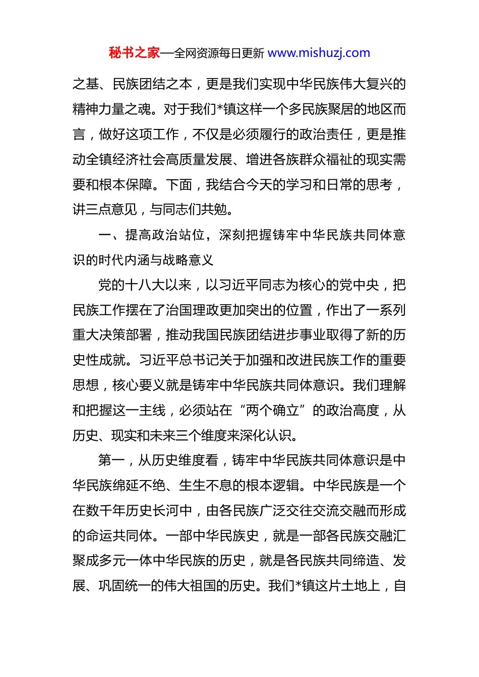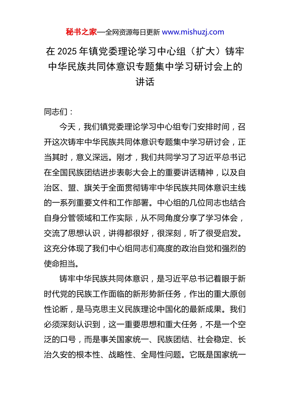 秘书之家—全网资源每日更新 www.mishuzj.com在 2025 年镇党委理论学习中心组(扩大)铸牢中华民族共同体意识专题集中学习研讨会上的讲话 同志们:今天,我们镇党委理论学习中心组专门安排时间,召开这次铸牢中华民族共同体意识专题集中学习研讨会,正当其时,意义深远。刚才,我们共同学习了习近平总书记在全国民族团结进步表彰大会上的重要讲话精神,以及自治区、盟、旗关于全面贯彻铸牢中华民族共同体意识主线的一系列重要文件和工作部署。中心组的几位同志也结合自身分管领域和工作实际,从不同角度分享了学习体会,交流了思想认识,讲得都很好,很深刻,听了很受启发。这充分体现了我们中心组同志们高度的政治自觉和强烈的使命担当。铸牢中华民族共同体意识,是习近平总书记着眼于新时代党的民族工作面临的新形势新任务,作出的重大原创性论断,是马克思主义民族理论中国化的最新成果。我们必须深刻认识到,这一重要思想和重大任务,不是一个空泛的口号,而是事关国家统一、民族团结、社会稳定、长治久安的根本性、战略性、全局性问题。它既是国家统一秘书之家—全网资源每日更新 www.mishuzj.com之基、民族团结之本,更是我们实现中华民族伟大复兴的精神力量之魂。对于我们*镇这样一个多民族聚居的地区而言,做好这项工作,不仅是必须履行的政治责任,更是推动全镇经济社会高质量发展、增进各族群众福祉的现实需要和根本保障。下面,我结合今天的学习和日常的思考,讲三点意见,与同志们共勉。一、提高政治站位,深刻把握铸牢中华民族共同体意识的时代内涵与战略意义党的十八大以来,以习近平同志为核心的党中央,把民族工作摆在了治国理政更加突出的位置,作出了一系列重大决策部署,推动我国民族团结进步事业取得了新的历史性成就。习近平总书记关于加强和改进民族工作的重要思想,核心要义就是铸牢中华民族共同体意识。我们理解和把握这一主线,必须站在“两个确立”的政治高度,从历史、现实和未来三个维度来深化认识。第一,从历史维度看,铸牢中华民族共同体意识是中华民族绵延不绝、生生不息的根本逻辑。中华民族是一个在数千年历史长河中,由各民族广泛交往交流交融而形成的命运共同体。一部中华民族史,就是一部各民族交融汇聚成多元一体中华民族的历史,就是各民族共同缔造、发展、巩固统一的伟大祖国的历史。我们*镇这片土地上,自秘书之家—全网资源每日更新 www.mishuzj.com古以来就是多民族繁衍生息的地方,各族人民共同开发了这片沃土,共同抵御了外来侵略,共同创造了灿烂的文化。这种“你中有我、我中有你,谁也离不开谁”的民族关系,是历史的必然,也是我们最宝贵的财富。忘记历史就意味着背叛。我们抓这项工作,就是要引导全镇各族干部群众深刻认识到,我们共同的中华民族身份是第一位的,我们的中华文化认同是根基性的,从而不断增强对伟大祖国、中华民族、中华文化、中国共产党、中国特色社会主义的认同。第二,从现实维度看,铸牢中华民族共同体意识是应对风险挑战、维护国家安全的迫切需要。当前,世界百年未有之大变局加速演进,国内外形势复杂严峻。一些外部势力亡我之心不死,千方百计利用民族问题、宗教问题对我国进行渗透、颠覆和破坏。我们必须保持清醒的头脑,深刻认识到民族团结是我国各族人民的生命线,中华民族共同体意识是维护国家统一和民族团结的思想长城。我们今天学习的《关于全面贯彻铸牢中华民族共同体意识主线的若干措施》,就是要我们把思想和行动统一到中央的决策部署上来,把维护国家统一和民族团结作为各民族最高利益,旗帜鲜明地反对一切破坏民族团结和制造民族分裂的言行,确保我们*镇在任何风浪考验面前都坚如磐石。秘书之家—全网资源每日更新 www.mishuzj.com第三,从未来维度看,铸牢中华民族共同体意识是实现中华民族伟大复兴的强大动力。全面建设社会主义现代化国家,实现中华民族伟大复兴的中国梦,需要全国各族人民心往一处想、劲往一处使,共同团结奋斗。人心是最大的政治,共识是奋进的动力。只有铸牢中华民族共同体意识,才能有效凝聚起 56 个民族、14 亿多中国人民的智慧和力量,形成同心共圆中国梦...