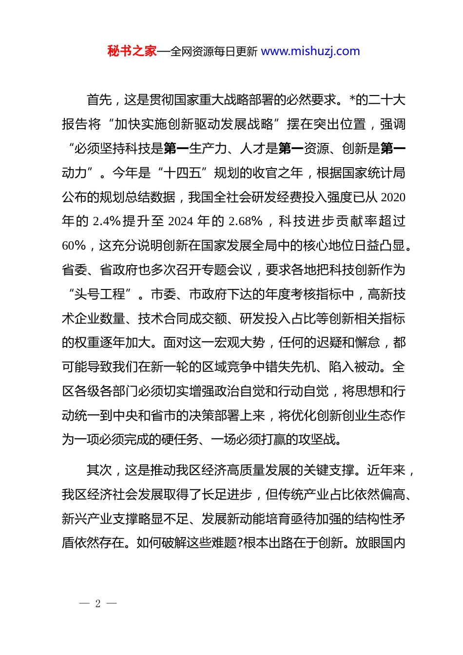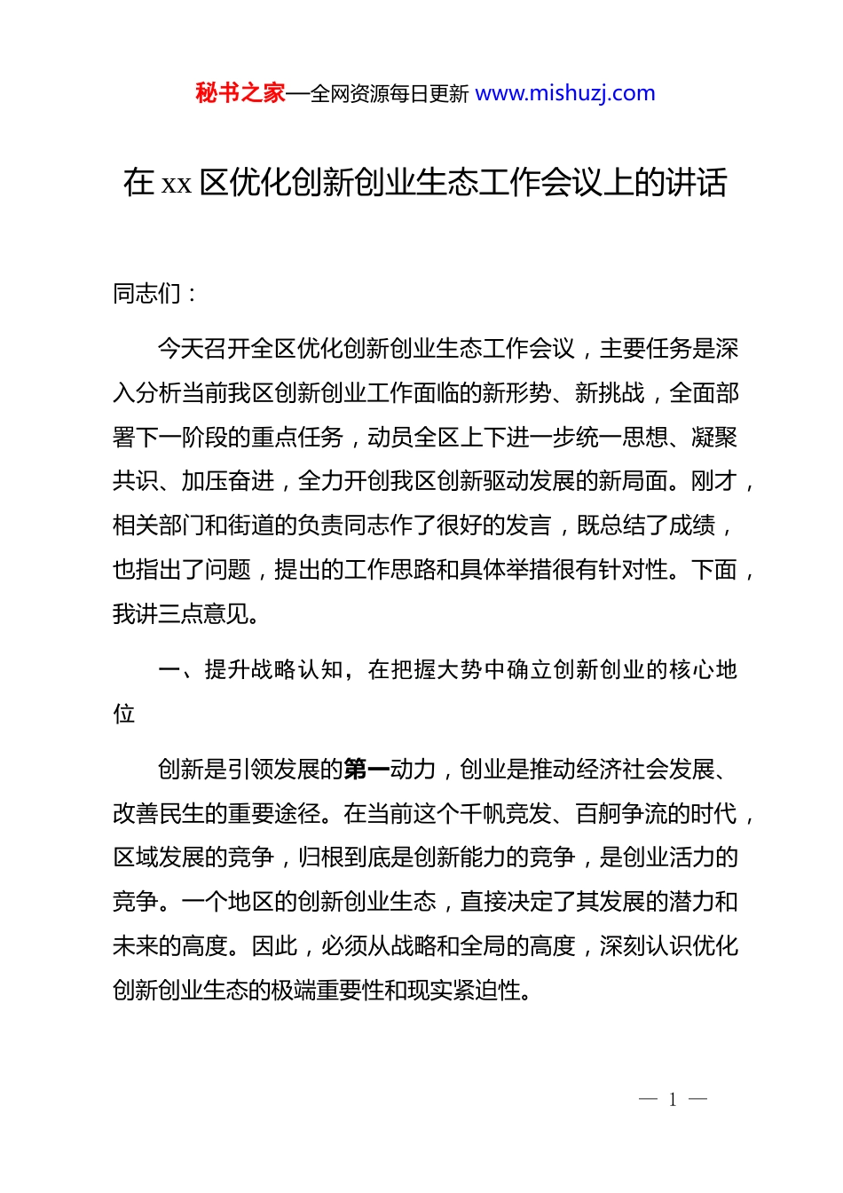 秘书之家—全网资源每日更新 www.mishuzj.com在 xx 区优化创新创业生态工作会议上的讲话同志们:今天召开全区优化创新创业生态工作会议,主要任务是深入分析当前我区创新创业工作面临的新形势、新挑战,全面部署下一阶段的重点任务,动员全区上下进一步统一思想、凝聚共识、加压奋进,全力开创我区创新驱动发展的新局面。刚才,相关部门和街道的负责同志作了很好的发言,既总结了成绩,也指出了问题,提出的工作思路和具体举措很有针对性。下面,我讲三点意见。一、提升战略认知,在把握大势中确立创新创业的核心地位创新是引领发展的第一动力,创业是推动经济社会发展、改善民生的重要途径。在当前这个千帆竞发、百舸争流的时代,区域发展的竞争,归根到底是创新能力的竞争,是创业活力的竞争。一个地区的创新创业生态,直接决定了其发展的潜力和未来的高度。因此,必须从战略和全局的高度,深刻认识优化创新创业生态的极端重要性和现实紧迫性。— 1 —秘书之家—全网资源每日更新 www.mishuzj.com首先,这是贯彻国家重大战略部署的必然要求。*的二十大报告将“加快实施创新驱动发展战略”摆在突出位置,强调“必须坚持科技是第一生产力、人才是第一资源、创新是第一动力”。今年是“十四五”规划的收官之年,根据国家统计局公布的规划总结数据,我国全社会研发经费投入强度已从 2020年的 2.4%提升至 2024 年的 2.68%,科技进步贡献率超过60%,这充分说明创新在国家发展全局中的核心地位日益凸显。省委、省政府也多次召开专题会议,要求各地把科技创新作为“头号工程”。市委、市政府下达的年度考核指标中,高新技术企业数量、技术合同成交额、研发投入占比等创新相关指标的权重逐年加大。面对这一宏观大势,任何的迟疑和懈怠,都可能导致我们在新一轮的区域竞争中错失先机、陷入被动。全区各级各部门必须切实增强政治自觉和行动自觉,将思想和行动统一到中央和省市的决策部署上来,将优化创新创业生态作为一项必须完成的硬任务、一场必须打赢的攻坚战。其次,这是推动我区经济高质量发展的关键支撑。近年来,我区经济社会发展取得了长足进步,但传统产业占比依然偏高、新兴产业支撑略显不足、发展新动能培育亟待加强的结构性矛盾依然存在。如何破解这些难题?根本出路在于创新。放眼国内— 2 —秘书之家—全网资源每日更新 www.mishuzj.com外,无论是 xx 等发达经济体,还是国内的 xx、xx 等先进地区,其经济的韧性和活力,无不源于其强大的创新能力和活跃的创业氛围。根据最新的统计数据,德国经济在经历了短暂波动后,于 2025 年第二季度实现了 0.3%的环比增长,其背后正是大量创新型初创企业的稳步涌现和对实体经济的有力支撑。反观我区,今年上半年,全区新增市场主体超过 8000 家,同比增长了9.2%,但其中科技型企业占比仅为 13.5%,低于全市 18%的平均水平。这组数据警示我们,量的增长固然可喜,但质的提升更为关键。必须通过构建一流的创新创业生态,吸引和培育更多掌握核心技术、拥有自主知识产权、具备高成长性的企业,为我区产业转型升级和经济高质量发展注入源源不断的“活水”。最后,这是满足人民群众对美好生活向往的内在需要。创新创业不仅是经济引擎,更是社会活力的重要源泉。它能够创造更高质量的就业岗位,为青年人提供实现梦想的舞台;它能够催生更多新技术、新产品、新业态,不断提升公共服务的效率和质量,丰富人民群众的物质文化生活。例如,智慧医疗、在线教育、共享出行等,都是创新创业带来的深刻社会变革。同时,一个充满创新精神和创业激情的城市,必然是一个开放— 3 —秘书之家—全网资源每日更新 www.mishuzj.com包容、昂扬向上的城市。这种无形的精神力量,是增强区域认同感、凝聚力和吸引力的宝贵财富。因此,抓创新创业,就是抓发展、抓未来,更是抓民生、抓希望。必须将优化创新创业生态作为“一把手”工程,摆在案头、放在心头、抓在手上,以“功成不必在我”的精神境界和“功成必定有我”的历史担当,一任接着一任干,一张蓝图绘到底。二、坚持问题导向,在精准施策中破解创新创业的瓶颈制约肯定成绩的同时,...
