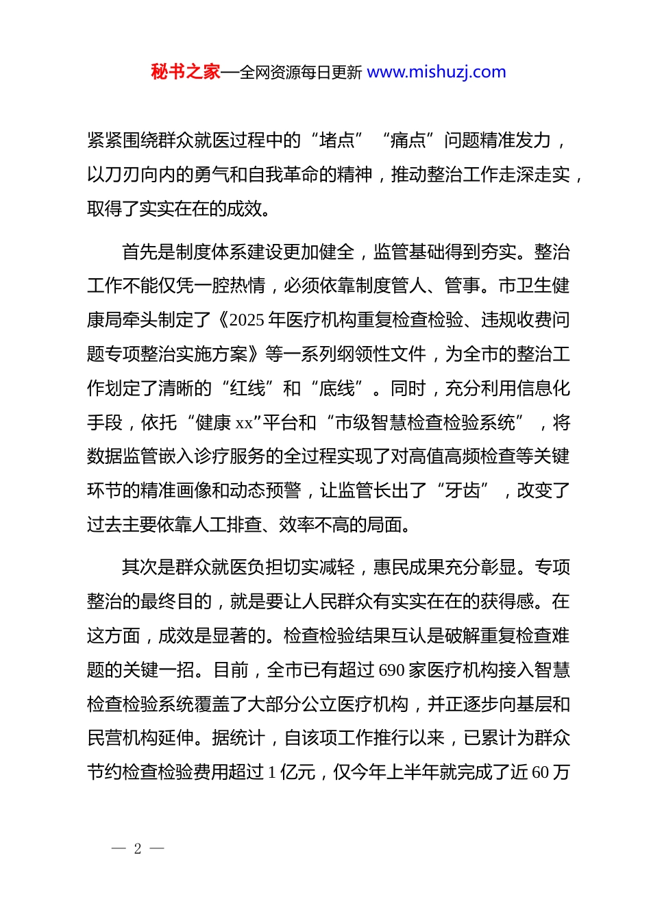 秘书之家—全网资源每日更新 www.mishuzj.com在 xx 市卫生健康局调研专项整治工作座谈会上的讲话同志们:今天,我来到市卫生健康局,主要是就今年 4 月份以来,根据中央纪委国家监委和省纪委监委统一部署开展的整治重复医疗检查检验、违规收费问题专项工作,进行一次专题调研。刚才,听取了卫生健康局主要负责同志的工作汇报,总的来看,专项整治工作启动以来,市卫生健康局*委高度重视、行动迅速、措施有力,取得了阶段性成效,值得充分肯定。今年 4 月,中央纪委国家监委和省纪委监委分别部署了 7个全国性整治项目、16 项重大民生实事以及 4 个省级整治项目。其中,整治重复医疗检查检验和违规收费问题,是 16 项全国集中推进的重大民生实事之一,直接关系到人民群众的切身利益,是检验我们卫生健康系统工作成效和宗旨意识的“试金石”。下面,结合刚才的汇报和前期的了解,我讲几点意见。一、聚焦民生关切,专项整治工作取得阶段性成效自专项整治工作开展以来,全市卫生健康系统闻令而动,— 1 —秘书之家—全网资源每日更新 www.mishuzj.com紧紧围绕群众就医过程中的“堵点”“痛点”问题精准发力,以刀刃向内的勇气和自我革命的精神,推动整治工作走深走实,取得了实实在在的成效。首先是制度体系建设更加健全,监管基础得到夯实。整治工作不能仅凭一腔热情,必须依靠制度管人、管事。市卫生健康局牵头制定了《2025 年医疗机构重复检查检验、违规收费问题专项整治实施方案》等一系列纲领性文件,为全市的整治工作划定了清晰的“红线”和“底线”。同时,充分利用信息化手段,依托“健康 xx”平台和“市级智慧检查检验系统”,将数据监管嵌入诊疗服务的全过程实现了对高值高频检查等关键环节的精准画像和动态预警,让监管长出了“牙齿”,改变了过去主要依靠人工排查、效率不高的局面。其次是群众就医负担切实减轻,惠民成果充分彰显。专项整治的最终目的,就是要让人民群众有实实在在的获得感。在这方面,成效是显著的。检查检验结果互认是破解重复检查难题的关键一招。目前,全市已有超过 690 家医疗机构接入智慧检查检验系统覆盖了大部分公立医疗机构,并正逐步向基层和民营机构延伸。据统计,自该项工作推行以来,已累计为群众节约检查检验费用超过 1 亿元,仅今年上半年就完成了近 60 万— 2 —秘书之家—全网资源每日更新 www.mishuzj.com次互认,为患者直接节省费用 1850 余万元。这些数据背后,是无数个家庭医疗支出的减少,是民生福祉的直接提升。再者是行业风气持续净化,医保基金安全防线得以筑牢。整治工作不仅要治“乱”,更要防“骗”。通过与医保、市场监管等部门的协同作战,全市对欺诈骗保、违规收费等行为保持了高压态斯。今年以来,全市纪检监察机关已追回医保基金6350 余万元查处了一批违规医疗机构,惩治了一批违法违规人员,形成了强大的震慑效应。通过强化行风建设,聘请社会监督员,畅通投诉举报渠道,医疗服务相关的投诉量呈现明显下降趋势,医患关系更加和谐,行业的整体形象得到了提升。二、坚持问题导向,清醒认识整治工作的长期性与艰巨性在肯定成绩的同时,也必须清醒地认识到,重复检查、违规收费等问题成因复杂,具有顽固性和反复性,整治工作绝非一日之功。当前,一些深层次的矛盾和问题依然存在,需要我们持续用力、久久为功。一是整治工作的平衡性有待加强。从调研情况看,大型三甲医院在落实检查检验结果互认、规范收费行为方面,由于管理体系健全、信息化水平高,整体进展较快。但部分基层医疗— 3 —秘书之家—全网资源每日更新 www.mishuzj.com机构、民营医院可能还存在认识不到位、执行有偏差、技术支撑不足等问题,导致整治工作在不同层级、不同性质的医疗机构之间存在“温差”,政策落地的“最后一公里”仍需着力打通。二是治本的长效机制仍需完善。当前的整治成果,更多是通过高压严管的集中行动取得的。如何将这些行之有效的措施,固化为长期坚持的制度规范,防止问题在风头过后反弹回潮,是下一步需要深入思考和解决的关键问题。例如,医疗机构内部的绩效考核机制、薪酬分配体系是否与规范诊疗...