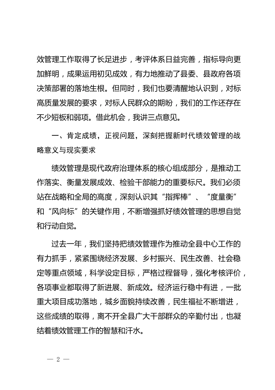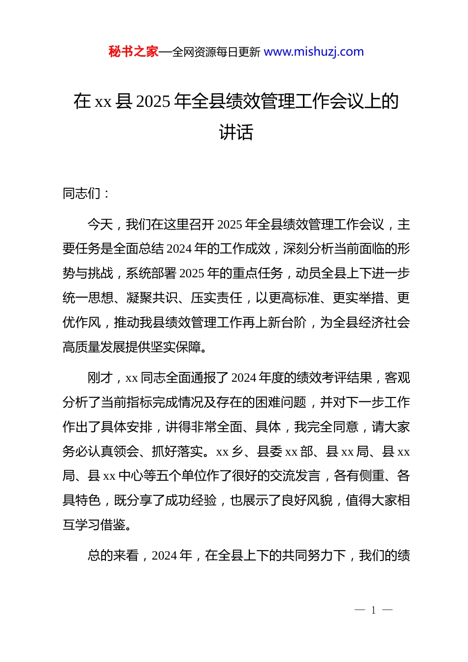 秘书之家—全网资源每日更新 www.mishuzj.com在 xx 县 2025 年全县绩效管理工作会议上的讲话同志们:今天,我们在这里召开 2025 年全县绩效管理工作会议,主要任务是全面总结 2024 年的工作成效,深刻分析当前面临的形势与挑战,系统部署 2025 年的重点任务,动员全县上下进一步统一思想、凝聚共识、压实责任,以更高标准、更实举措、更优作风,推动我县绩效管理工作再上新台阶,为全县经济社会高质量发展提供坚实保障。刚才,xx 同志全面通报了 2024 年度的绩效考评结果,客观分析了当前指标完成情况及存在的困难问题,并对下一步工作作出了具体安排,讲得非常全面、具体,我完全同意,请大家务必认真领会、抓好落实。xx 乡、县委 xx 部、县 xx 局、县 xx局、县 xx 中心等五个单位作了很好的交流发言,各有侧重、各具特色,既分享了成功经验,也展示了良好风貌,值得大家相互学习借鉴。总的来看,2024 年,在全县上下的共同努力下,我们的绩— 1 —效管理工作取得了长足进步,考评体系日益完善,指标导向更加鲜明,成果运用初见成效,有力地推动了县委、县政府各项决策部署的落地生根。但同时,我们也要清醒地认识到,对标高质量发展的要求,对标人民群众的期盼,我们的工作还存在不少短板和弱项。借此机会,我讲三点意见。一、肯定成绩,正视问题,深刻把握新时代绩效管理的战略意义与现实要求绩效管理是现代政府治理体系的核心组成部分,是推动工作落实、衡量发展成效、检验干部能力的重要标尺。我们必须站在战略和全局的高度,深刻认识其“指挥棒”、“度量衡”和“风向标”的关键作用,不断增强抓好绩效管理的思想自觉和行动自觉。过去一年,我们坚持把绩效管理作为推动全县中心工作的有力抓手,紧紧围绕经济发展、乡村振兴、民生改善、社会稳定等重点领域,科学设定目标,严格过程督导,强化考核评价,各项事业都取得了新进展、新成效。经济运行稳中有进,一批重大项目成功落地,城乡面貌持续改善,民生福祉不断增进,这些成绩的取得,离不开全县广大干部群众的辛勤付出,也凝结着绩效管理工作的智慧和汗水。— 2 —秘书之家—全网资源每日更新 www.mishuzj.com在肯定成绩的同时,我们更要坚持问题导向,敢于刀刃向内,深刻检视 2024 年工作中暴露出的短板弱项。这些问题不仅影响了去年的考评成绩,更制约着我们未来的发展步伐,必须下大力气加以解决。第一,思想认识的“温差”依然存在。在部分单位和干部中,对绩效管理的认识还停留在“为考核而考核”的浅层阶段。有的认为绩效管理是业务部门之外的“额外负担”,是被动应付、消极对待;有的将其等同于简单的年终总结和材料报送,缺乏全过程管理的理念;还有的甚至存在畏难情绪和侥幸心理。正如一些分析指出的,部分单位缺乏推动预算绩效管理工作的内生动力,主体责任认识不清、落实不力,这种思想上的偏差,导致工作的主动性、创造性大打折扣,是制约绩效管理提质增效的首要障碍。第二,指标体系的“精度”仍需提升。科学的指标体系是绩效管理的基石。当前,我们的指标设置还存在一些问题。一是“上下一般粗”,未能充分体现不同乡镇、不同部门的差异化特点和核心职能,导致“一把尺子量到底”,难以精准评价其独特贡献。二是“重数轻质”,一些指标过于偏重量化产出,比如完成了多少次宣传活动、采集了多少条信息,但对于这些— 3 —工作的实际效果、群众满意度等质量效益层面的衡量有所欠缺。三是“脱节现象”,部分指标与年度重点工作、重大项目关联度不紧,未能将县委、县政府最关心、人民群众最期盼的事项充分体现出来,导致绩效考核与中心工作“两张皮”。第三,过程管理的“力度”尚显不足。绩效管理是一个完整的闭环系统,重在日常、贵在坚持。然而,我们的一些单位在实际操作中,依然存在“年初定目标、年底算总账”的现象,忽视了过程监控和动态管理。正如一些制度设计所强调的,绩效督查应贯穿年初、每季度、每半年和年终,但我们在日常调度、季度预警、中期评估等方面做得还不够。由于缺乏及时的跟踪问效和策略性调整,导致一些问题直到年终考核时才集中暴露,错失了解决问...