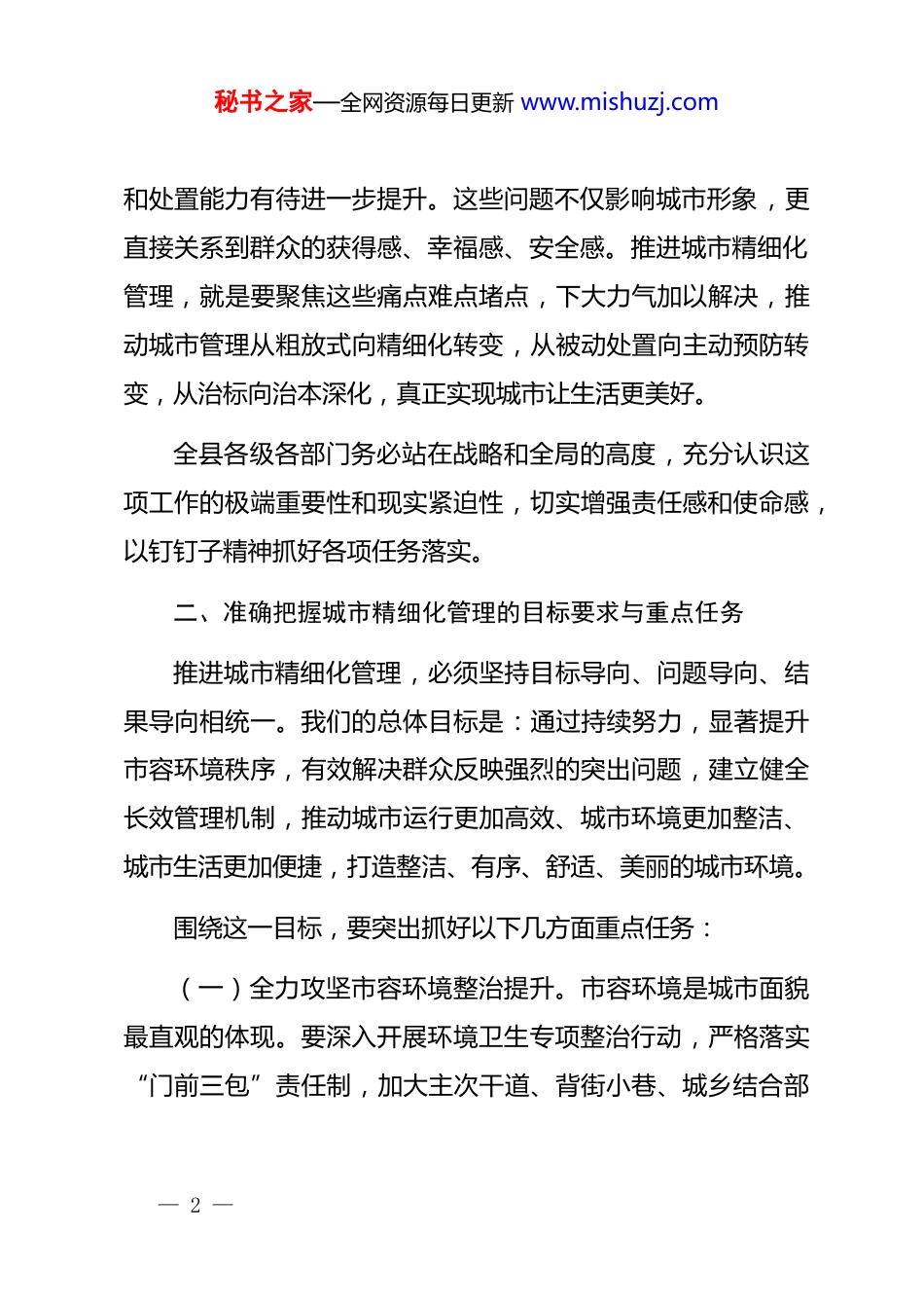 秘书之家—全网资源每日更新 www.mishuzj.com在 xx 县城市精细化管理动员部署会上的讲话同志们:今天我们召开全县城市精细化管理动员部署会议,主要任务是深入分析当前城市管理面临的新形势新要求,全面部署推进城市精细化管理的各项重点任务,动员全县上下进一步统一思想、凝聚共识,以更高标准、更实举措、更严作风,奋力开创我县城市管理工作新局面。下面,我讲几点意见。一、深刻认识推进城市精细化管理的重要意义城市是经济社会发展的重要载体,是人民群众安居乐业的美好家园。推动城市管理向精细化转变,是提升城市治理现代化水平的必然要求,是改善人居环境、增进民生福祉的重要举措,更是推动我县高质量发展、创造高品质生活的内在需要。近年来,我县城市建设取得显著成效,城市框架不断拉大,功能日趋完善,面貌持续改观。但对照高质量发展要求和人民群众日益增长的美好生活需要,城市管理工作中仍然存在一些突出问题和短板。占道经营、车辆乱停、垃圾乱扔等现象仍时有发生,部分区域环境卫生存在死角盲区,公共服务响应效率— 1 —秘书之家—全网资源每日更新 www.mishuzj.com和处置能力有待进一步提升。这些问题不仅影响城市形象,更直接关系到群众的获得感、幸福感、安全感。推进城市精细化管理,就是要聚焦这些痛点难点堵点,下大力气加以解决,推动城市管理从粗放式向精细化转变,从被动处置向主动预防转变,从治标向治本深化,真正实现城市让生活更美好。全县各级各部门务必站在战略和全局的高度,充分认识这项工作的极端重要性和现实紧迫性,切实增强责任感和使命感,以钉钉子精神抓好各项任务落实。二、准确把握城市精细化管理的目标要求与重点任务推进城市精细化管理,必须坚持目标导向、问题导向、结果导向相统一。我们的总体目标是:通过持续努力,显著提升市容环境秩序,有效解决群众反映强烈的突出问题,建立健全长效管理机制,推动城市运行更加高效、城市环境更加整洁、城市生活更加便捷,打造整洁、有序、舒适、美丽的城市环境。围绕这一目标,要突出抓好以下几方面重点任务:(一)全力攻坚市容环境整治提升。市容环境是城市面貌最直观的体现。要深入开展环境卫生专项整治行动,严格落实“门前三包”责任制,加大主次干道、背街小巷、城乡结合部— 2 —秘书之家—全网资源每日更新 www.mishuzj.com等重点区域的清扫保洁力度和频次,确保垃圾日产日清,无暴露积存。要加强环卫设施设备的维护更新,提升作业机械化、智能化水平。要聚焦乱张贴、乱涂写、乱悬挂等“城市牛皮癣”问题,加强清理整治和源头管控。要大力推进垃圾分类工作,加强宣传引导,完善分类投放、收集、运输、处理体系,培养居民良好习惯。(二)大力规范交通秩序与停车管理。交通秩序是城市运行效率的关键。要持续开展机动车、非机动车乱停乱放专项整治,科学施划、增补停车泊位,探索利用闲置地块建设临时停车场,最大限度满足停车需求。要加强重点路段、重点时段交通疏导,严查违法停车行为。要优化共享单车投放和管理,规范停放秩序。要完善交通标志标线等设施,保障行人、车辆通行安全顺畅。(三)严格治理市场经营秩序。占道经营、流动摊贩等问题既影响市容,也阻碍交通。要坚持疏堵结合、标本兼治,合理划定、规范管理便民经营区域,引导流动商贩入场入市经营。要加强对临街商铺出店经营行为的监管,坚决取缔主次干道、学校周边、广场公园等重点区域的违规占道经营现象。要规范早市、夜市管理,明确经营时间、区域和卫生要求,做到活而— 3 —秘书之家—全网资源每日更新 www.mishuzj.com不乱、便民不扰民。(四)提质增效公共服务与热线办理。城市管理的温度体现在对群众诉求的响应速度和解决效果上。要进一步优化完善12345 政务服务便民热线与网格化管理工作机制的协同联动,强化部门间沟通协作与信息共享,打通数据壁垒。要着力提升疑难复杂工单的研判和处置能力,明确责任主体和办理时限,强化全过程跟踪督办和回访评估,确保群众反映的合理诉求有人办、办得快、能办好,真正做到“事事有回音、件件有着落”。(五)持续推进基础设施微更新微改造。精细化管理体现...