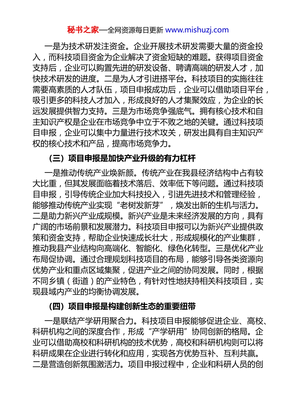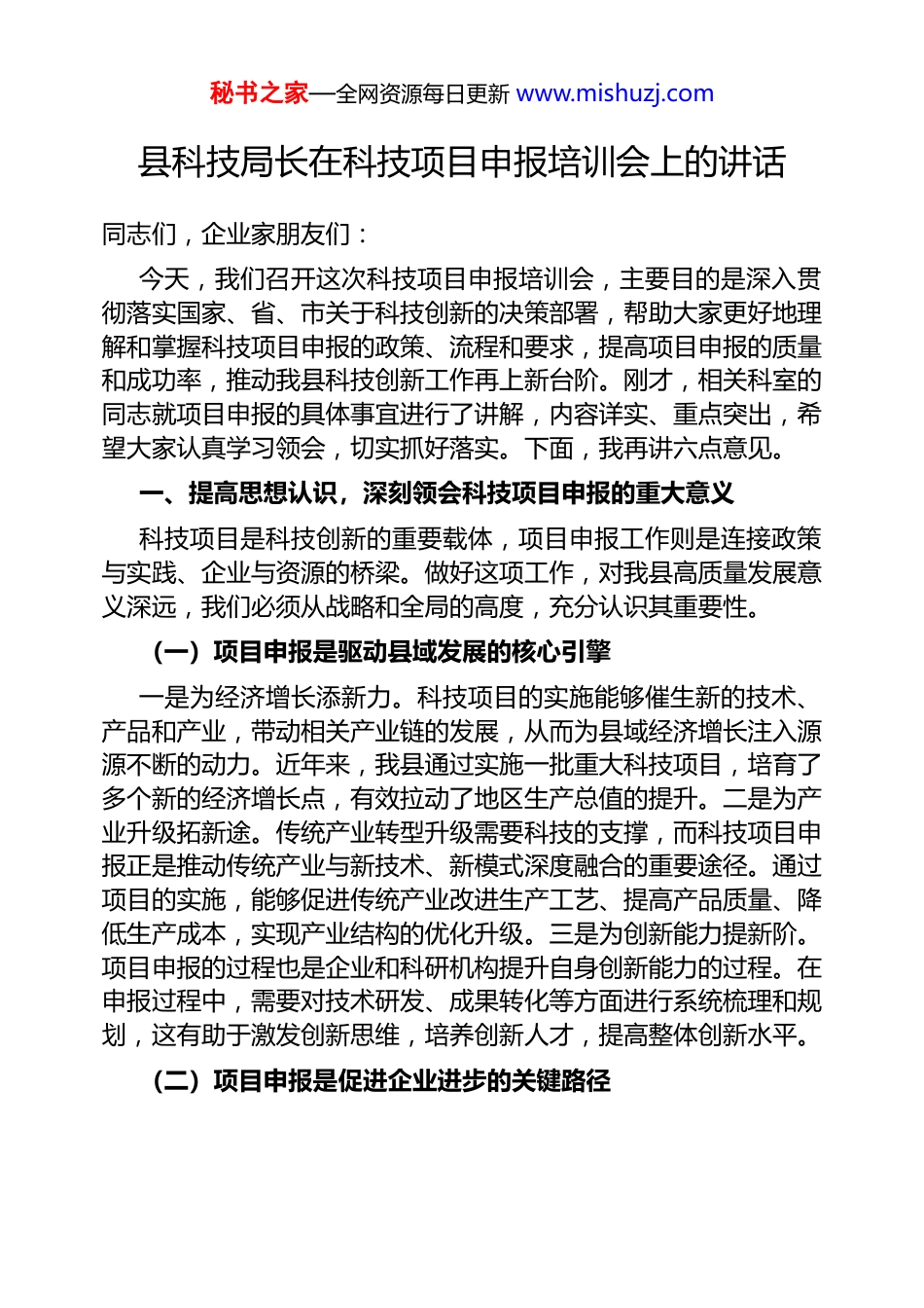 秘书之家—全网资源每日更新 www.mishuzj.com县科技局长在科技项目申报培训会上的讲话同志们,企业家朋友们:今天,我们召开这次科技项目申报培训会,主要目的是深入贯彻落实国家、省、市关于科技创新的决策部署,帮助大家更好地理解和掌握科技项目申报的政策、流程和要求,提高项目申报的质量和成功率,推动我县科技创新工作再上新台阶。刚才,相关科室的同志就项目申报的具体事宜进行了讲解,内容详实、重点突出,希望大家认真学习领会,切实抓好落实。下面,我再讲六点意见。一、提高思想认识,深刻领会科技项目申报的重大意义科技项目是科技创新的重要载体,项目申报工作则是连接政策与实践、企业与资源的桥梁。做好这项工作,对我县高质量发展意义深远,我们必须从战略和全局的高度,充分认识其重要性。(一)项目申报是驱动县域发展的核心引擎一是为经济增长添新力。科技项目的实施能够催生新的技术、产品和产业,带动相关产业链的发展,从而为县域经济增长注入源源不断的动力。近年来,我县通过实施一批重大科技项目,培育了多个新的经济增长点,有效拉动了地区生产总值的提升。二是为产业升级拓新途。传统产业转型升级需要科技的支撑,而科技项目申报正是推动传统产业与新技术、新模式深度融合的重要途径。通过项目的实施,能够促进传统产业改进生产工艺、提高产品质量、降低生产成本,实现产业结构的优化升级。三是为创新能力提新阶。项目申报的过程也是企业和科研机构提升自身创新能力的过程。在申报过程中,需要对技术研发、成果转化等方面进行系统梳理和规划,这有助于激发创新思维,培养创新人才,提高整体创新水平。(二)项目申报是促进企业进步的关键路径秘书之家—全网资源每日更新 www.mishuzj.com一是为技术研发注资金。企业开展技术研发需要大量的资金投入,而科技项目资金为企业解决了资金短缺的难题。获得项目资金支持后,企业可以购置先进的研发设备、聘请高端的研发人才,加快技术研发的进度。二是为人才引进搭平台。科技项目的实施往往需要高素质的人才队伍,项目申报成功后,企业可以借助项目平台,吸引更多的科技人才加入,形成良好的人才集聚效应,为企业的长远发展提供智力支持。三是为市场竞争强底气。拥有核心技术和自主知识产权是企业在市场竞争中立于不败之地的关键。通过科技项目申报,企业可以集中力量进行技术攻关,研发出具有自主知识产权的核心技术和产品,提高市场竞争力。(三)项目申报是加快产业升级的有力杠杆一是推动传统产业焕新颜。传统产业在我县经济结构中占有较大比重,但其发展面临着技术落后、效率低下等问题。通过科技项目申报,引导传统企业加大科技投入,引进先进技术和管理经验,能够推动传统产业实现“老树发新芽”,焕发出新的生机与活力。二是助力新兴产业成规模。新兴产业是未来经济发展的方向,具有广阔的市场前景和发展潜力。科技项目申报可以为新兴产业提供政策和资金支持,帮助企业快速成长壮大,形成规模化的产业集群,推动我县产业结构向高端化、智能化、绿色化转型。三是优化产业布局促协调。通过合理规划科技项目的布局,能够引导各类资源向优势产业和重点区域集聚,促进产业之间的协同发展。同时,根据不同乡镇(街道)的产业特色,有针对性地扶持相关科技项目,实现县域内产业的均衡协调发展。(四)项目申报是构建创新生态的重要纽带一是联结产学研用聚合力。科技项目申报能够促进企业、高校、科研机构之间的深度合作,形成“产学研用”协同创新的格局。企业可以借助高校和科研机构的技术优势,高校和科研机构则可以将科研成果在企业进行转化和应用,实现各方优势互补、互利共赢。二是营造创新氛围激活力。项目申报过程中,企业和科研人员的创秘书之家—全网资源每日更新 www.mishuzj.com新热情被充分激发,大家积极投身于技术研发和创新实践中。同时,成功申报项目并取得成果的案例,也会起到示范引领作用,在全县范围内营造崇尚创新、勇于创新的良好氛围。三是整合创新资源提效力。科技项目申报可以对全县的创新资源进行有效整合和优化配置,避免资源的浪费和重复建设。通过项目的实施,将人才、技术...