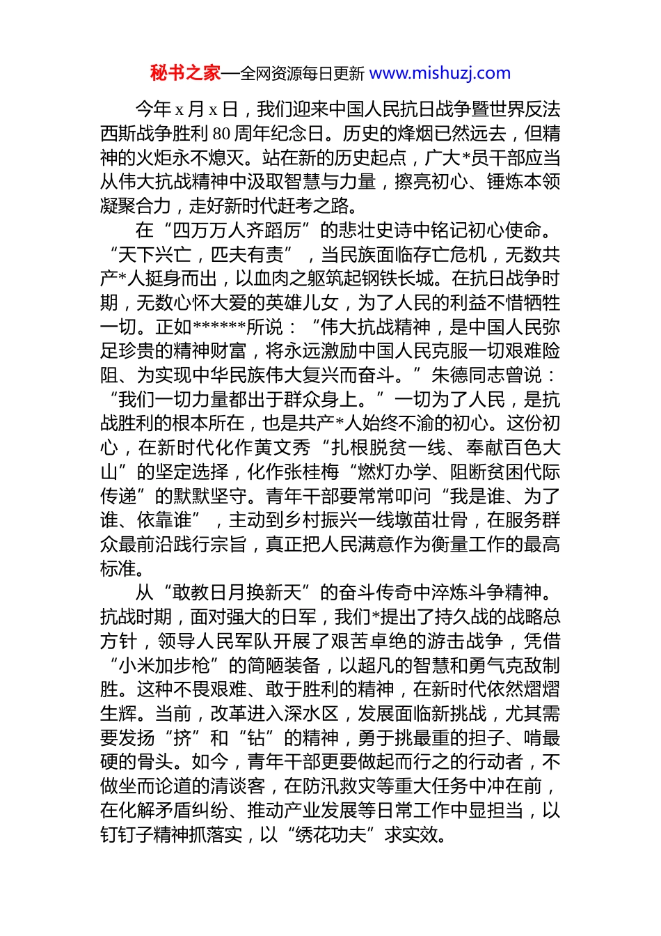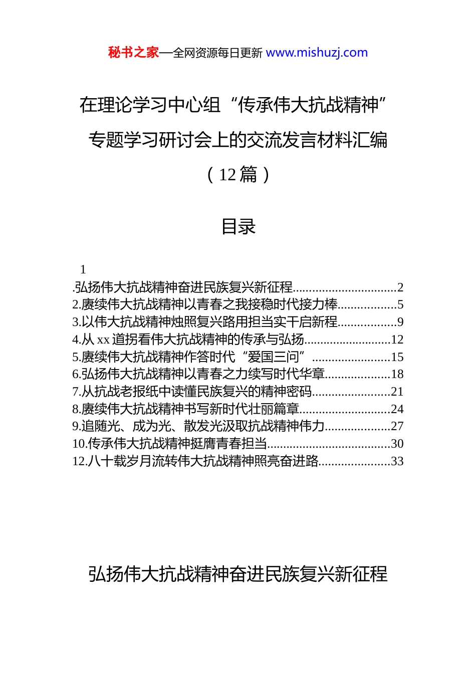 秘书之家—全网资源每日更新 www.mishuzj.com在理论学习中心组“传承伟大抗战精神”专题学习研讨会上的交流发言材料汇编(12 篇)目录1.弘扬伟大抗战精神奋进民族复兴新征程................................22.赓续伟大抗战精神以青春之我接稳时代接力棒..................53.以伟大抗战精神烛照复兴路用担当实干启新程..................94.从 xx 道拐看伟大抗战精神的传承与弘扬...........................125.赓续伟大抗战精神作答时代“爱国三问”........................156.弘扬伟大抗战精神以青春之力续写时代华章....................187.从抗战老报纸中读懂民族复兴的精神密码........................218.赓续伟大抗战精神书写新时代壮丽篇章............................249.追随光、成为光、散发光汲取抗战精神伟力....................2710.传承伟大抗战精神挺膺青春担当......................................3012.八十载岁月流转伟大抗战精神照亮奋进路......................33弘扬伟大抗战精神奋进民族复兴新征程秘书之家—全网资源每日更新 www.mishuzj.com今年 x 月 x 日,我们迎来中国人民抗日战争暨世界反法西斯战争胜利 80 周年纪念日。历史的烽烟已然远去,但精神的火炬永不熄灭。站在新的历史起点,广大*员干部应当从伟大抗战精神中汲取智慧与力量,擦亮初心、锤炼本领凝聚合力,走好新时代赶考之路。在“四万万人齐蹈厉”的悲壮史诗中铭记初心使命。“天下兴亡,匹夫有责”,当民族面临存亡危机,无数共产*人挺身而出,以血肉之躯筑起钢铁长城。在抗日战争时期,无数心怀大爱的英雄儿女,为了人民的利益不惜牺牲一切。正如******所说:“伟大抗战精神,是中国人民弥足珍贵的精神财富,将永远激励中国人民克服一切艰难险阻、为实现中华民族伟大复兴而奋斗。”朱德同志曾说:“我们一切力量都出于群众身上。”一切为了人民,是抗战胜利的根本所在,也是共产*人始终不渝的初心。这份初心,在新时代化作黄文秀“扎根脱贫一线、奉献百色大山”的坚定选择,化作张桂梅“燃灯办学、阻断贫困代际传递”的默默坚守。青年干部要常常叩问“我是谁、为了谁、依靠谁”,主动到乡村振兴一线墩苗壮骨,在服务群众最前沿践行宗旨,真正把人民满意作为衡量工作的最高标准。从“敢教日月换新天”的奋斗传奇中淬炼斗争精神。抗战时期,面对强大的日军,我们*提出了持久战的战略总方针,领导人民军队开展了艰苦卓绝的游击战争,凭借“小米加步枪”的简陋装备,以超凡的智慧和勇气克敌制胜。这种不畏艰难、敢于胜利的精神,在新时代依然熠熠生辉。当前,改革进入深水区,发展面临新挑战,尤其需要发扬“挤”和“钻”的精神,勇于挑最重的担子、啃最硬的骨头。如今,青年干部更要做起而行之的行动者,不做坐而论道的清谈客,在防汛救灾等重大任务中冲在前,在化解矛盾纠纷、推动产业发展等日常工作中显担当,以钉钉子精神抓落实,以“绣花功夫”求实效。秘书之家—全网资源每日更新 www.mishuzj.com于“万众一心加油干”的团结伟力中汇聚磅礴力量。“军民团结如一人,试看天下谁能敌”,抗战胜利深刻揭示了人民是真正的英雄,因为有了人民群众的支持和拥护我们*才能在艰苦的环境中生存和发展,最终取得胜利。***同志指出:“群众是真正的铜墙铁壁。”只有凝聚群众、依靠群众,才能形成无坚不摧的奋进合力。新时代基层工作,无论是推动乡村振兴,还是创新社区治理,都要坚持从群众中来、到群众中去。年轻干部要练好“脚下功夫”多走乡间路,多坐农家凳,学会用百姓语言说家常话、办实在事。要善于发动群众、组织群众,让*的政策变成群众的自觉行动,形成“众人拾柴火焰高”的生动局面,真正把政治优势、组织优势转化为发展优势。历史不忘,精神永存。新时代新征程,我们要弘扬伟大抗战精神,以坚定信念、为民情怀、务实作风,凝聚万众一心、攻坚克难的磅礴力量,为时代立心、为人民立业在民族复兴征途上照亮前路,用奋斗创造更多载入史册的伟业。赓续伟大抗战精神以青春之我接稳时代接力棒2025 年是中国人民抗日战争暨世界反法西斯战争胜利xx 周年。八十载光阴...