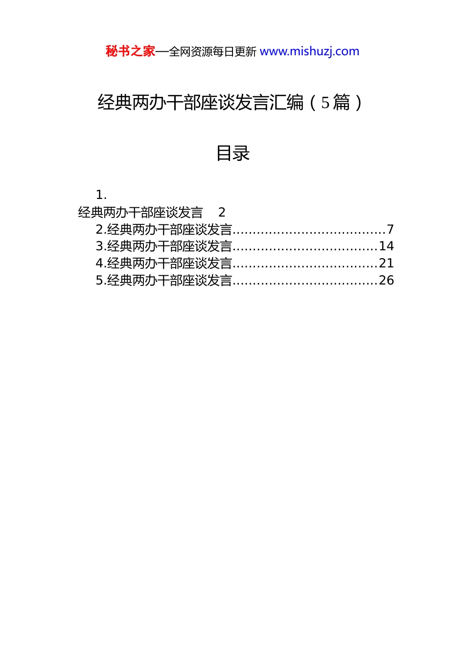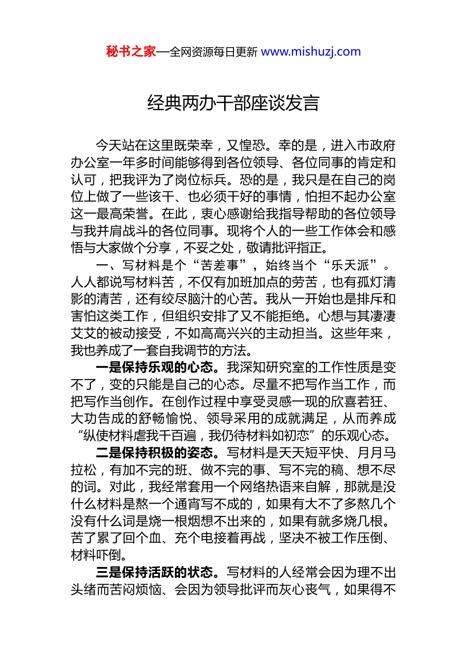 秘书之家—全网资源每日更新 www.mishuzj.com经典两办干部座谈发言汇编(5 篇)目录1.经典两办干部座谈发言22.经典两办干部座谈发言......................................73.经典两办干部座谈发言....................................144.经典两办干部座谈发言....................................215.经典两办干部座谈发言....................................26秘书之家—全网资源每日更新 www.mishuzj.com经典两办干部座谈发言今天站在这里既荣幸,又惶恐。幸的是,进入市政府办公室一年多时间能够得到各位领导、各位同事的肯定和认可,把我评为了岗位标兵。恐的是,我只是在自己的岗位上做了一些该干、也必须干好的事情,怕担不起办公室这一最高荣誉。在此,衷心感谢给我指导帮助的各位领导与我并肩战斗的各位同事。现将个人的一些工作体会和感悟与大家做个分享,不妥之处,敬请批评指正。一、写材料是个“苦差事”,始终当个“乐天派”。人人都说写材料苦,不仅有加班加点的劳苦,也有孤灯清影的清苦,还有绞尽脑汁的心苦。我从一开始也是排斥和害怕这类工作,但组织安排了又不能拒绝。心想与其凄凄艾艾的被动接受,不如高高兴兴的主动担当。这些年来,我也养成了一套自我调节的方法。一是保持乐观的心态。我深知研究室的工作性质是变不了,变的只能是自己的心态。尽量不把写作当工作,而把写作当创作。在创作过程中享受灵感一现的欣喜若狂、大功告成的舒畅愉悦、领导采用的成就满足,从而养成“纵使材料虐我千百遍,我仍待材料如初恋”的乐观心态。二是保持积极的姿态。写材料是天天短平快、月月马拉松,有加不完的班、做不完的事、写不完的稿、想不尽的词。对此,我经常套用一个网络热语来自解,那就是没什么材料是熬一个通宵写不成的,如果有大不了多熬几个没有什么词是烧一根烟想不出来的,如果有就多烧几根。苦了累了回个血、充个电接着再战,坚决不被工作压倒、材料吓倒。三是保持活跃的状态。写材料的人经常会因为理不出头绪而苦闷烦恼、会因为领导批评而灰心丧气,如果得不秘书之家—全网资源每日更新 www.mishuzj.com到调节久而久之就会显得孤寂沉闷。对此,我习惯把团队气氛搞得活跃些,把大家情绪调动起来。俗话说,独乐乐不如众乐乐。不时和研究室的同事们一起谈天说地、胡吃海喝、闲庭信步,调整好心情、调优好状态,真正让研究室充满欢声笑语,做到谈笑间材料自然而成。二、写材料是个“技术活”,始终打磨“金刚钻”。我深知要写好材料需要丰富的知识储备、高远的思维格局扎实的文字功底,尤其是我刚从县上到市上,从党委到政府,急需快速转化角色、转变角度,尽快提升自己能力素质,才能更好适应岗位工作需要。一是勤学厚积力求懂得更广一些。古人云,劳于读书,逸于作文。到研究室后,要求自己每天拿出一定时间学上级文件会议精神、学全市的发展规划、学过去研究室写的文稿材料,看一看其他地方的好文章、全市各行各业的基本情况,凡是好的文章我就收藏,凡是有用的材料我就归集,凡是经典的语句我就摘录,建好“素材库”、丰富“百宝箱”,努力成为秘书长提出的“五懂”干部。二是勤思深悟力求钻得更透一些。现在我感觉与过去最大的不同是,写党委的材料对工作只要懂了就行,而写政府的材料对工作不仅要懂还要精,不仅要站得高还要落得细。比如,有次写一个金融方面的材料,就因为对业务不熟,写了一些不合时宜的内容,被秘书长指出后,才避免了文稿失误。对此,我要求自己平时要不断思考和钻研熟悉各方面的业务,理清各条线的脉络,吃透各领域的情况,确保写的材料更具操作性、落地性。三是勤写常练力求会得更多一些。俗话说,三天不练手就生。所谓的材料能手都是写出来的。以前在县里面的时候,曾有一段时间主要是审材料、改材料,很少动手写材料。刚来的时候明显感觉写起材料来有些费劲。对此,我坚持不管大小材料、难易文章都多动笔写,通过多写多练提高笔力、提升能力。秘书之家—全网资源每日更新 www.mishuzj.com三、写材料是个“服务业”,始终注重“实用性”。写了这些年材料我最大的感受是机关公文材料不是抒发个人意志,而是为了实现...